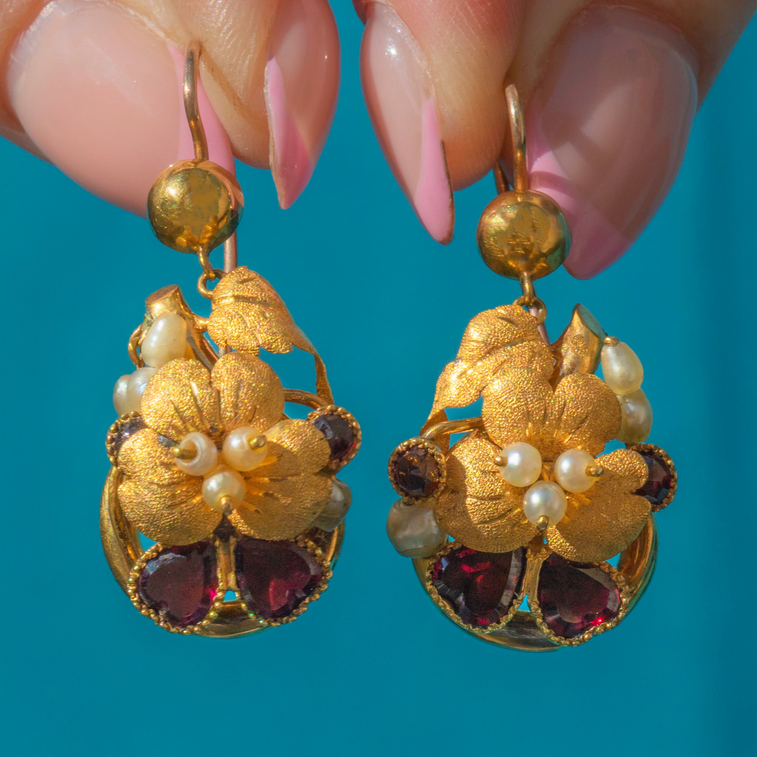 These Georgian 18ct Gold Garnet Pearl pansy earrings are simply exquisite! A feast for the eyes, these antique earrings flaunt the most splendorous pansies we have laid eyes on, with petals formed of stippled 18ct Gold and heart-shaped Garnets embellished with dainty Pearls.