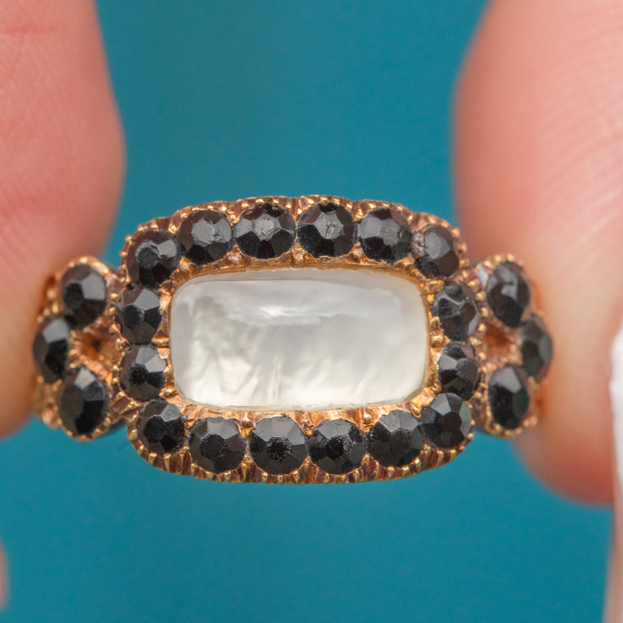 This Georgian 9ct Gold Amethyst Jet mourning ring is simply exquisite. Crafted from 9ct Gold, this ring is almost 200 years old and remains in wonderful condition! The front of the ring features a smooth cabochon-cut Moonstone, adorned by glinting Jet gemstones.