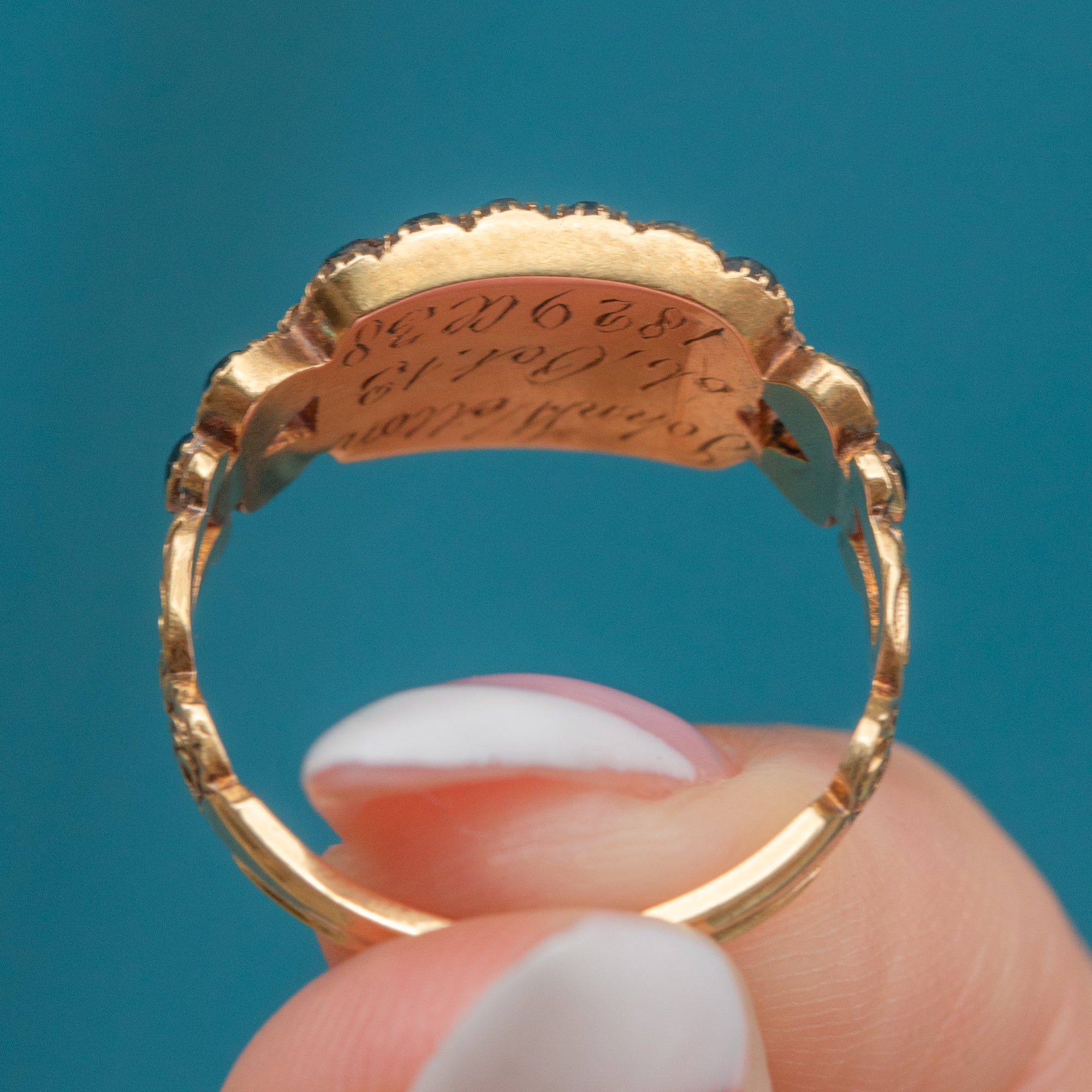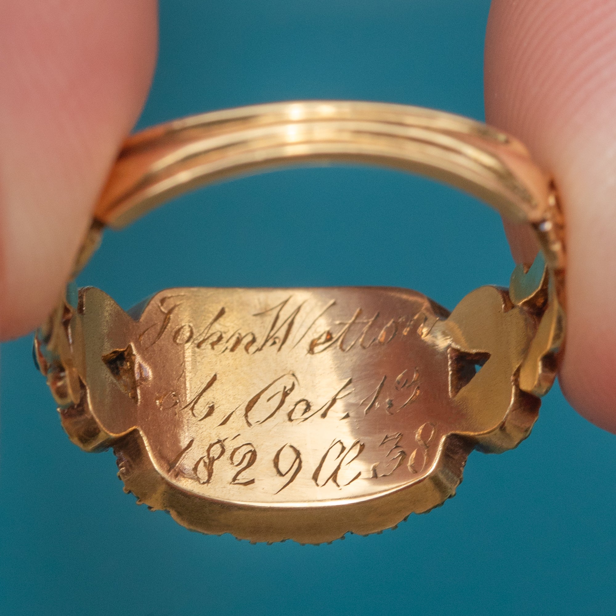 The beauty of this Georgian ring lies in the inscription on the reverse of the gemstone setting, which reads: John Wetton, Ob Oct 13, 1829, aged 38, a beautiful memento. This is a one-of-a-kind piece of mourning jewellery no one else will have in their collection!