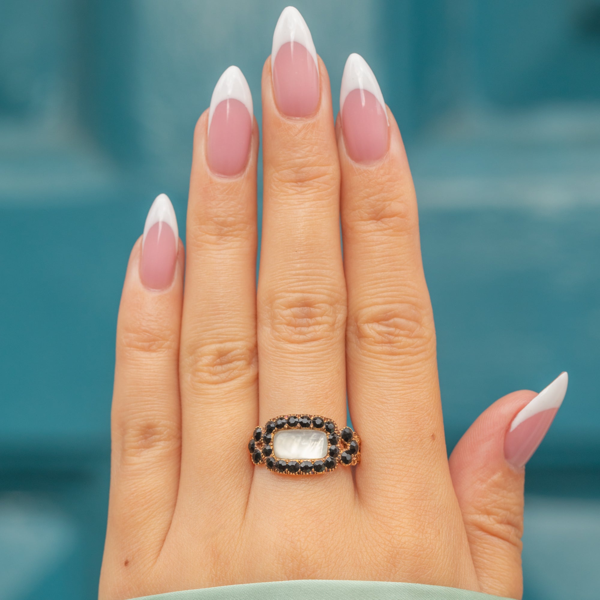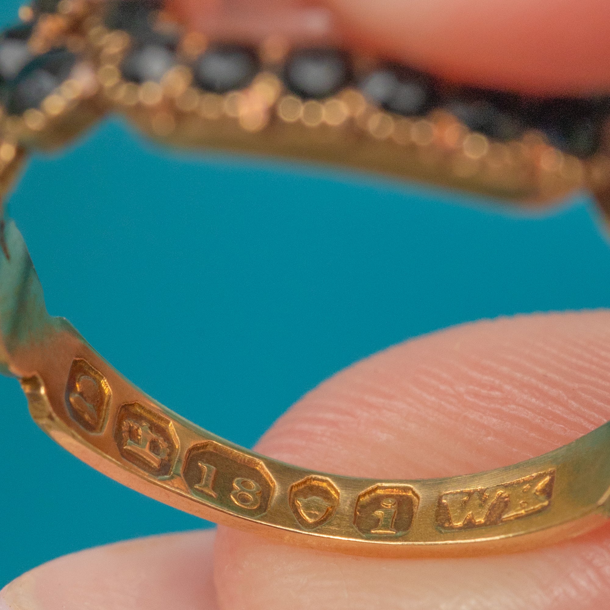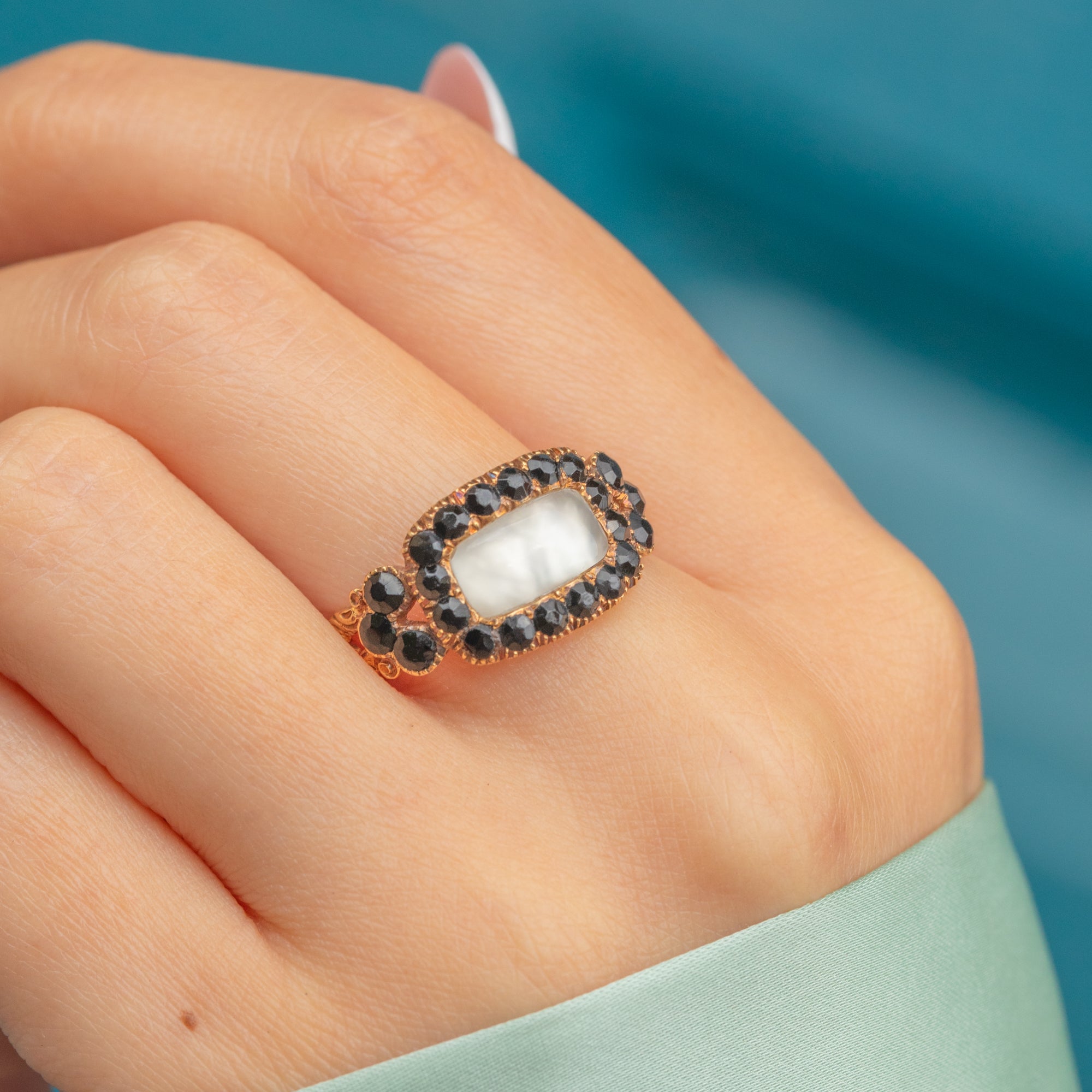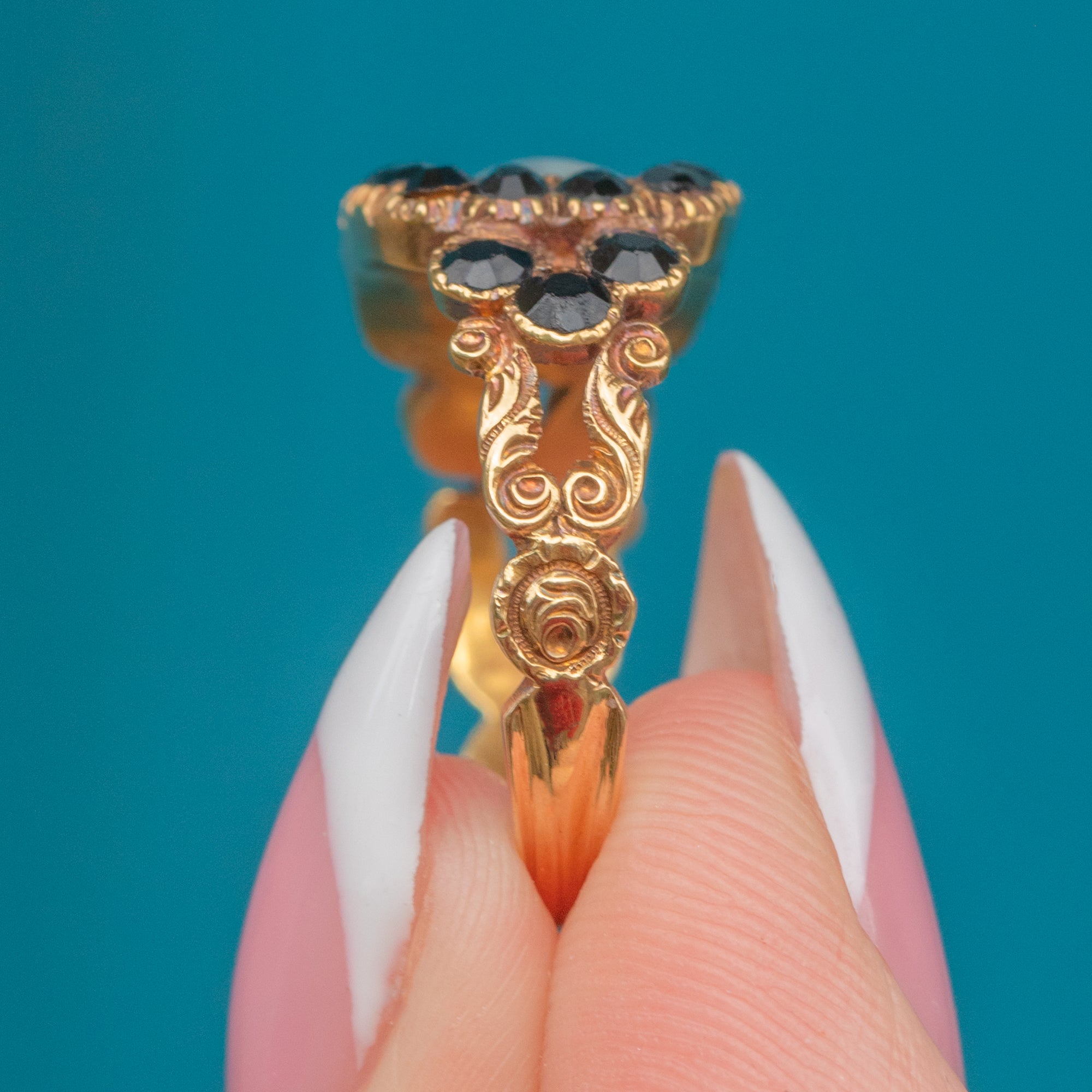 VERY GOOD-EXCELLENT: Given the impressive age of the ring, it has been wonderfully preserved. The Gold is buttery and the band is smooth, providing a comfortable fit. The gemstones are all present and secure, with only mild surface abrasions on the Jet, commensurate with age. The ring has very minimal signs of wear throughout, making this a prime pick for your collection.
