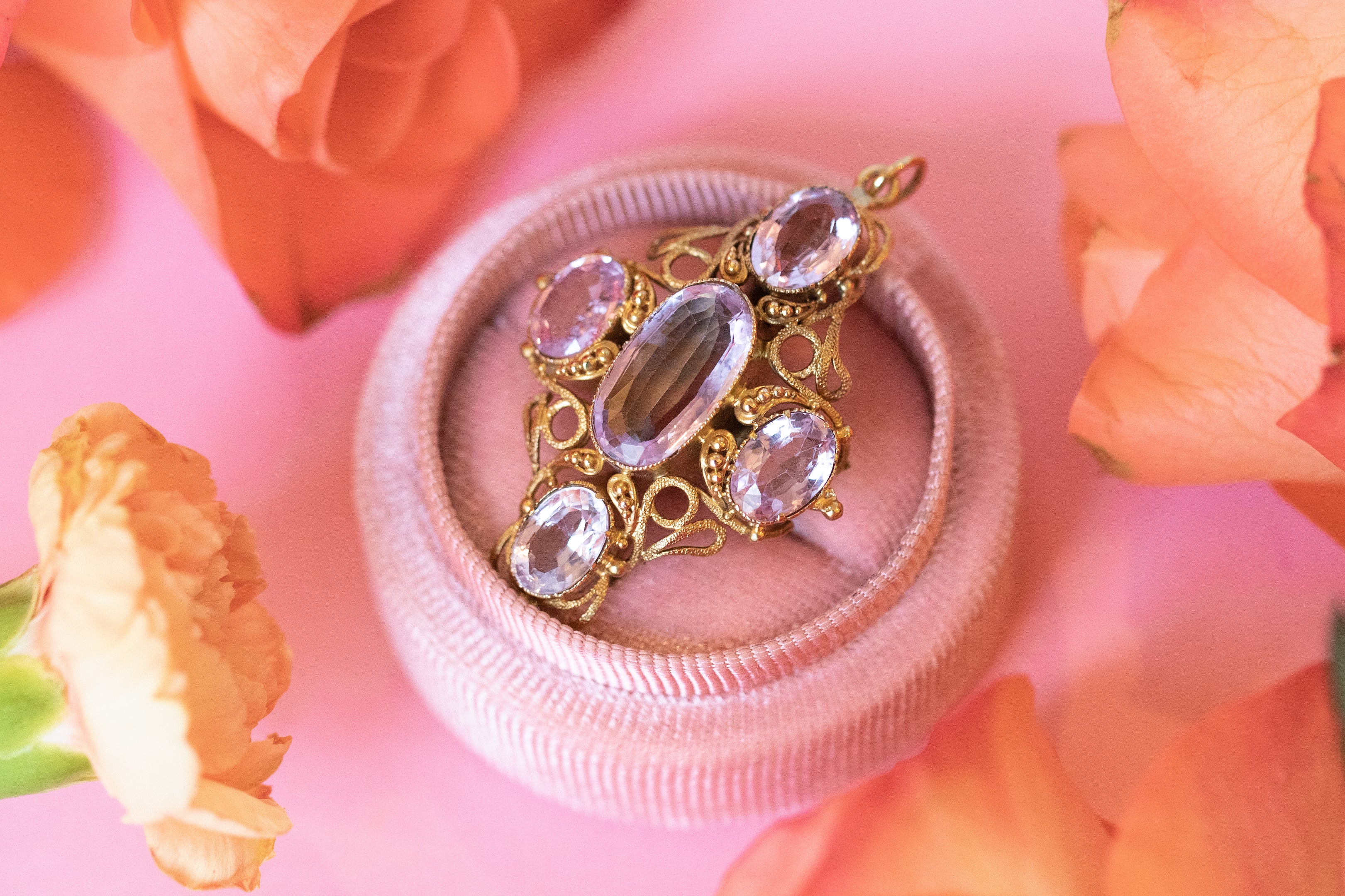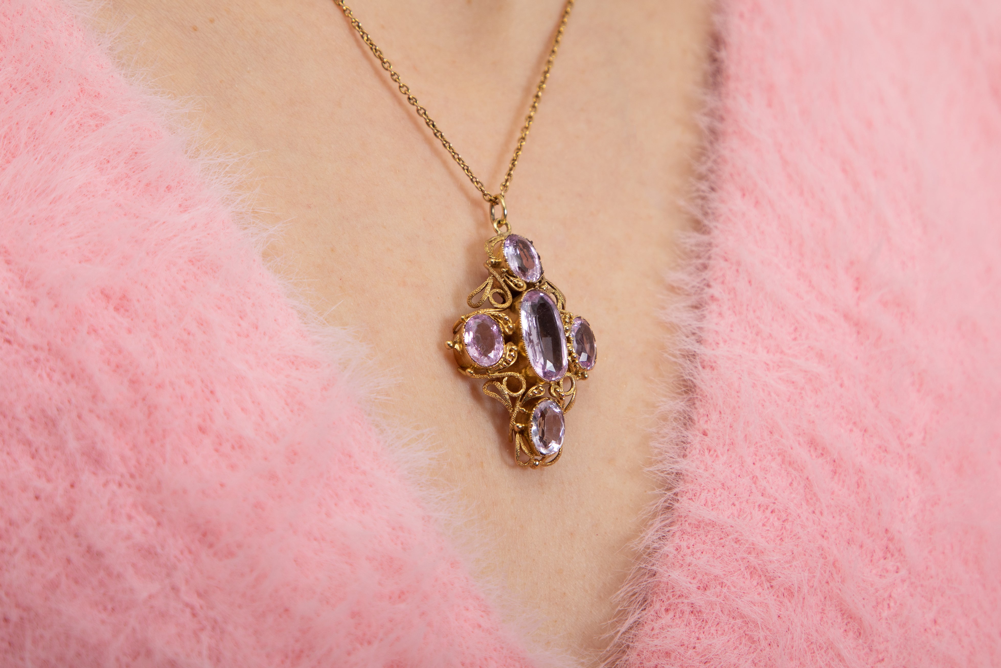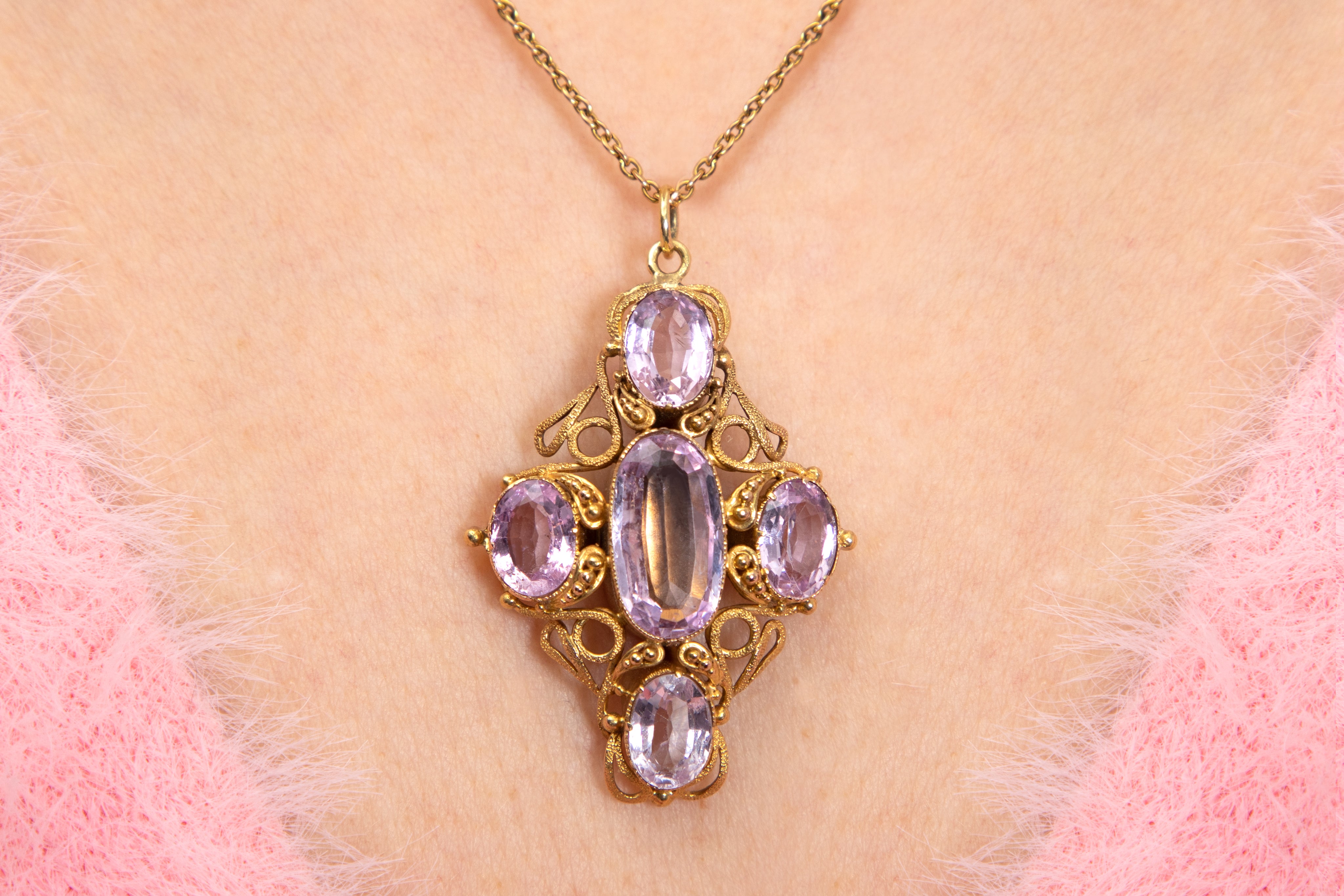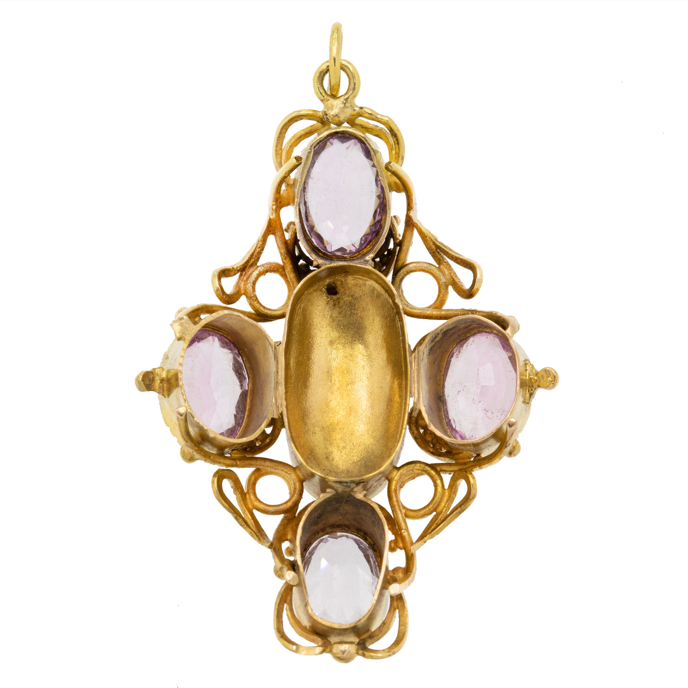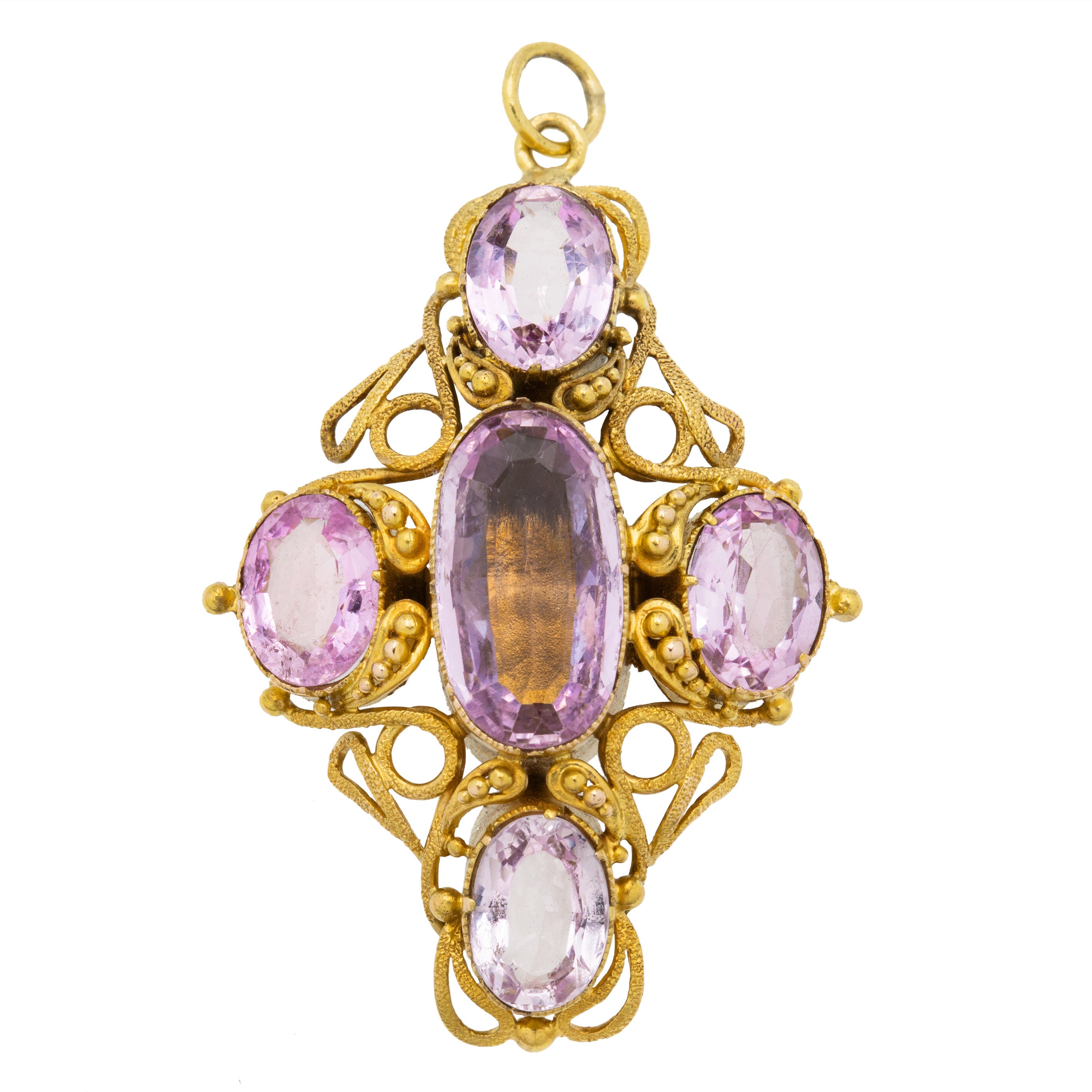 Plucked straight from a fairytale, this Georgian 18ct Gold pink Topaz pendant is heavenly! Homing five Pink Topaz, with a combined carat weight of 6.45ct, each one flaunts a spectrum of twinkling mauve hues poised perfectly in a cross formation.