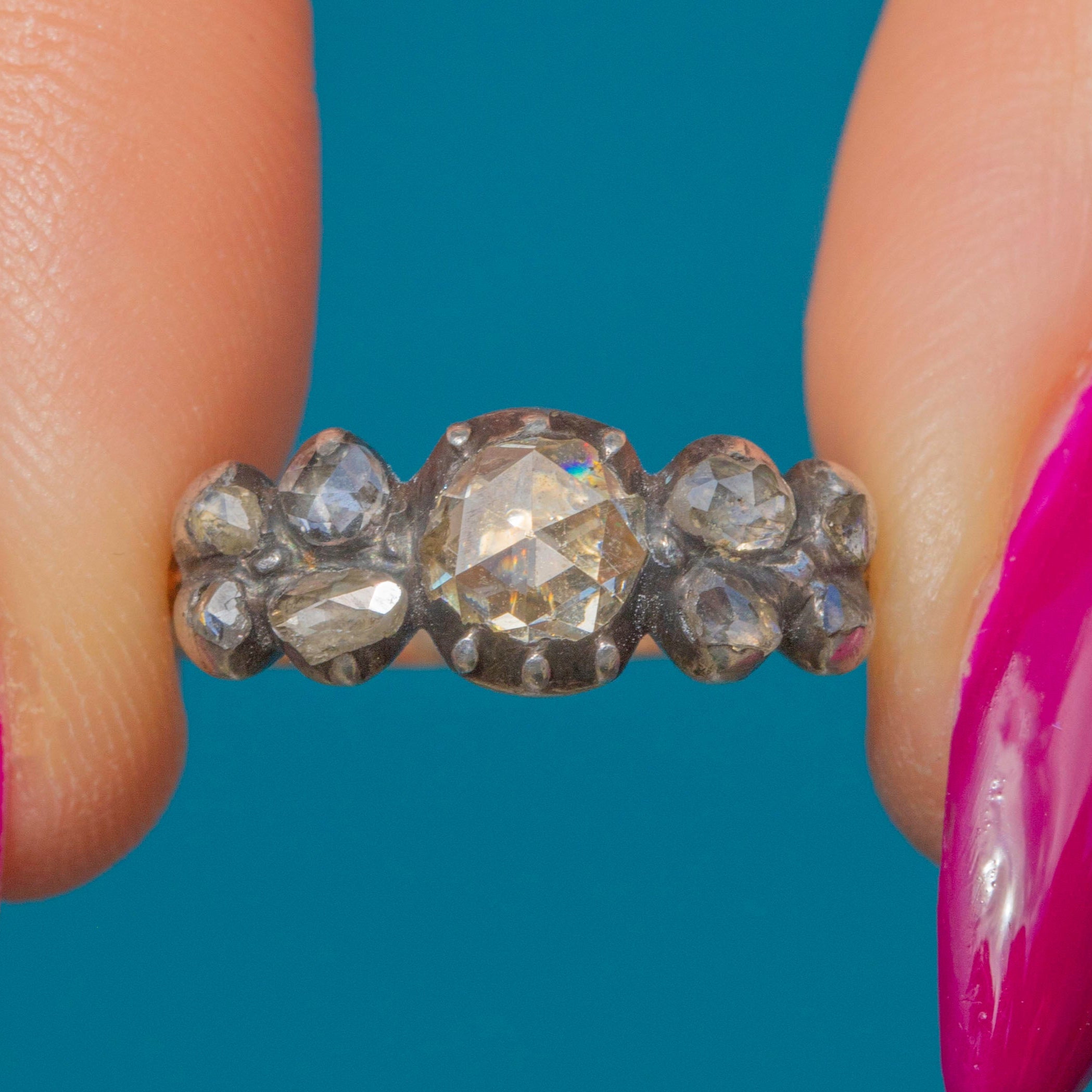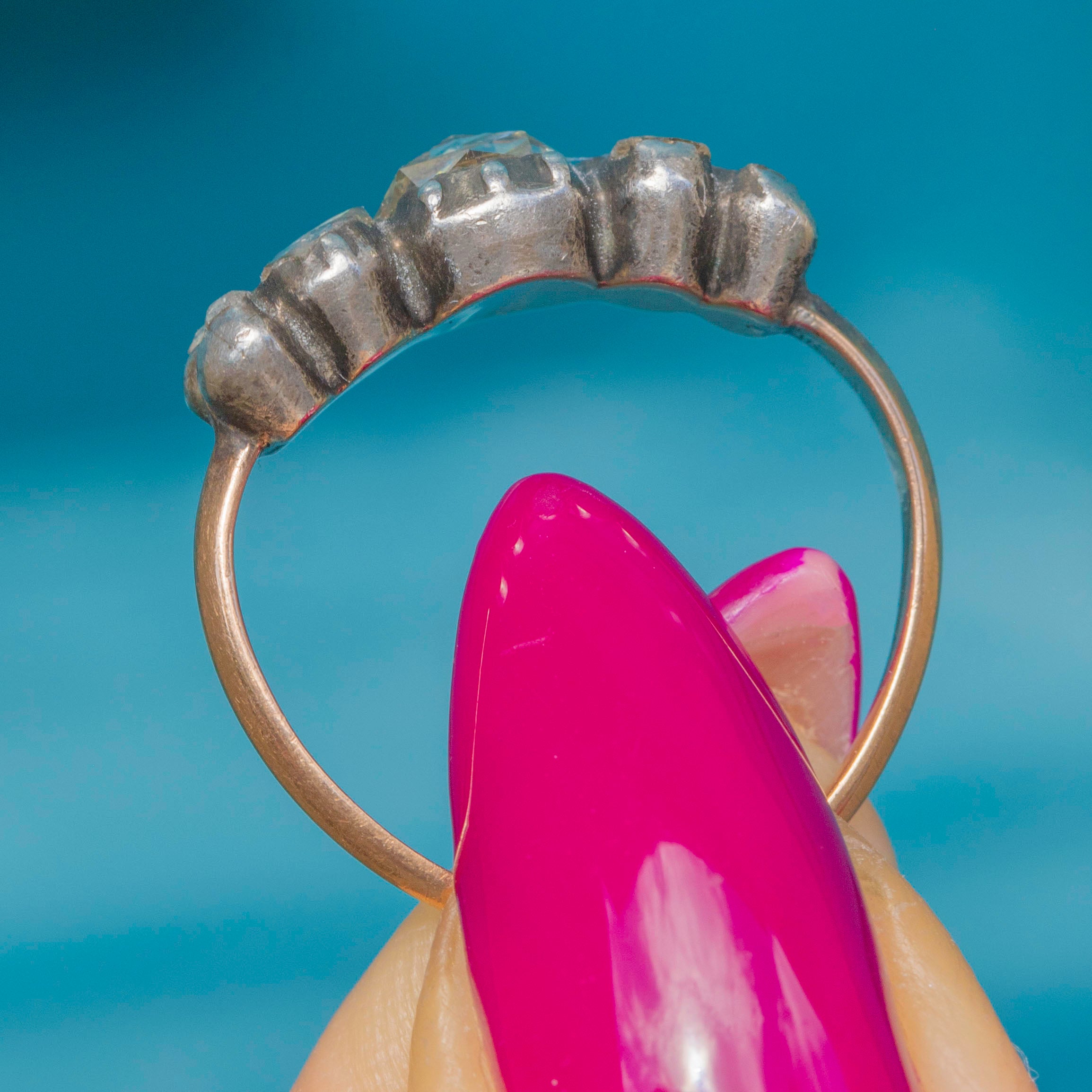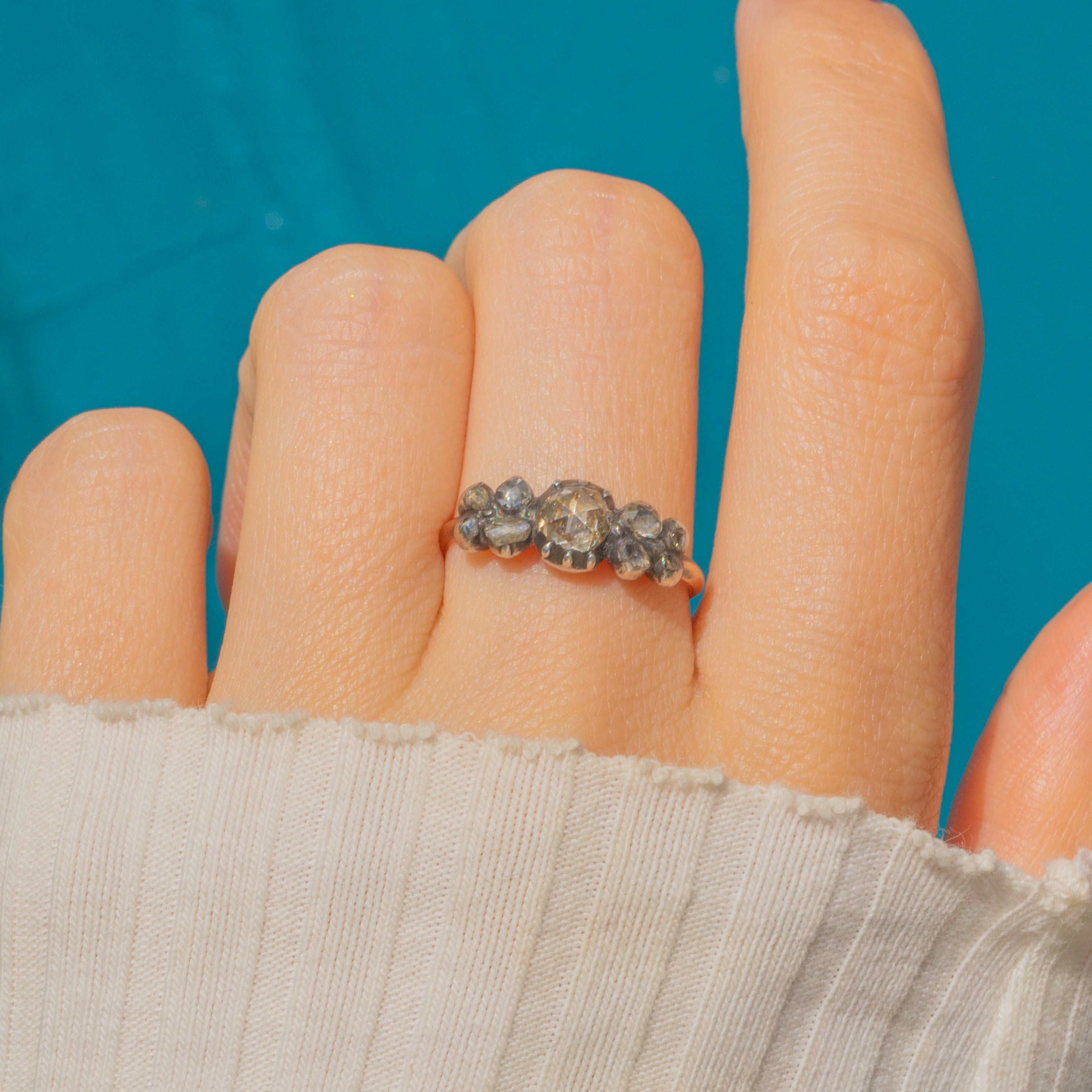 This 18ct Gold half hoop ring is home to 0.65cts of glistening rose-cut Diamonds displayed in typical tight Silver piecrust settings, and has a subtle floral feel to the arrangement of the Diamonds, which we just love! Sparkly and vivacious, this antique early 19th Century rose-cut Diamond ring is a one-of-a-kind beauty.