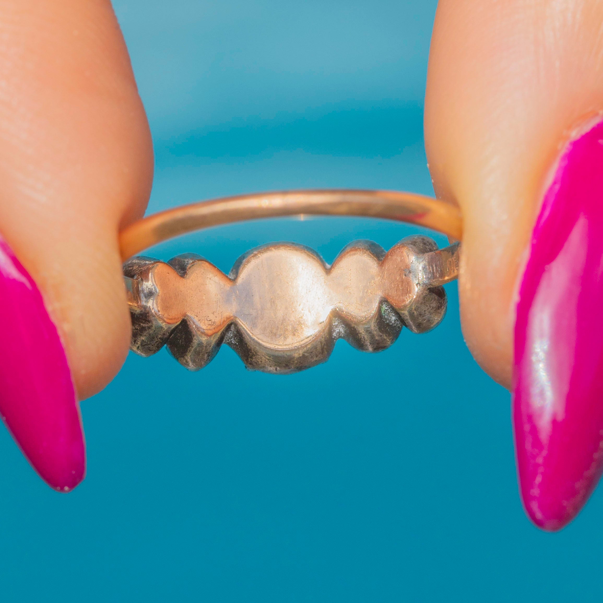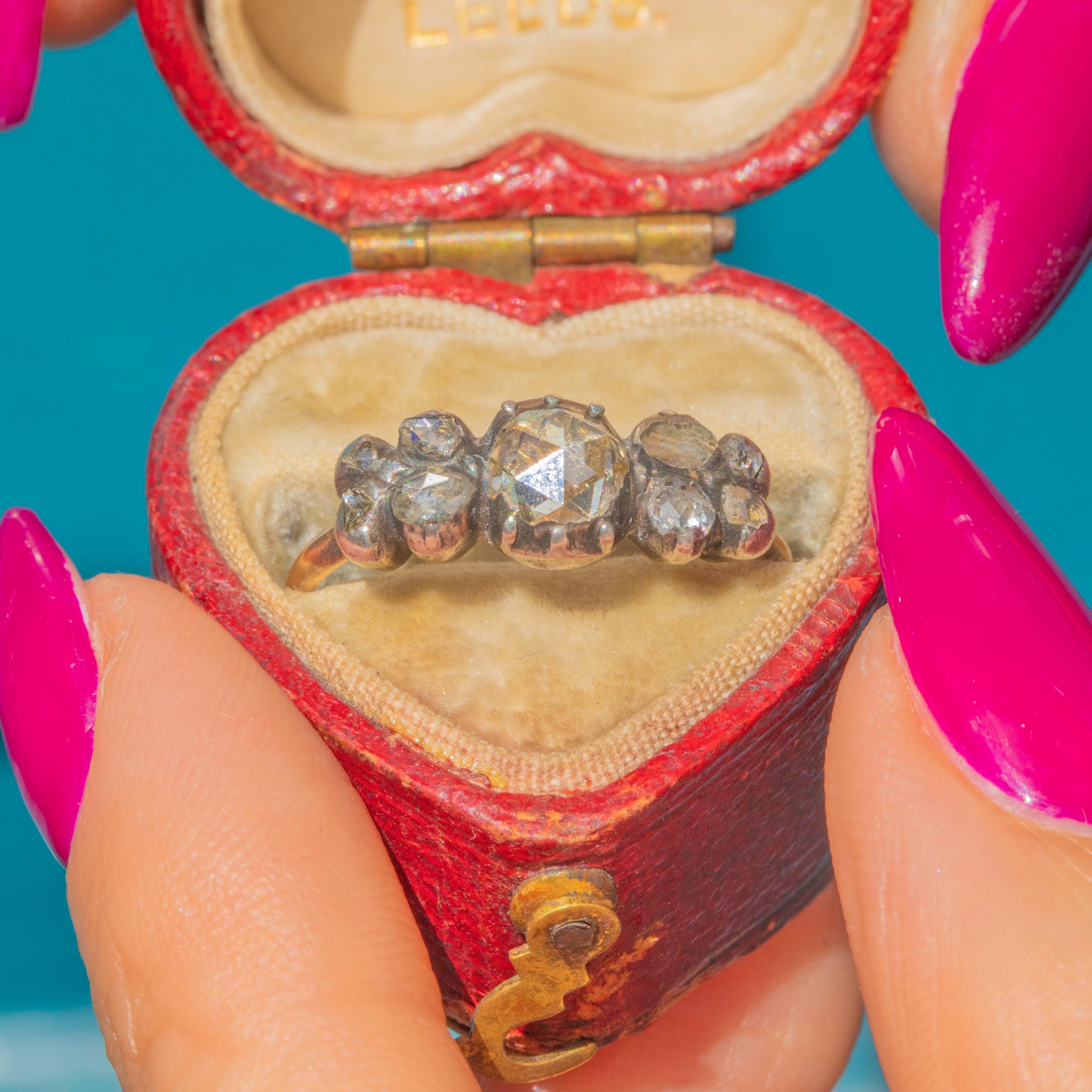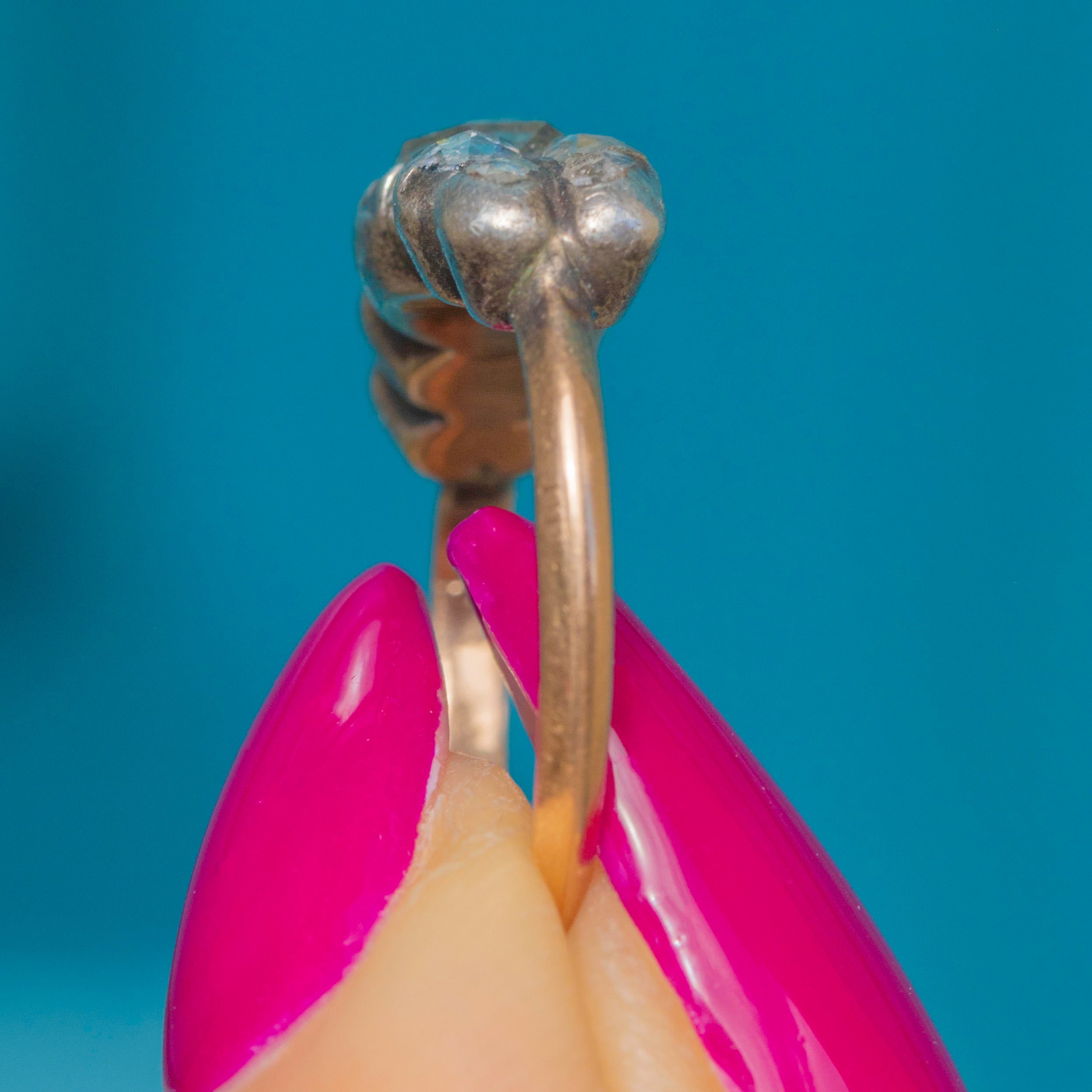 This 18ct Gold half hoop ring is home to 0.65cts of glistening rose-cut Diamonds displayed in typical tight Silver piecrust settings, and has a subtle floral feel to the arrangement of the Diamonds, which we just love! Sparkly and vivacious, this antique early 19th Century rose-cut Diamond ring is a one-of-a-kind beauty.