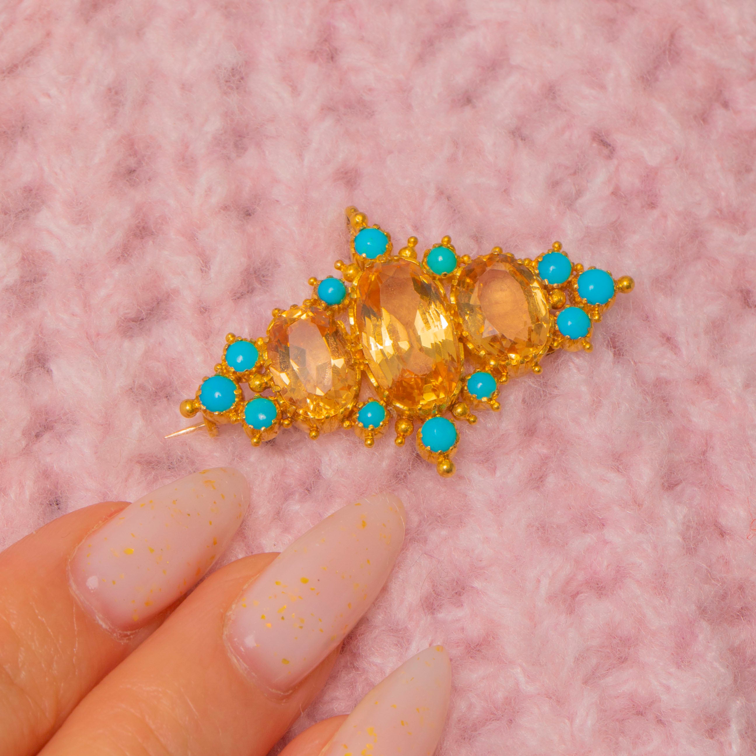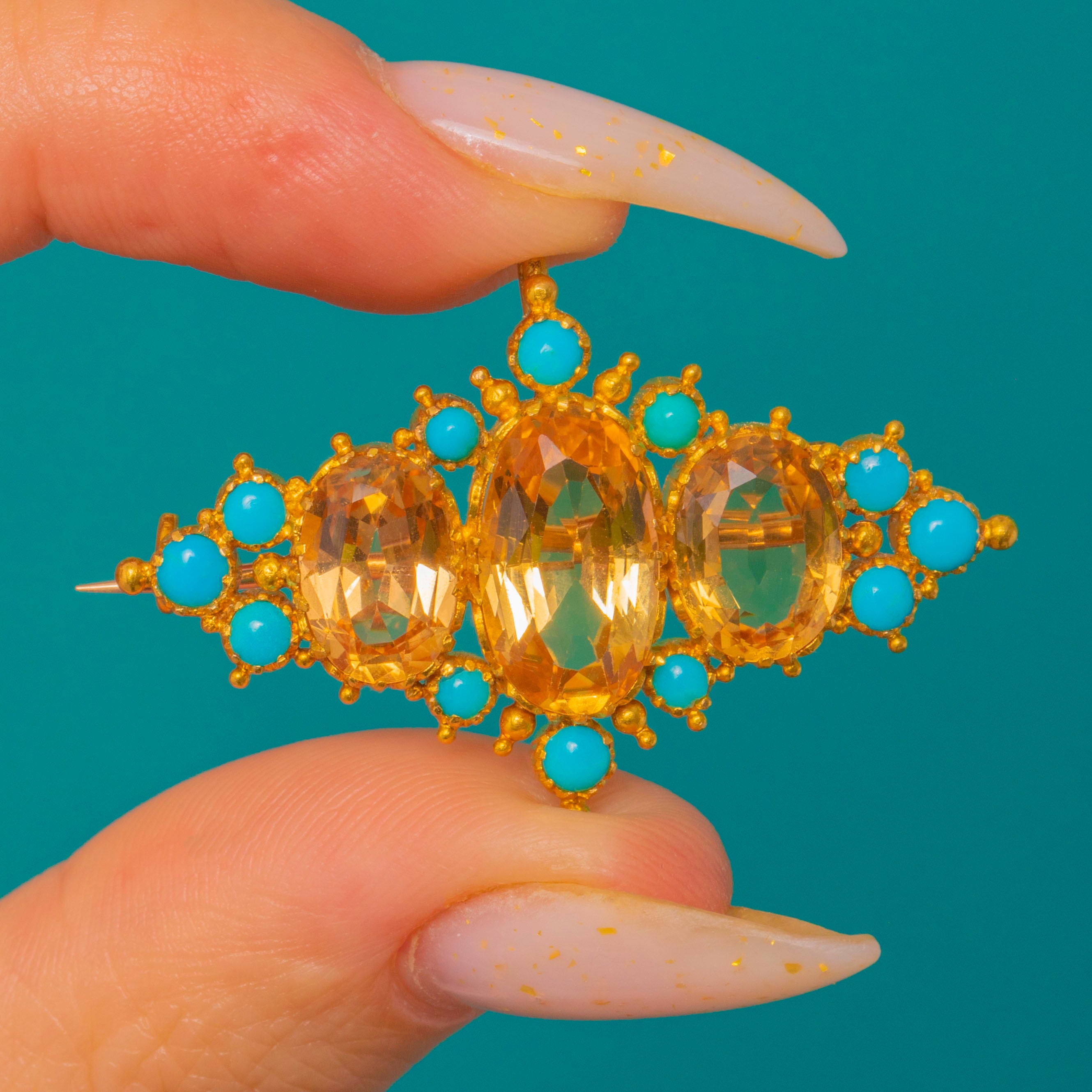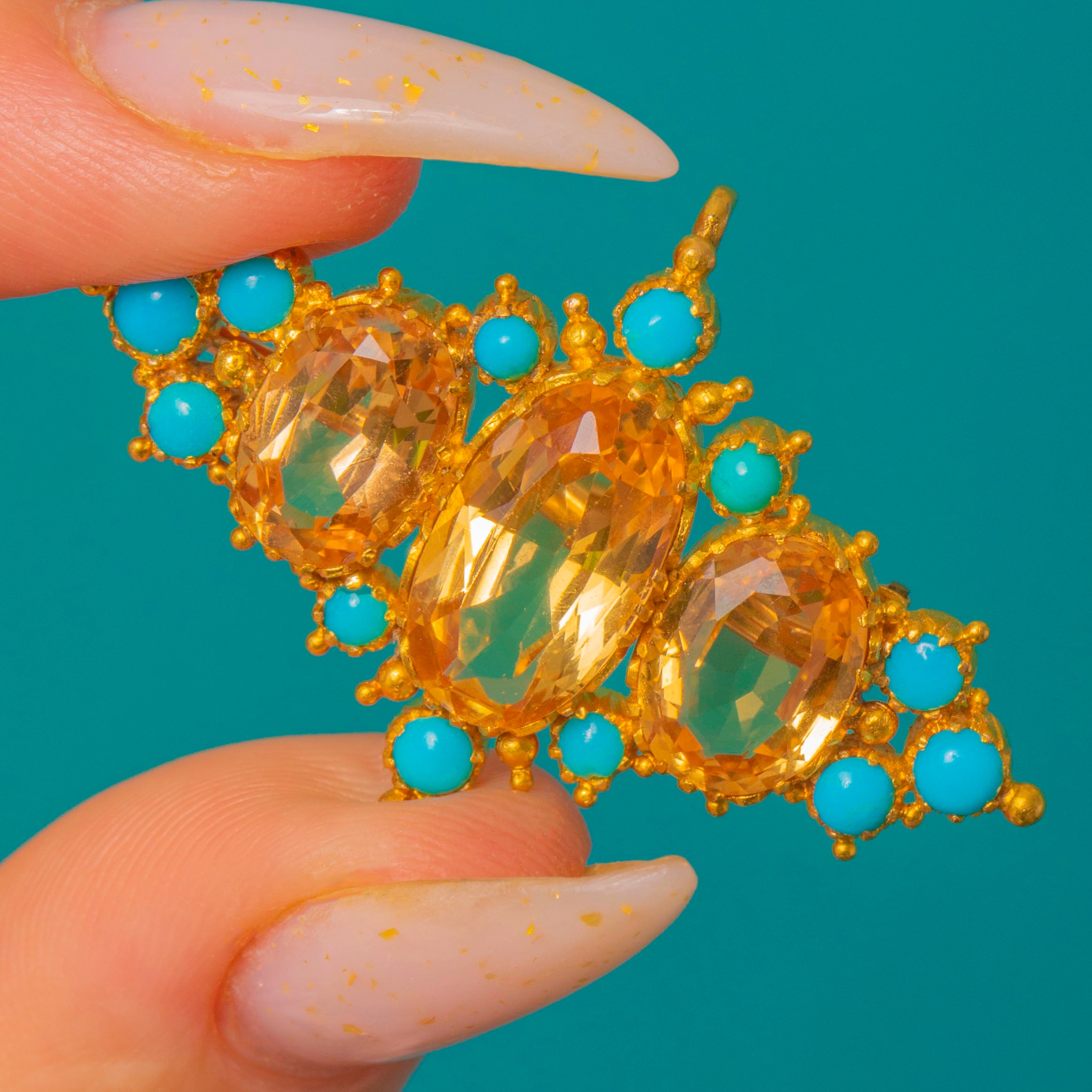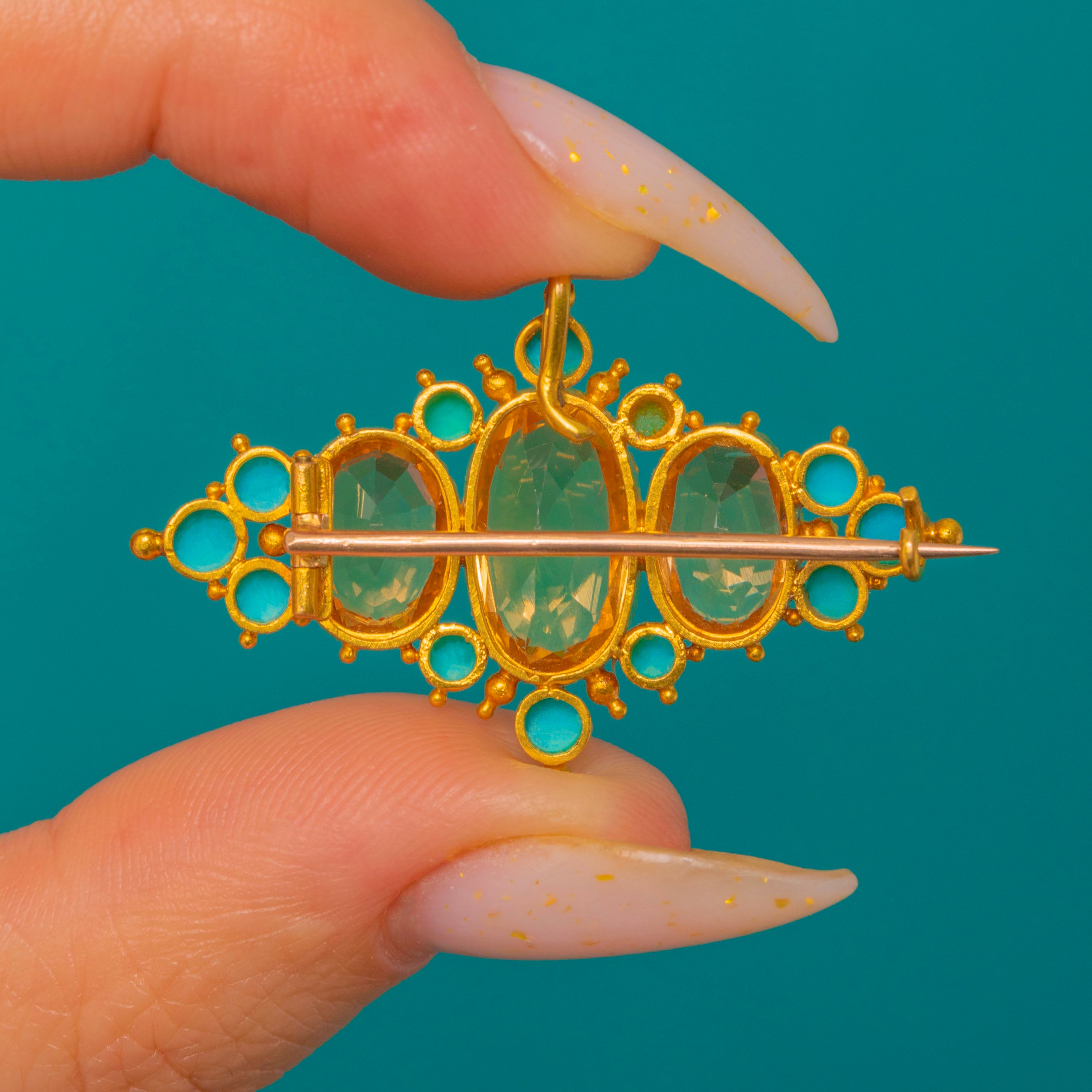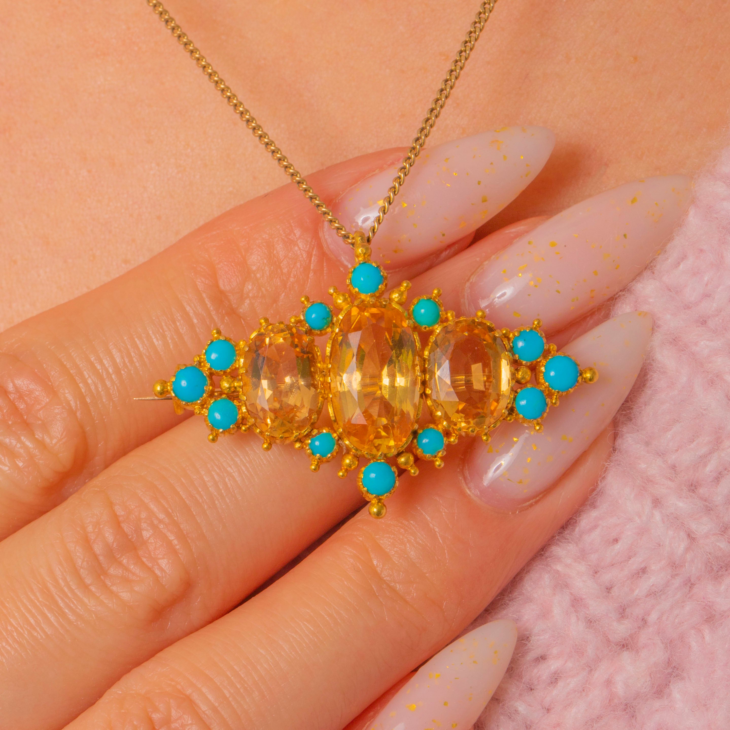 Three faceted oval Topaz sit at the centre in warm golden tones, framed by a highlights of vivid turquoise and finished with fine granulated detail for an ornate, floral effect. The piece is mounted in a warm yellow Gold finish with a tube hinge and pin bar for brooch wear and a small suspension loop for optional pendant wear, making it a versatile statement that feels both historic and wearable.