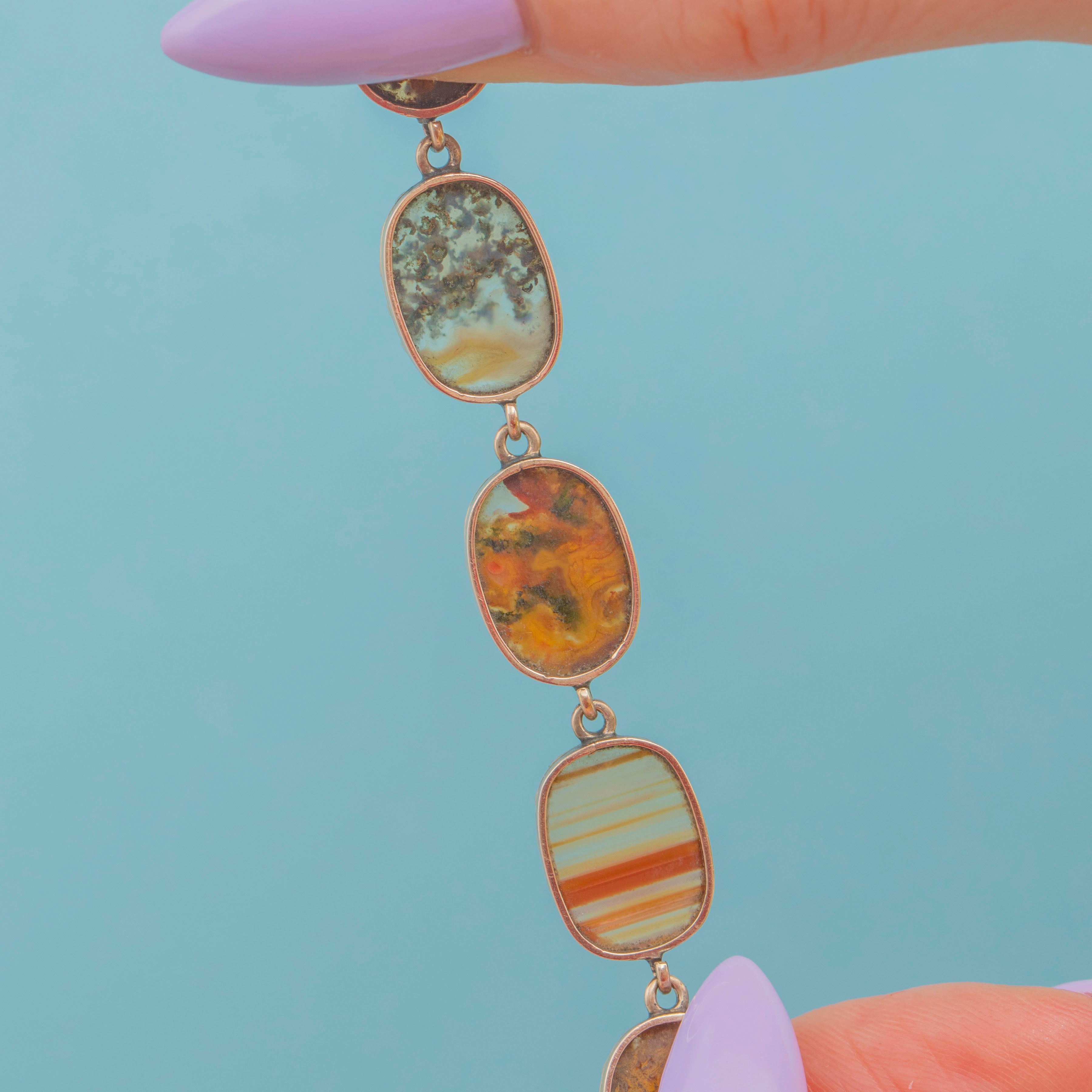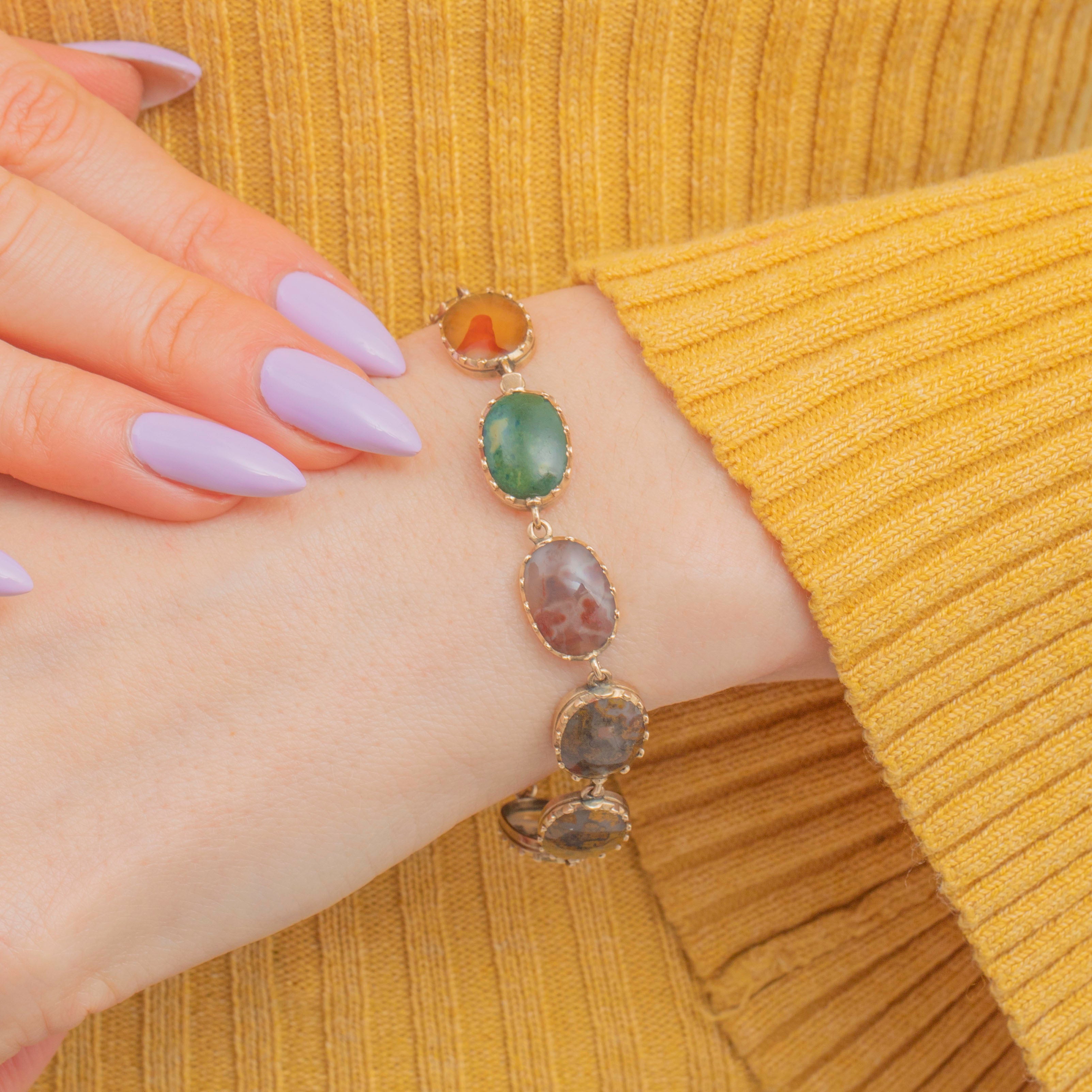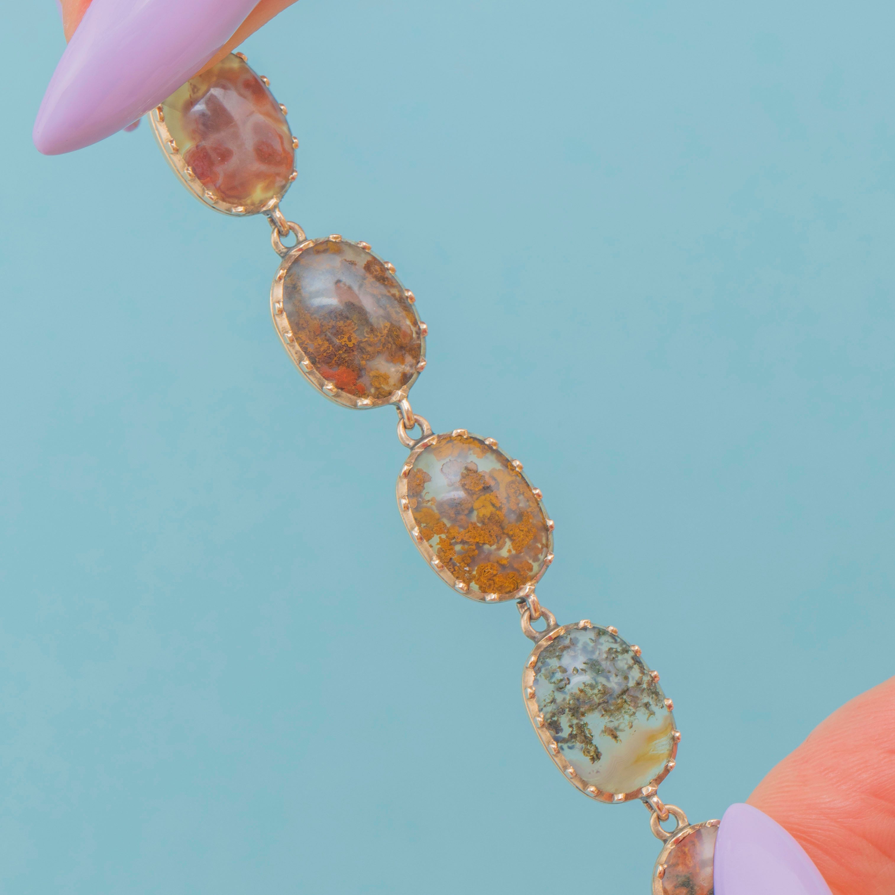 Crafted from buttery 9ct Gold, this antique bracelet features ten beautiful Agate stones, each distinct in its unique pattern and colour palette. From deep greens to brown speckles and red bands, each Agate rests comfortably within their piecrust settings, married by the warmth of the 9ct Gold.