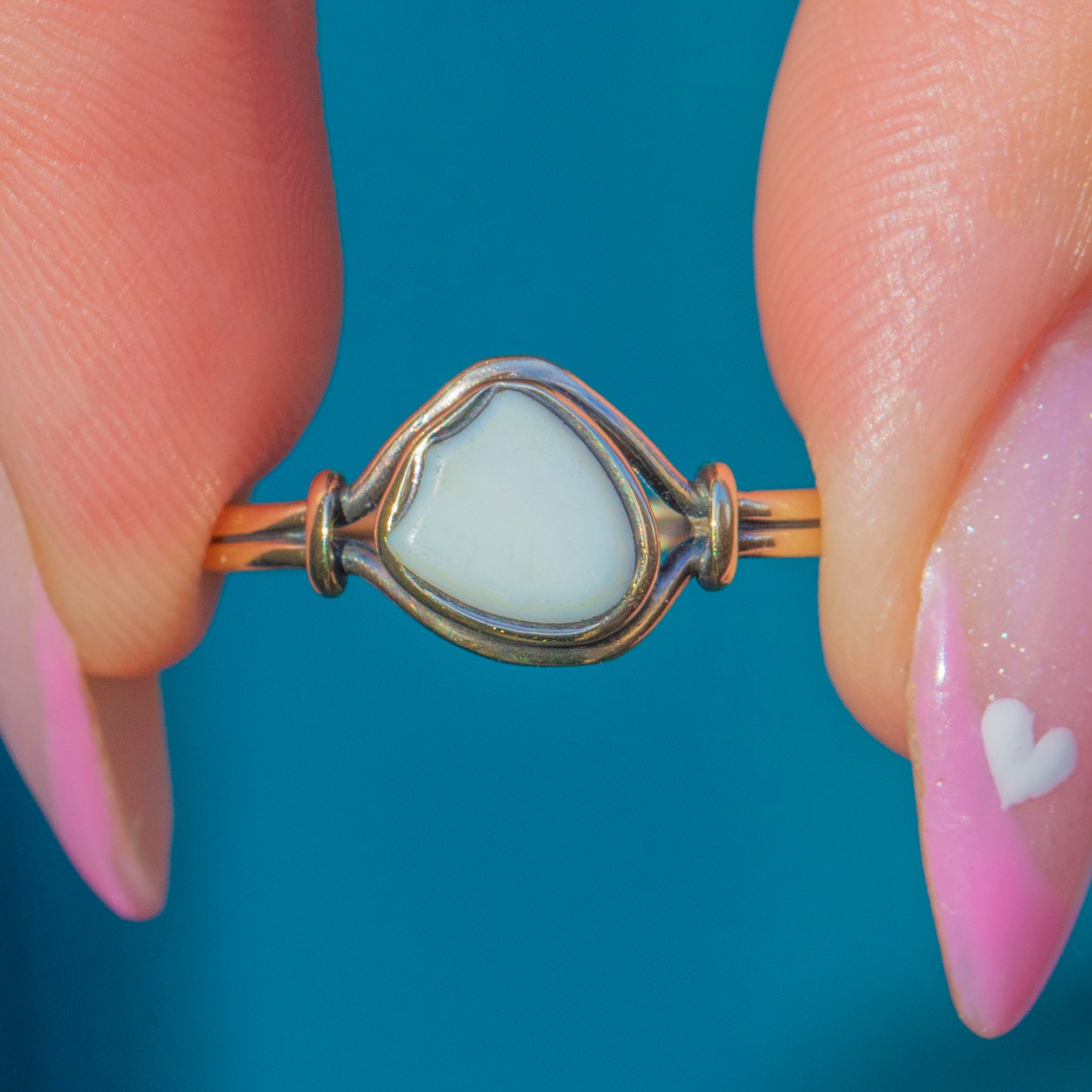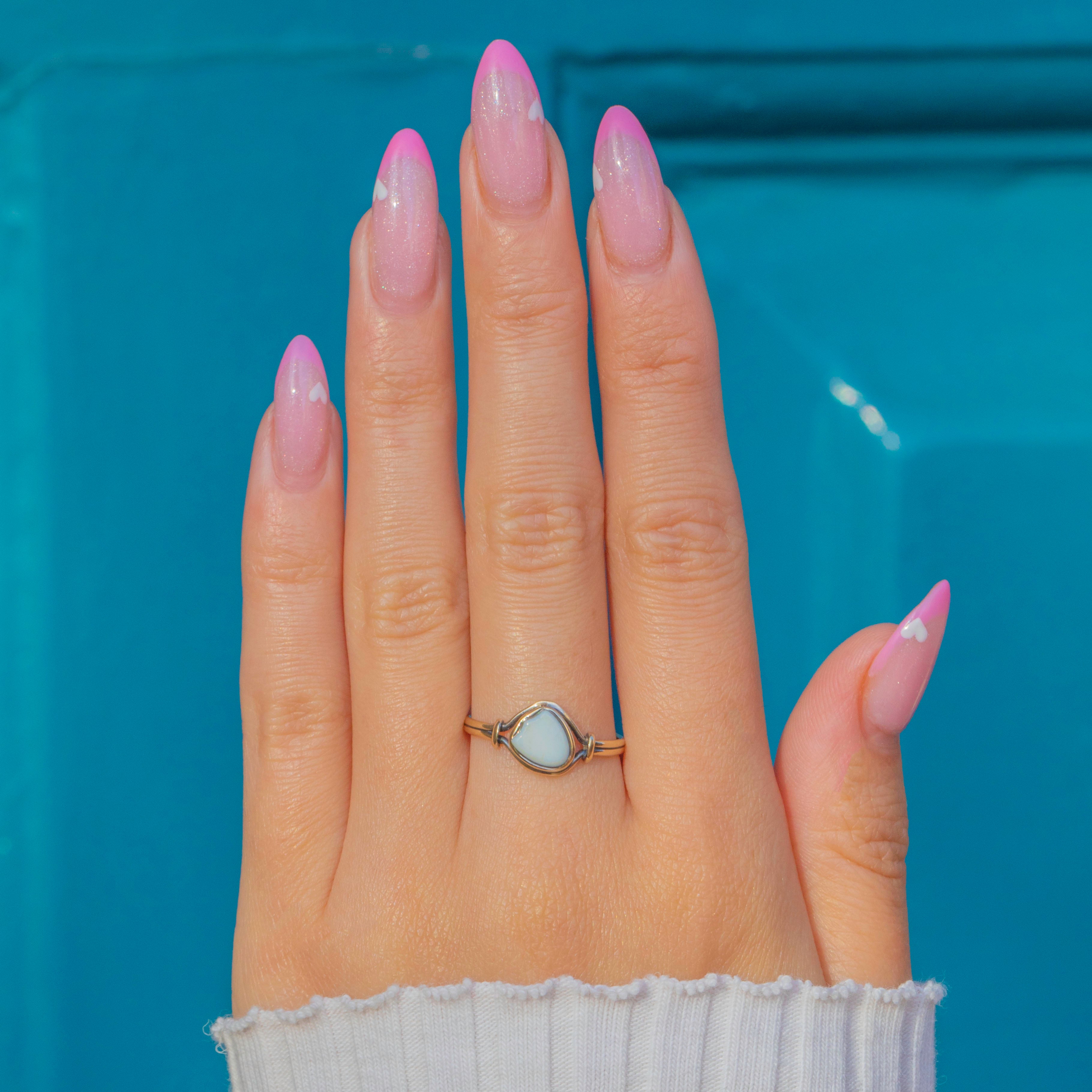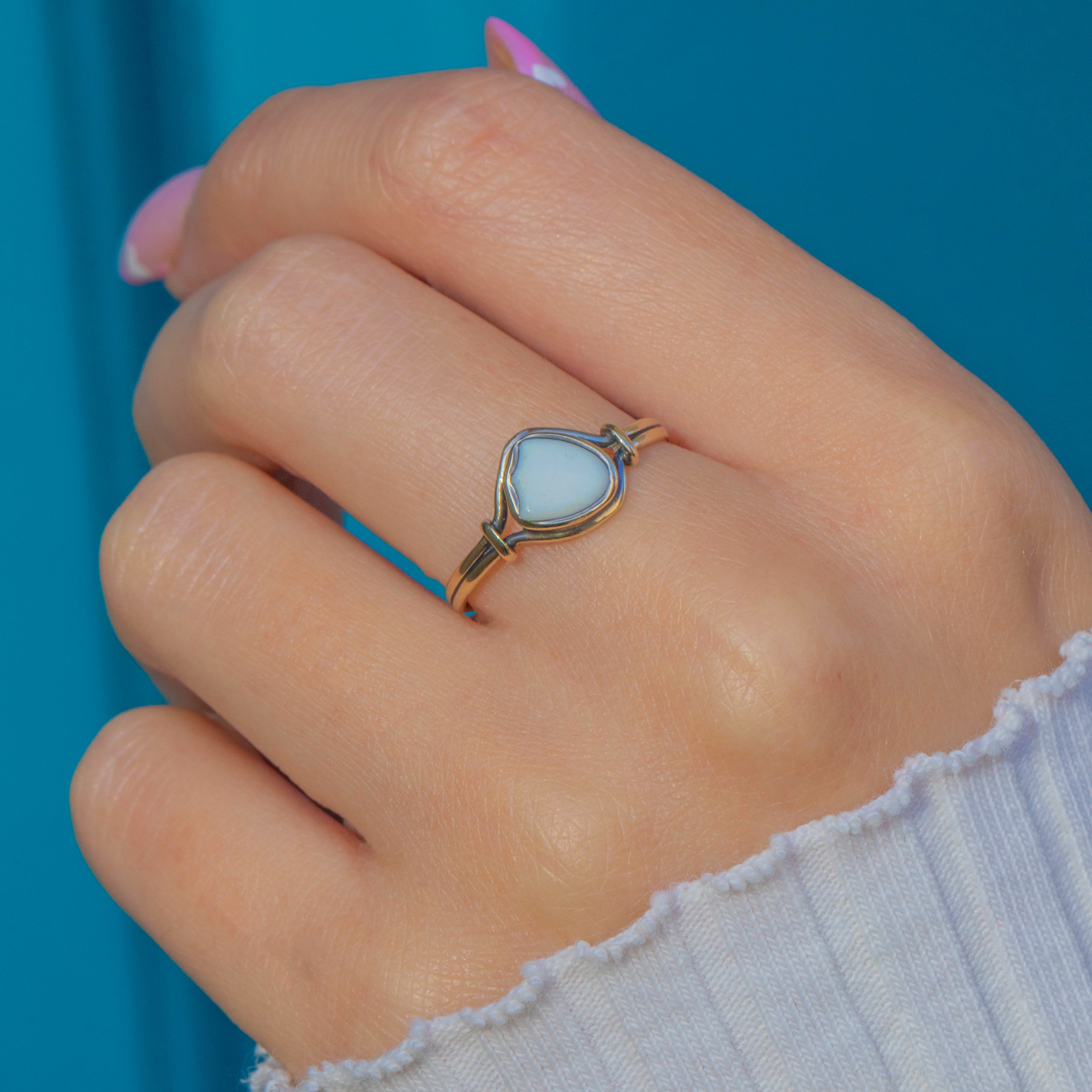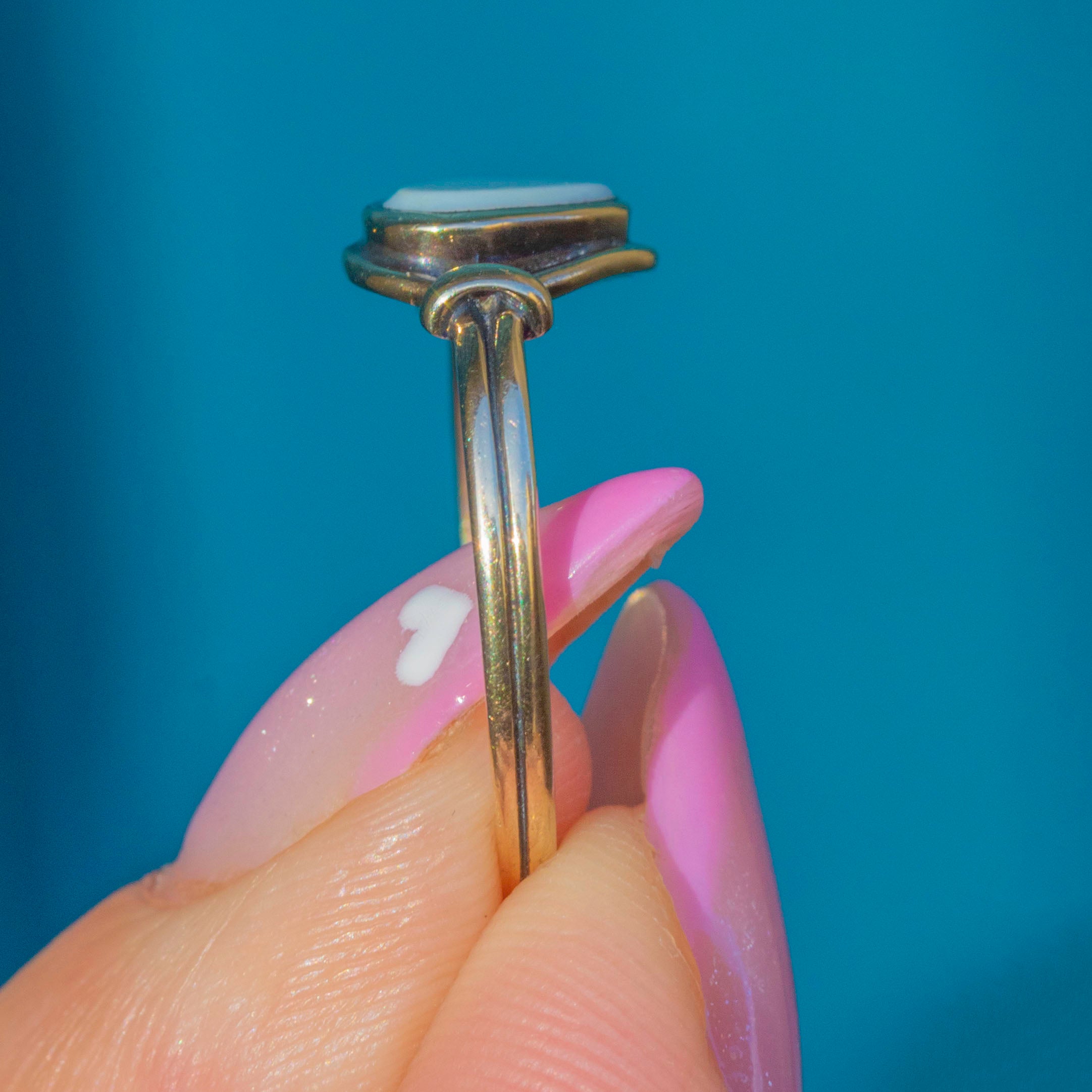 A delicate Georgian ring crafted in 9ct Gold, featuring a soft white Agate cut into a charming shield shape. The stone’s smooth polish and creamy tone give the ring a quietly elegant character, perfectly complemented by its slender gold band.