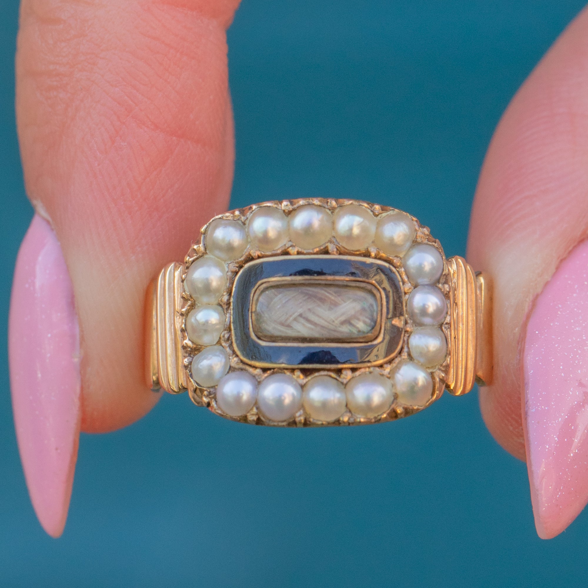 Georgian mourning rings are rich in early 19th-century romanticism, and she is no exception. Displating a woven hair centre, this 9ct Gold ring is encircled with inky black Enamel and a halo of lustrous Pearls, representing tears.
