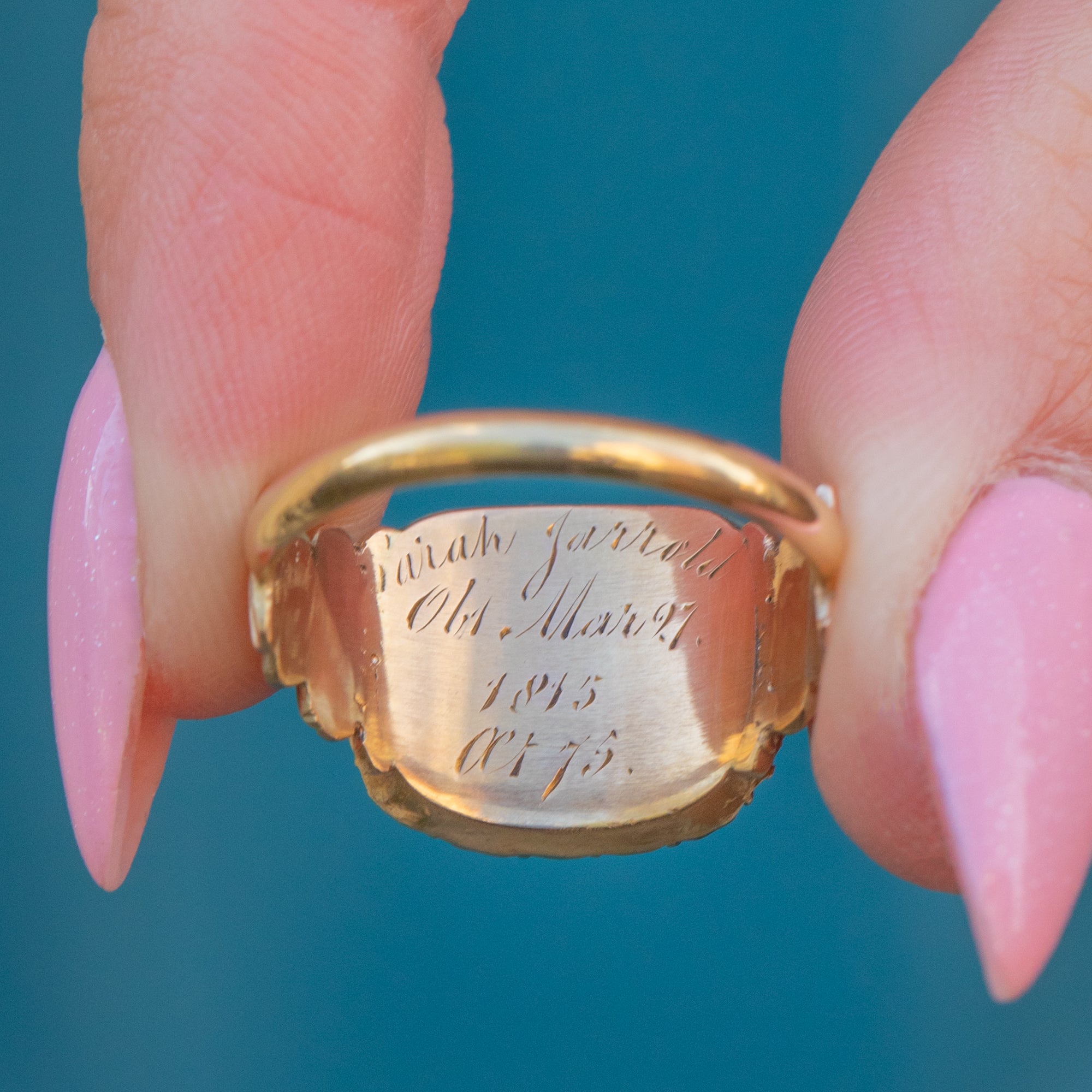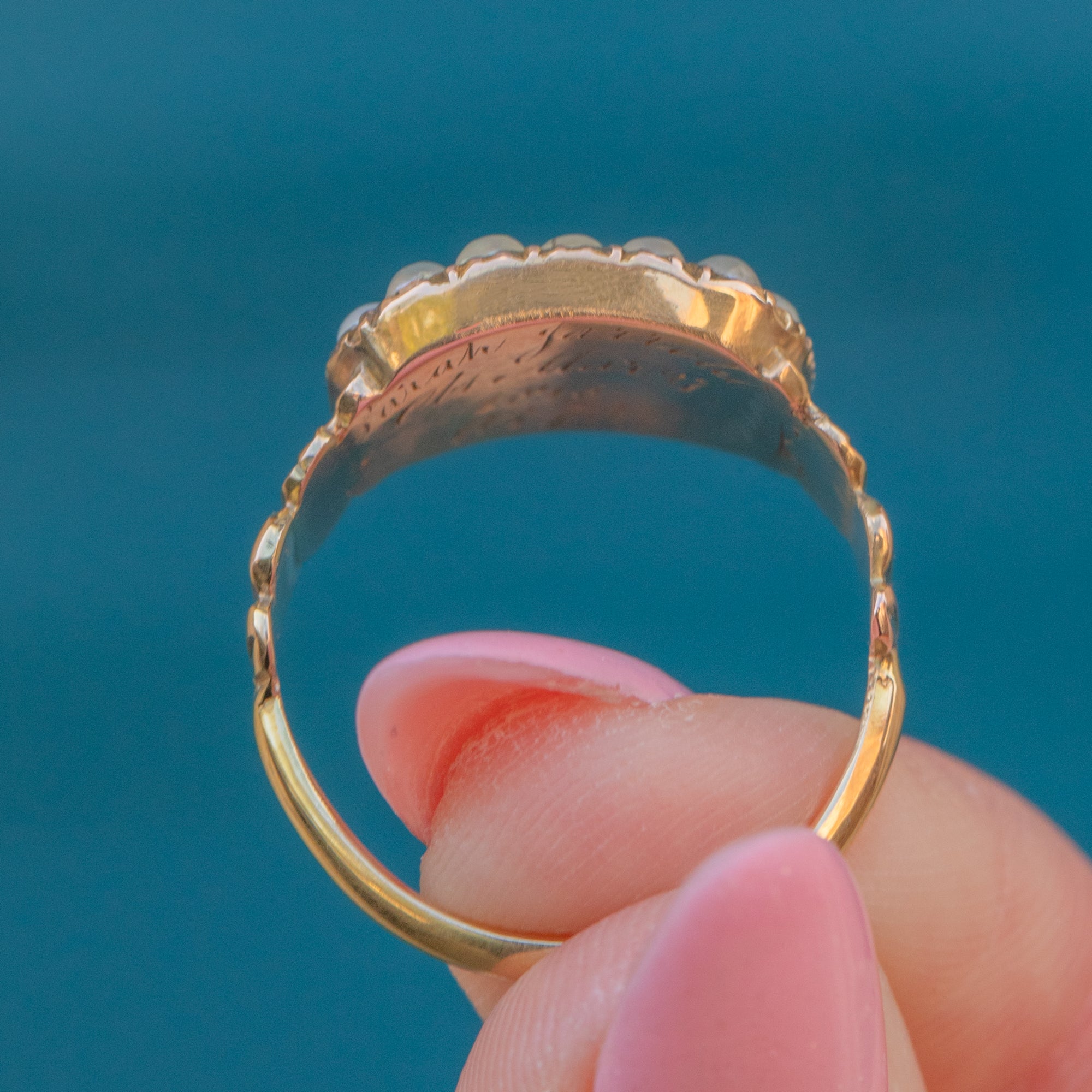 This Georgian 9ct Gold Garnet Enamel Pearl mourning ring is an exquisite piece. With a finely engraved inscription reading 'Sarah Jarrold Ob Mar 27, 1815 At 75', this Georgian ring is steeped in antique sentiment.