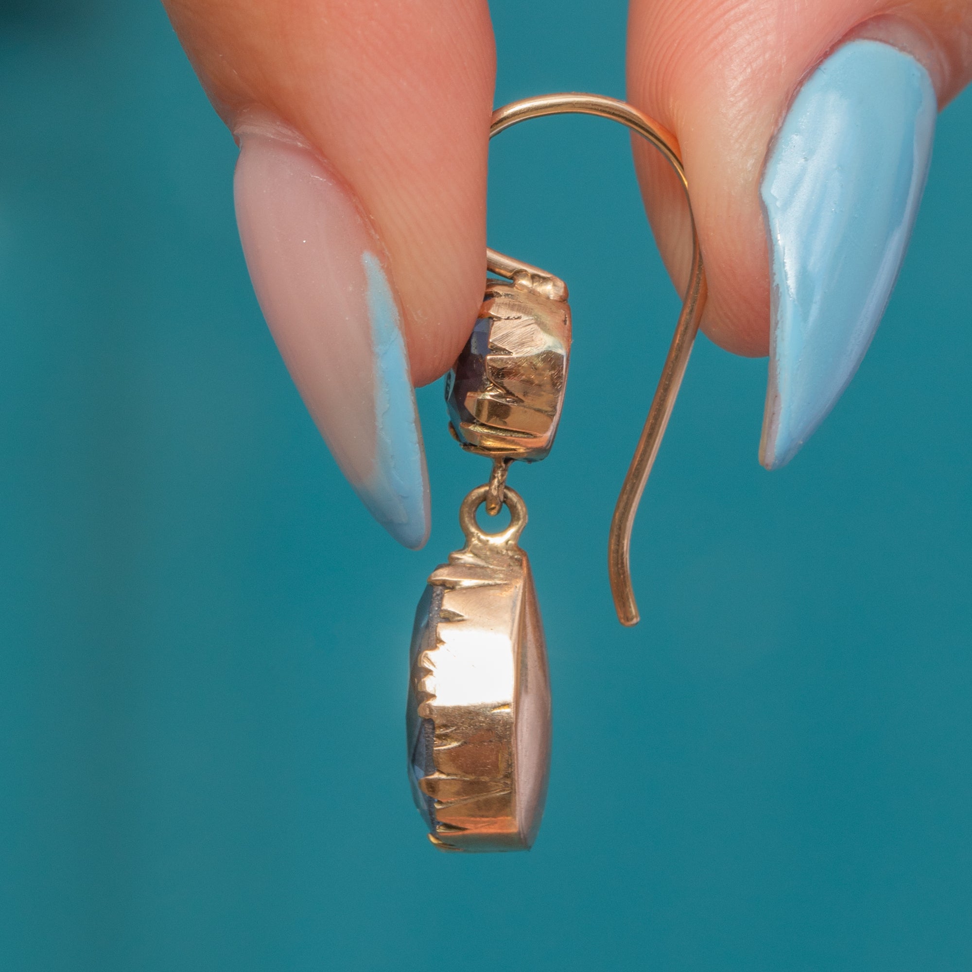 With closed backs, the stones are set in glossy 9ct Gold; the warmth of the Gold effortlessly complements the cool tones of the aqua blue Paste. Dancing with movement as they suspend from elongated hooks, these Georgian earrings are a resplendent antique pair to add to your collection.