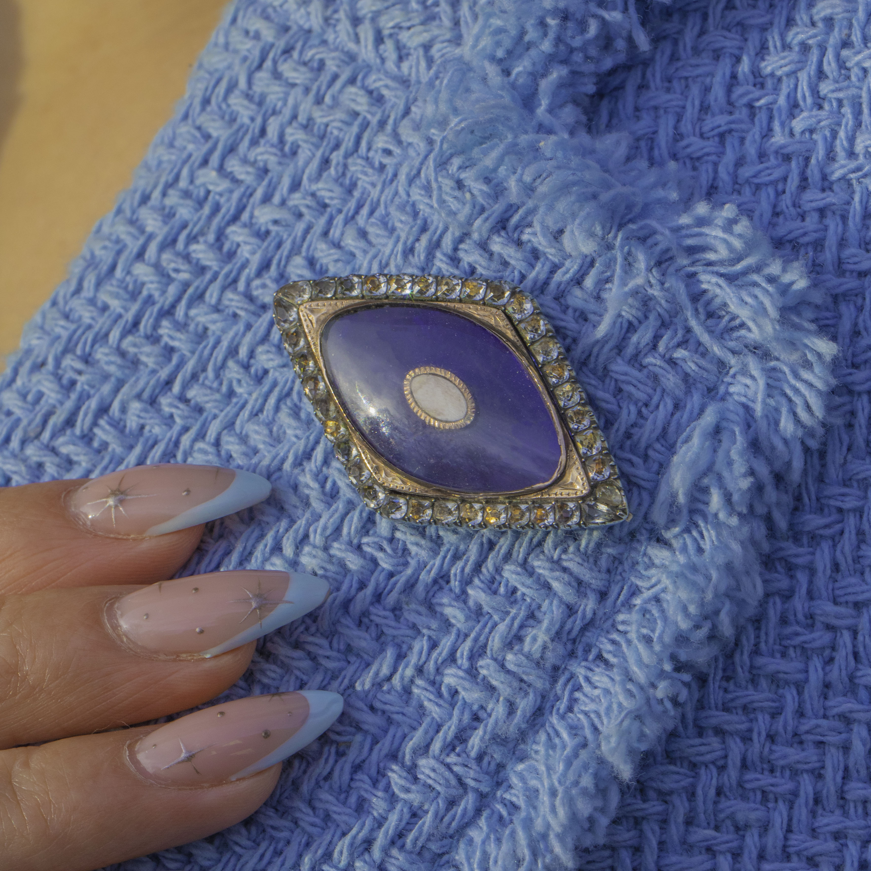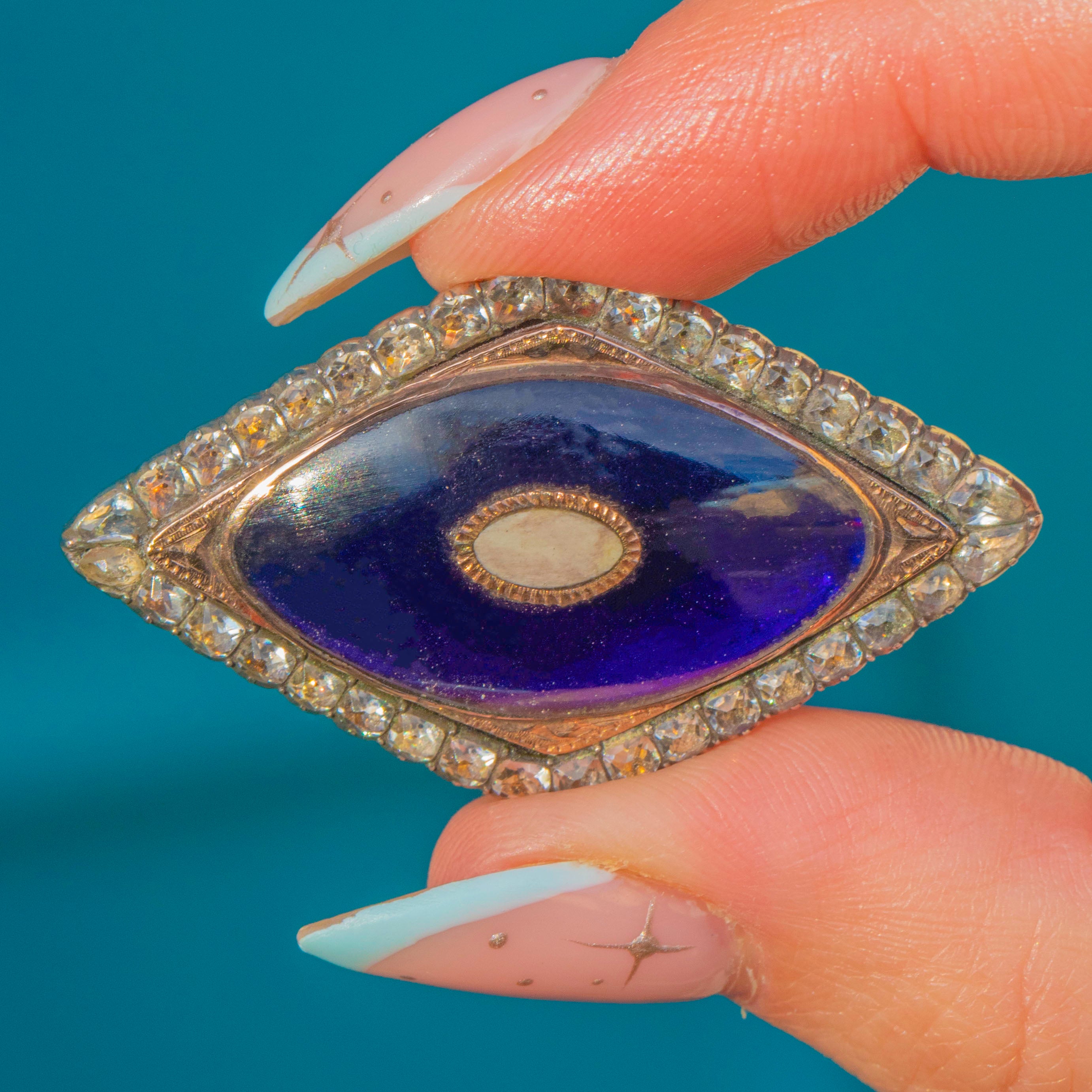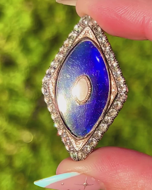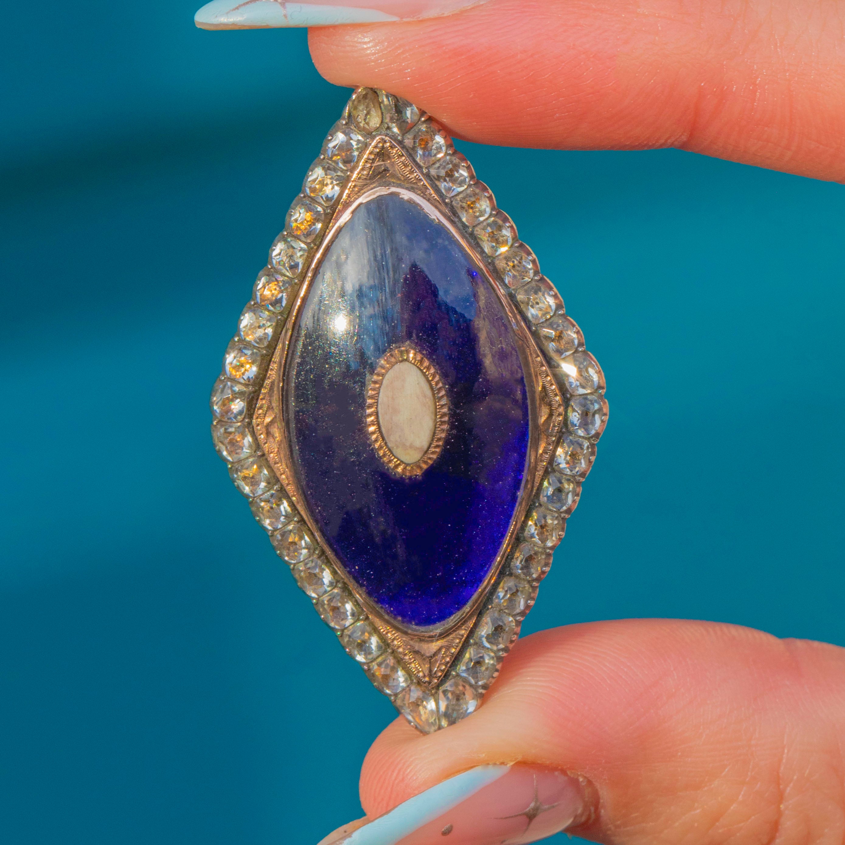 A beautifully romantic Georgian friendship brooch, centred with a rich Bristol Blue Glass panel framed by a glittering border of White Paste. The elongated marquise form is classic of the era, with delicate engraved details that give the whole piece a wonderful sense of depth and refinement.