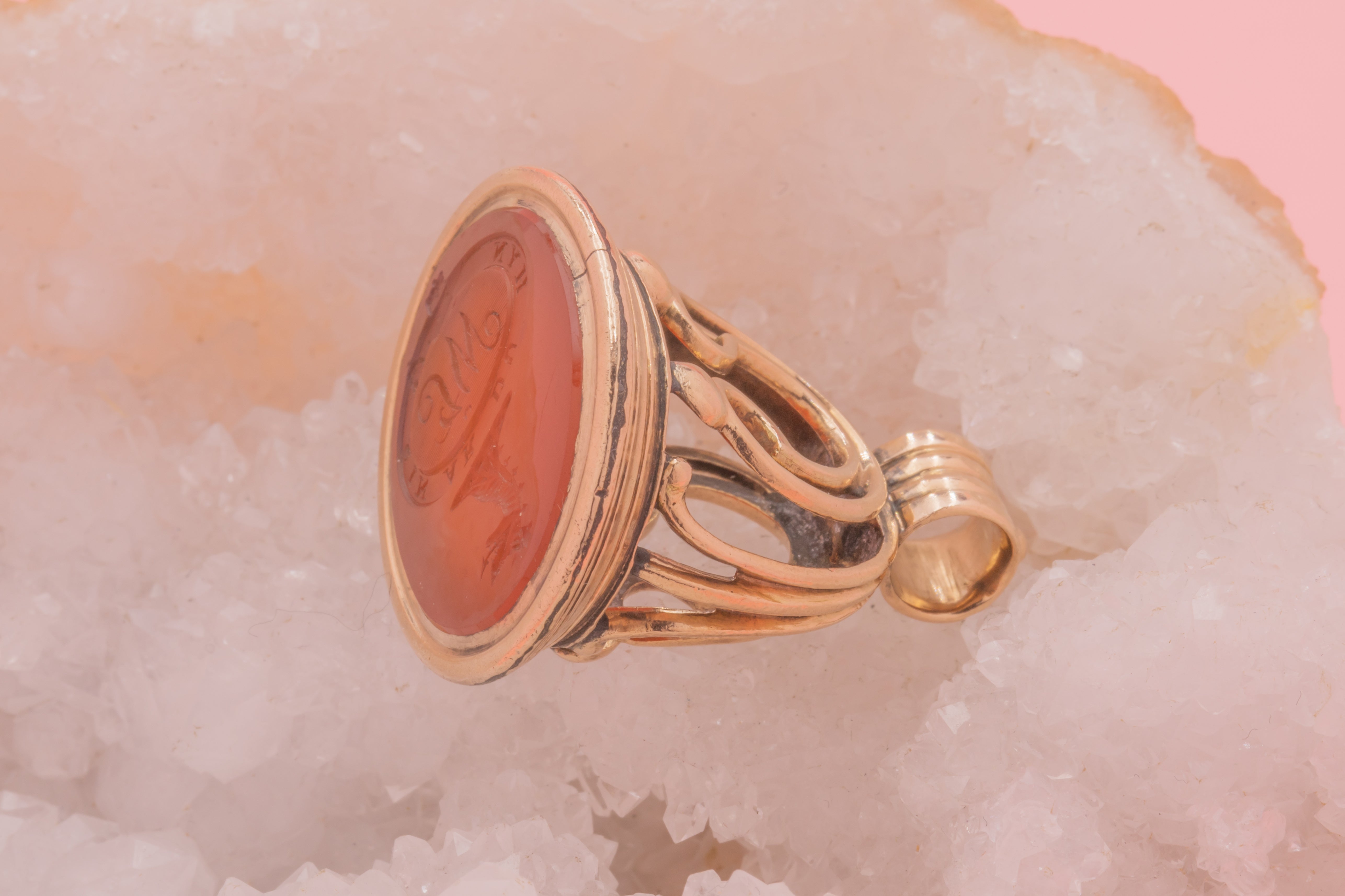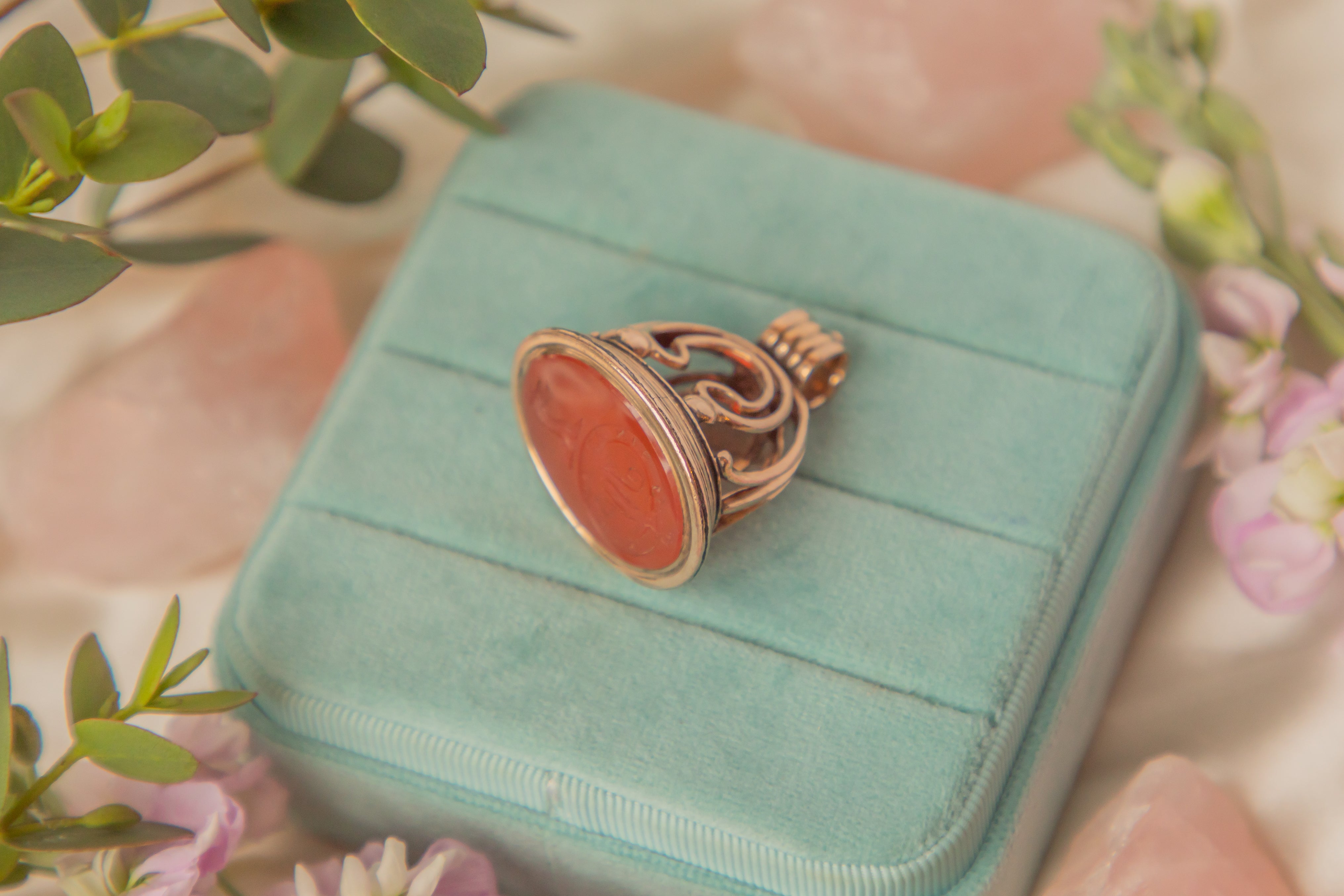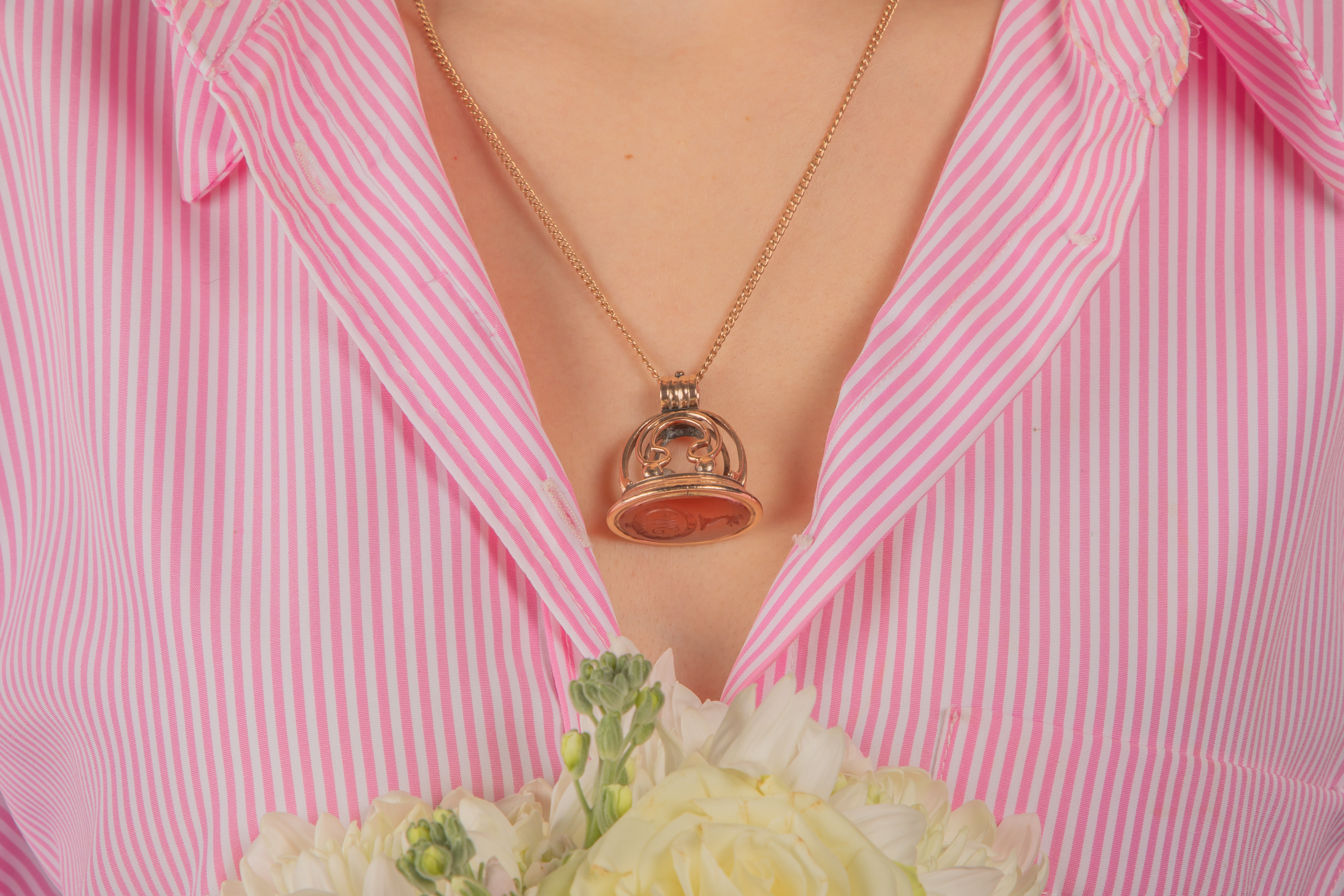 Dating back to the early 19th century, this Georgian 9ct Gold Carnelian intaglio fob pendant is over 200 years old. Crafted from rosy 9ct Gold and inlaid with Carnelian, her elegant pillar has curves in all the right places. Quite the statement piece, she weighs over 20 grams!