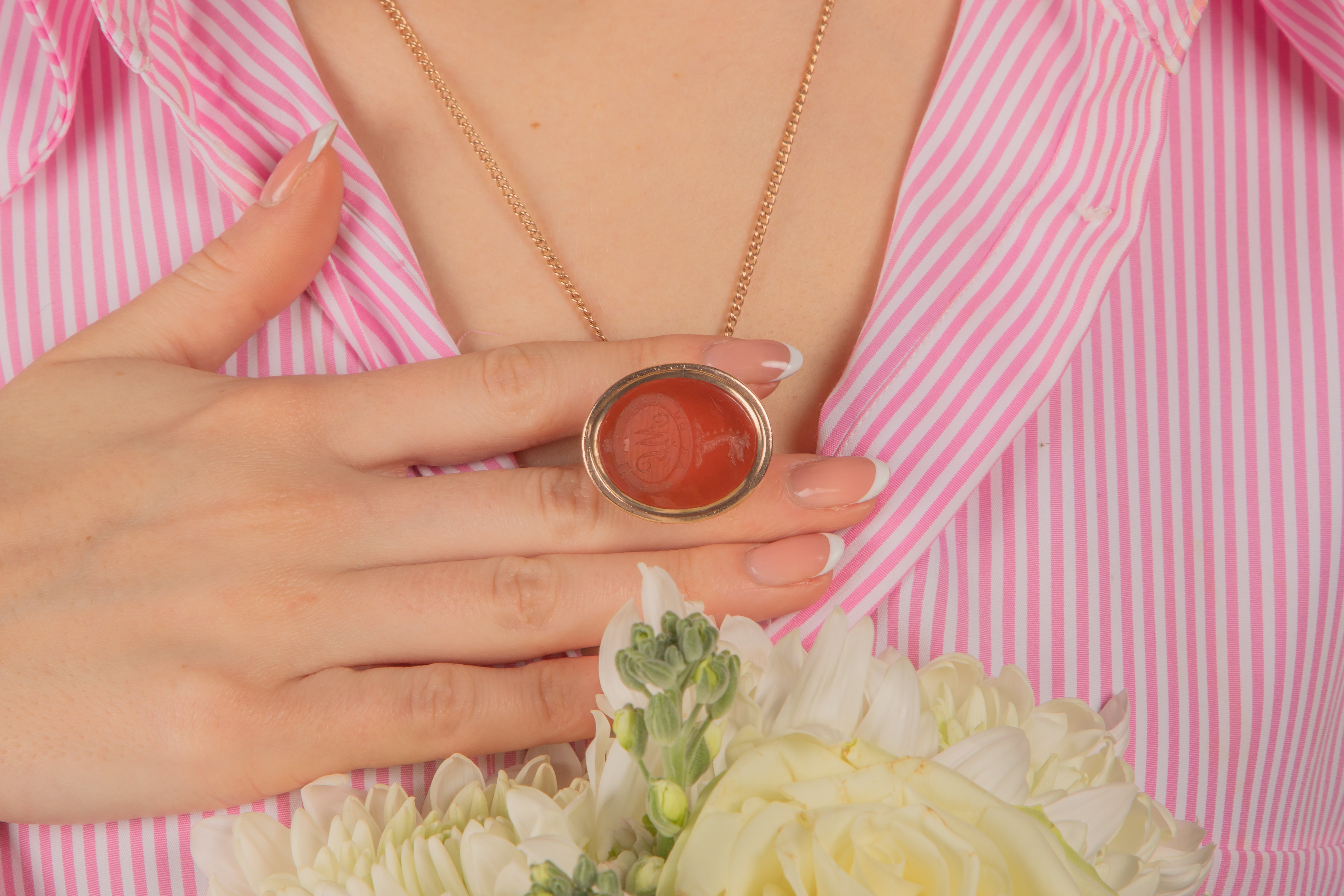 The slab of fiery Carnelian is adorned with an intaglio, featuring a dragon and stamped with the initials 'JW' and 'Sin Ar Du Hyn'. With no clear translation, we believe this to be a gorgeous family crest! Once used to seal important documents, in the present-day, wax seal fobs make for unique pendants.