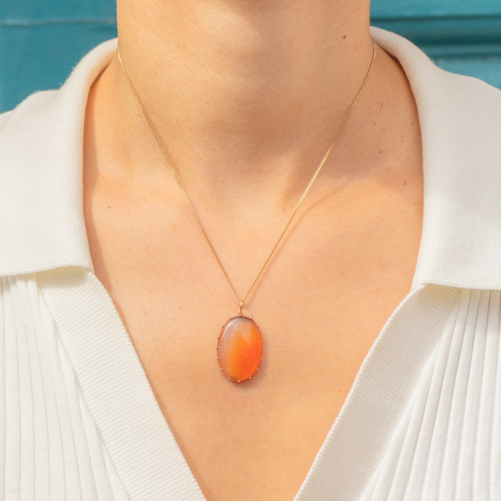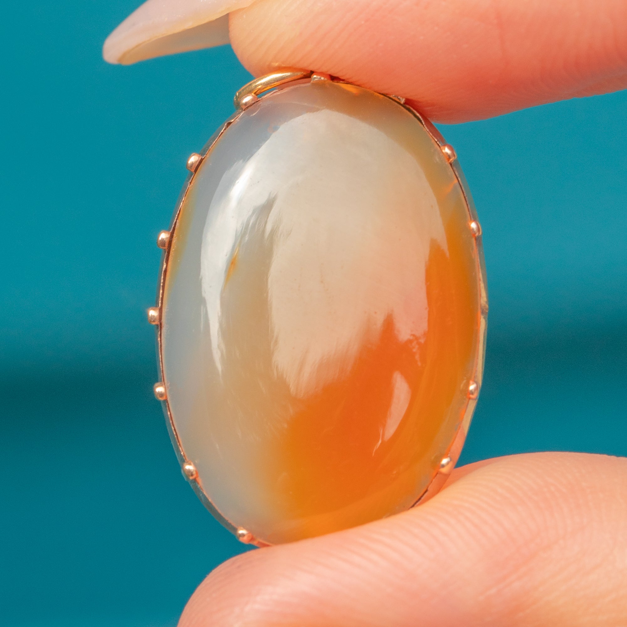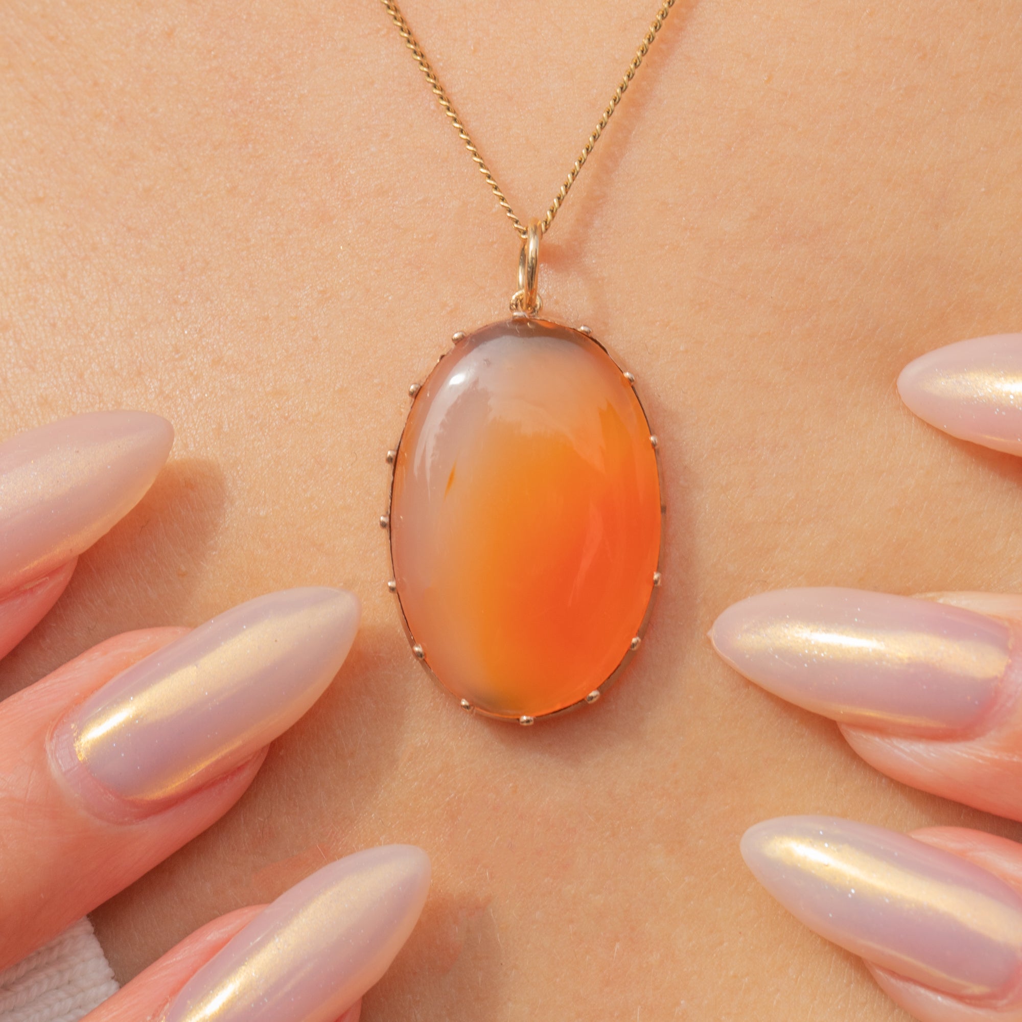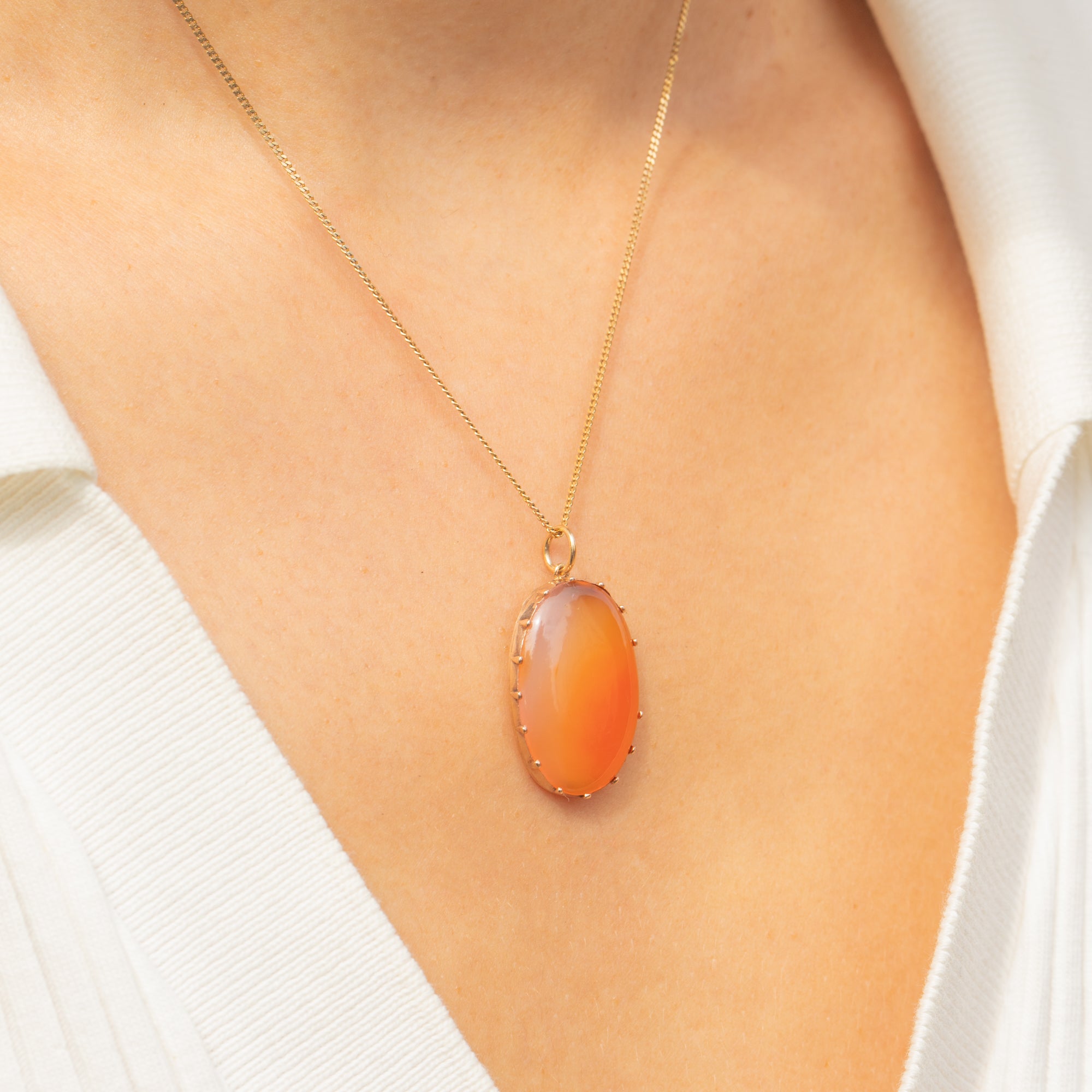 This Georgian pendant presents a striking oval cabochon Carnelian, its warm, natural hues ranging from soft honeyed translucence to deep orange. The stone is held securely in a delicate 9ct Gold claw setting, which allows the full play of colour and natural banding to show through with beautiful effect.
