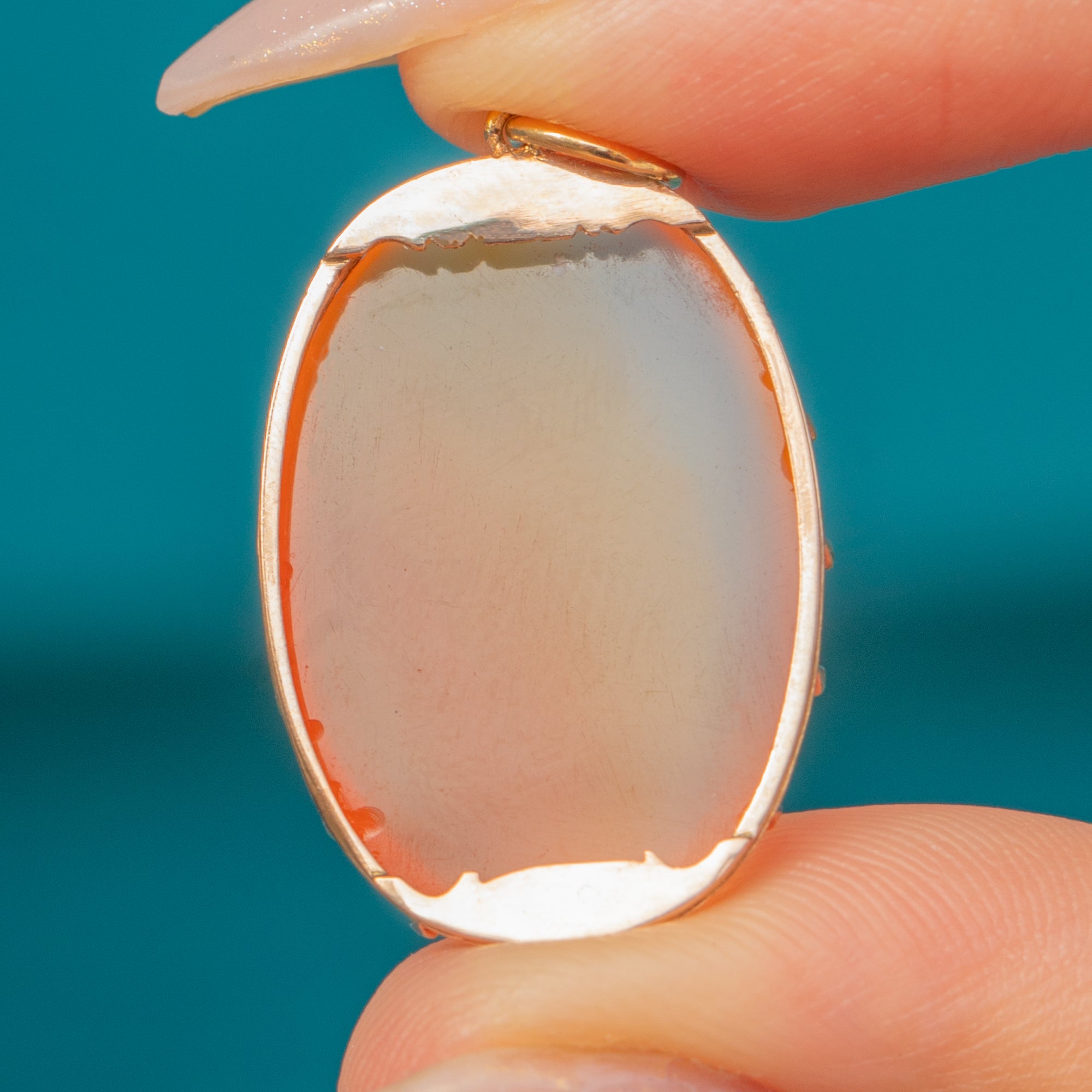 EXCELLENT: The Carnelian is smooth and free from chips or cracks, showing only minimal natural surface wear. One claw is missing but this does not compromise the security of the stone. The Gold setting remains in fine condition with good integrity, reflecting careful preservation for its age.