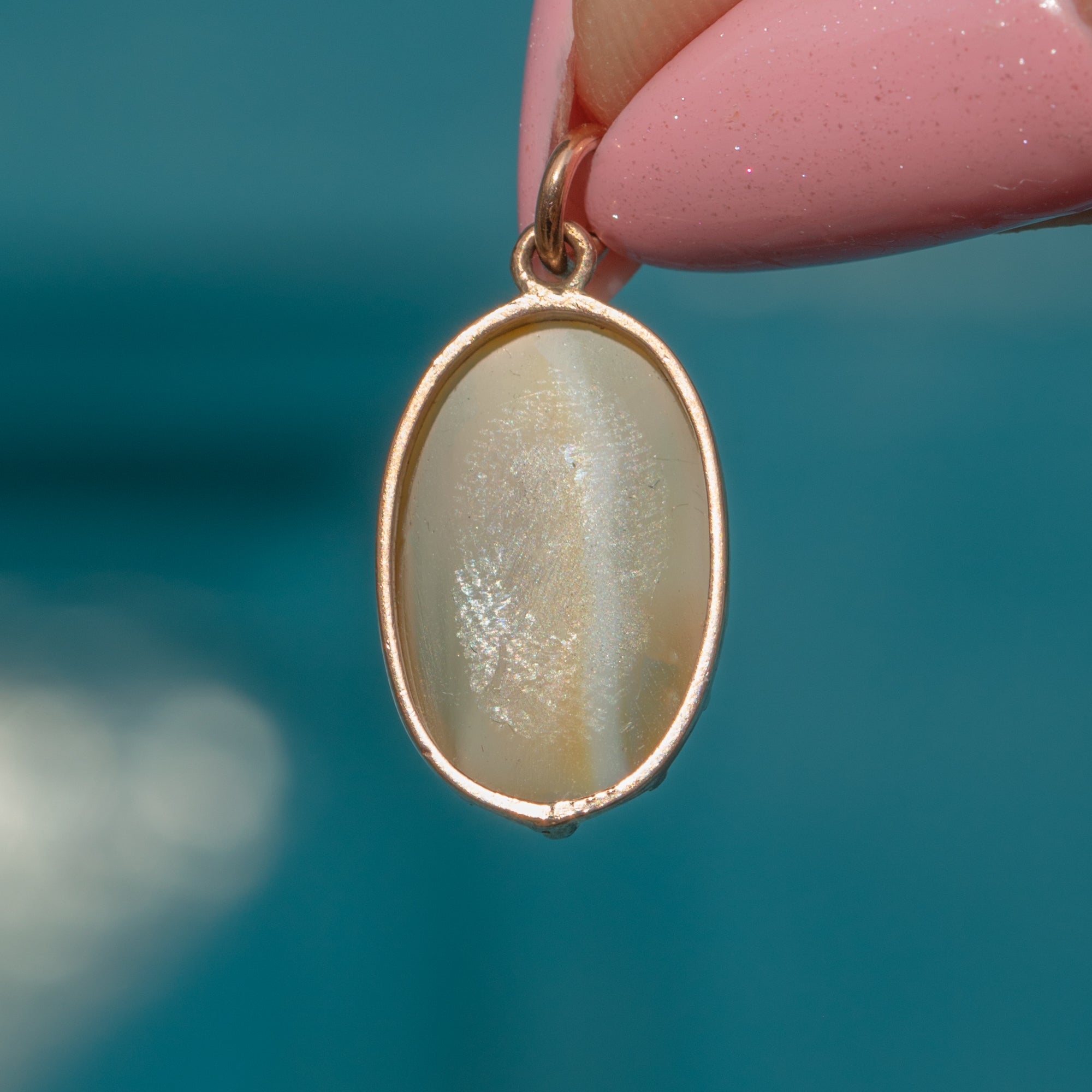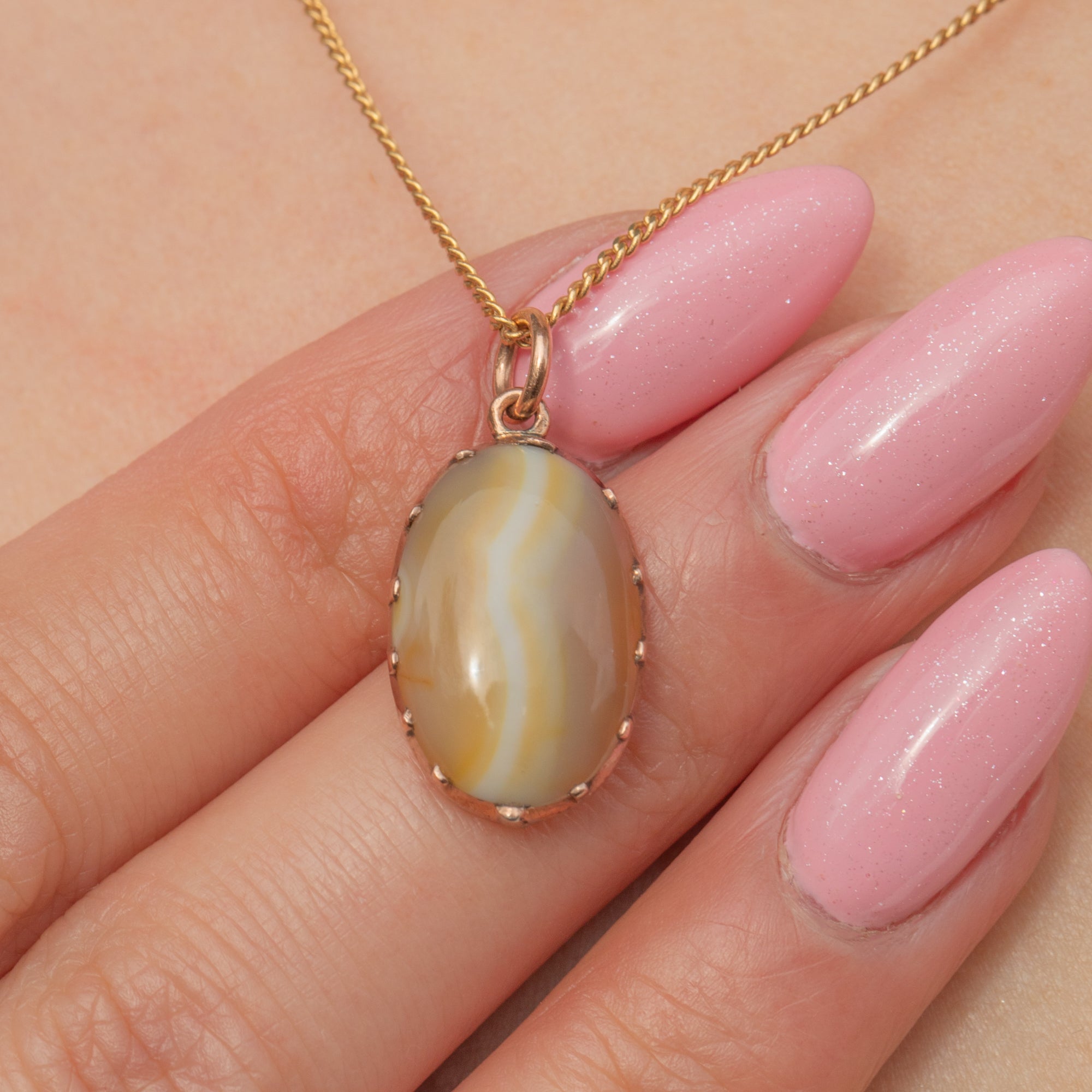 VERY GOOD-EXCELLENT: This Georgian 9ct Gold cased Agate charm is in lovely condition. The Agate is radiant and free from any scuffs or scratches. There is some light surface wear to the 9ct cased Gold setting, though this is minor and commensurate with age. With a secure jump ring, she can be worn with confidence!