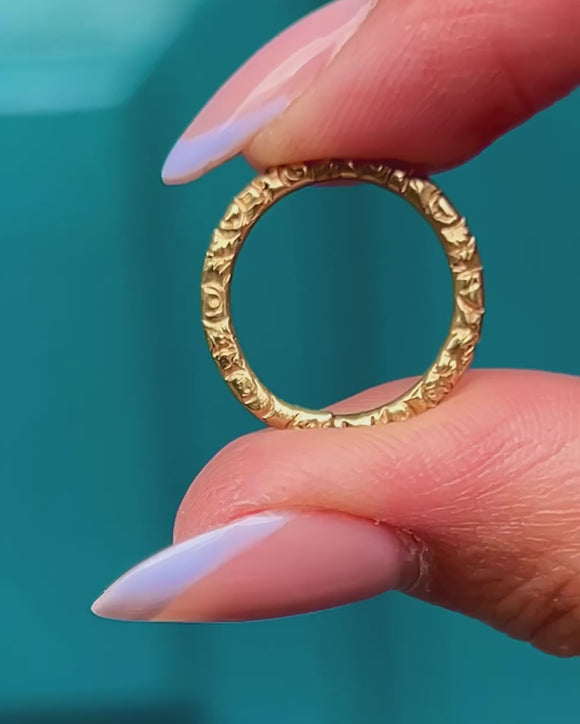 This is a lovely Georgian 9ct Gold chased split ring! Featuring stunning chased detailing adorning the entire circumference, this solid Gold split ring is the perfect antique piece for your collection.