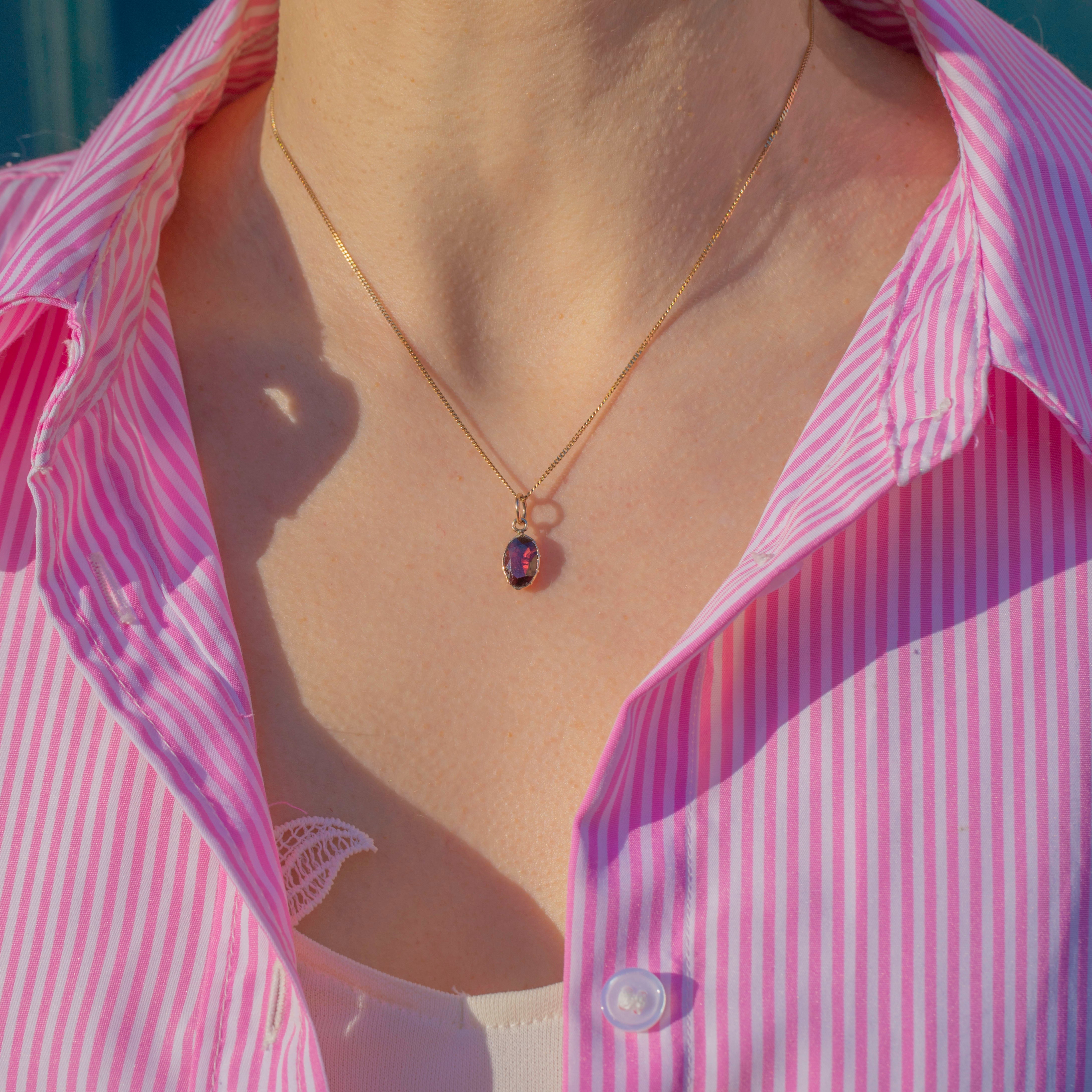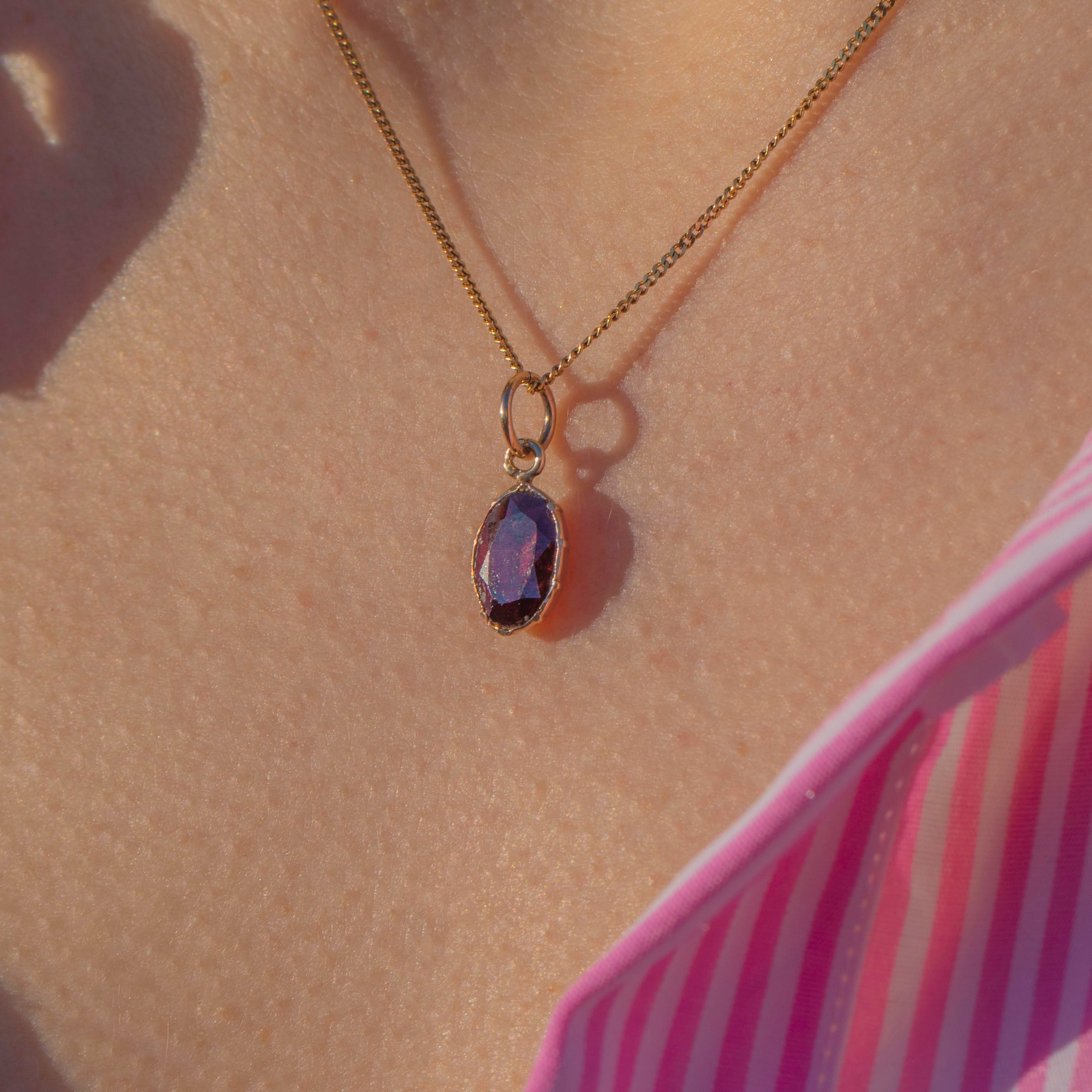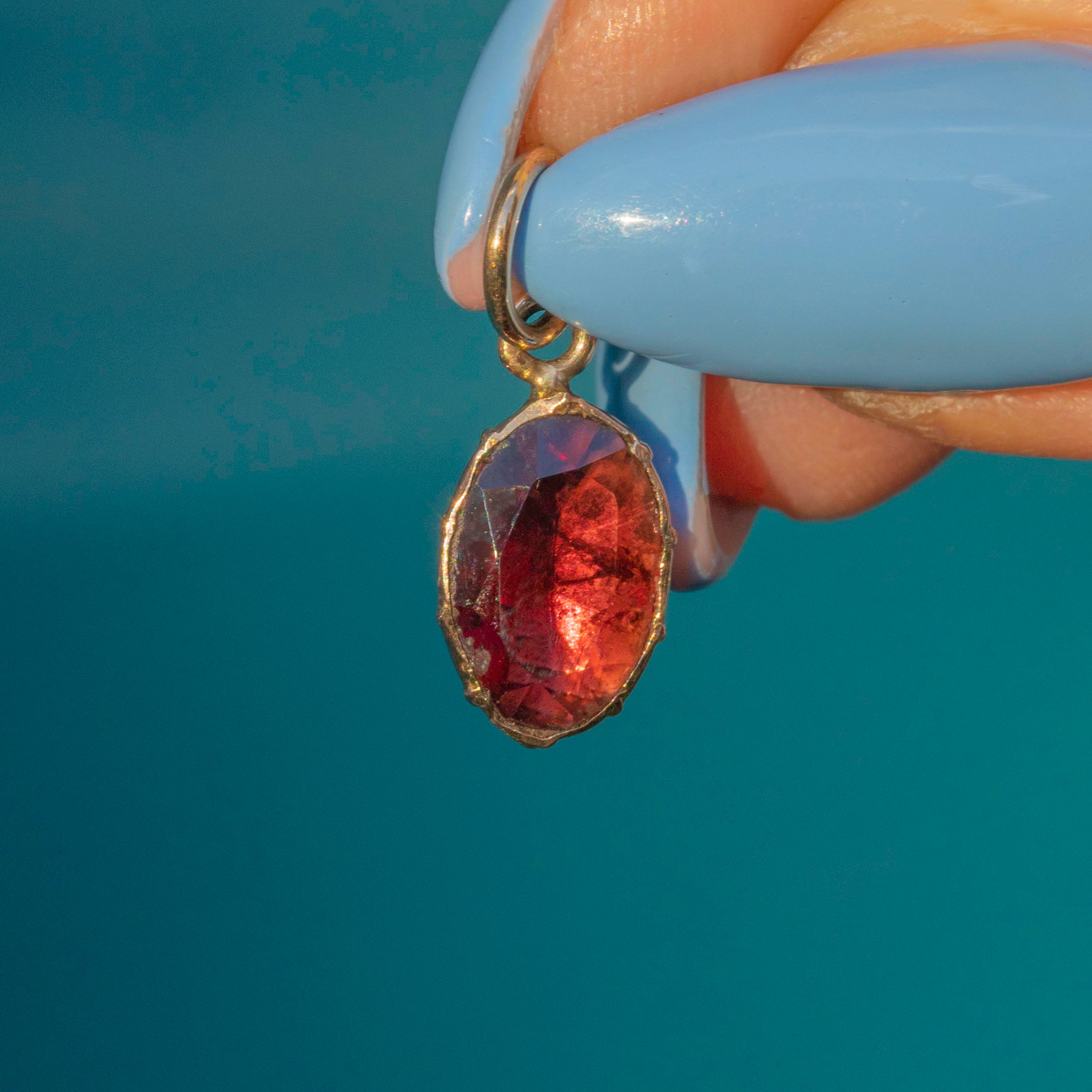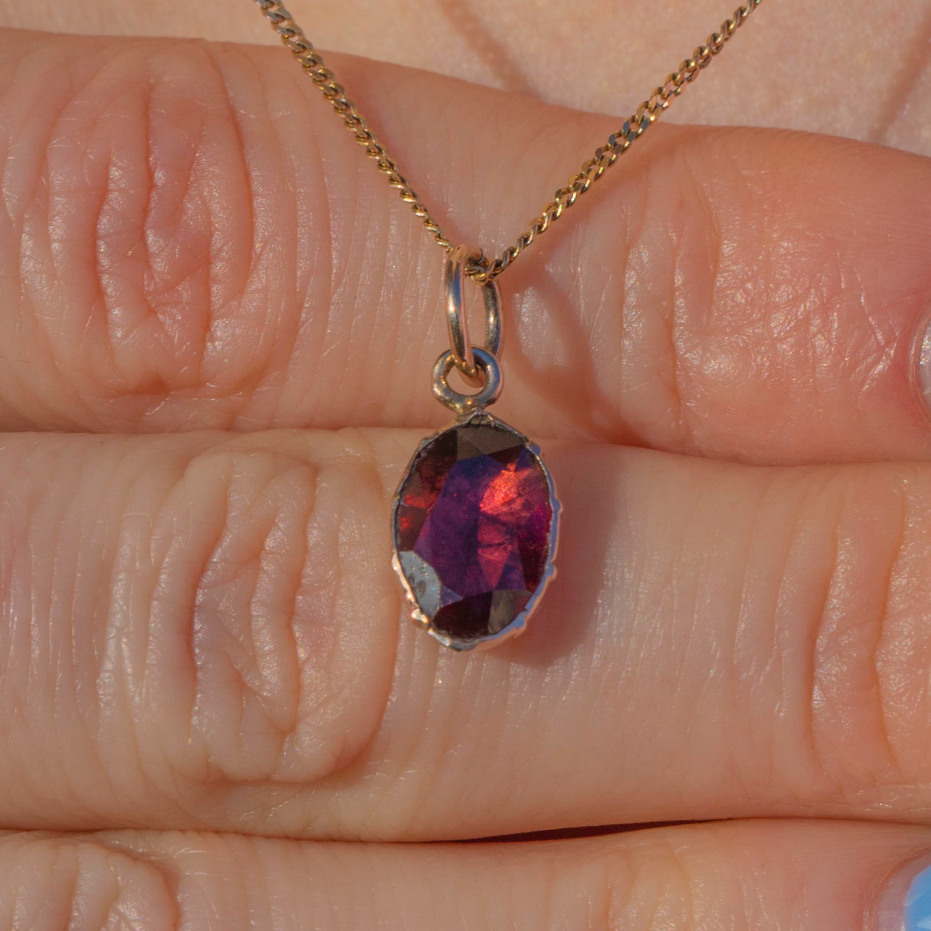 Add a slice of elegance to your repertoire with this dainty Georgian 9ct Gold flat-cut Garnet charm! The 0.44ct Garnet displays a deep burgundy hue, revealing flashes of crimson as the foiled back catches the light.