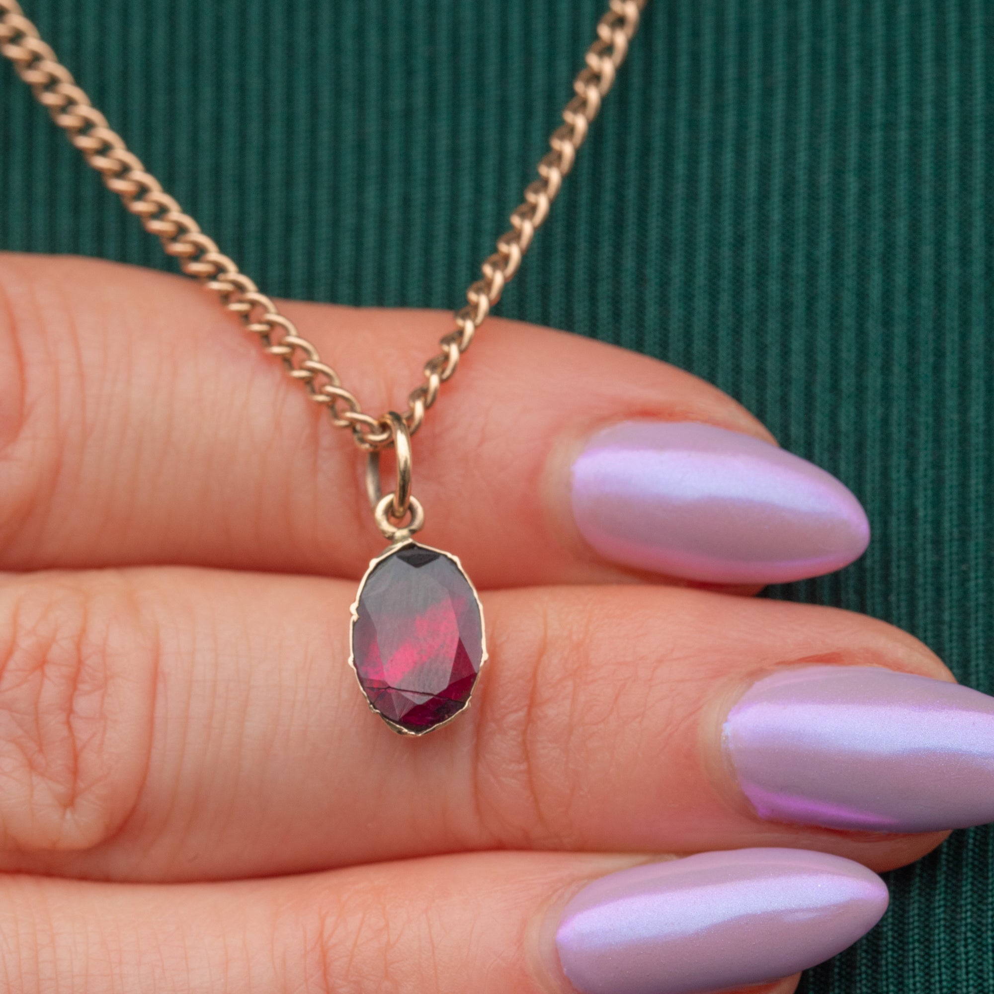 The 0.65ct Garnet has a striking crimson intensity, enhanced by its foiled back, and is displayed within a classically Georgian piecrust setting. She looks wonderful when hanging from a fine Gold chain, which can be worn on both casual and dressy occasions!