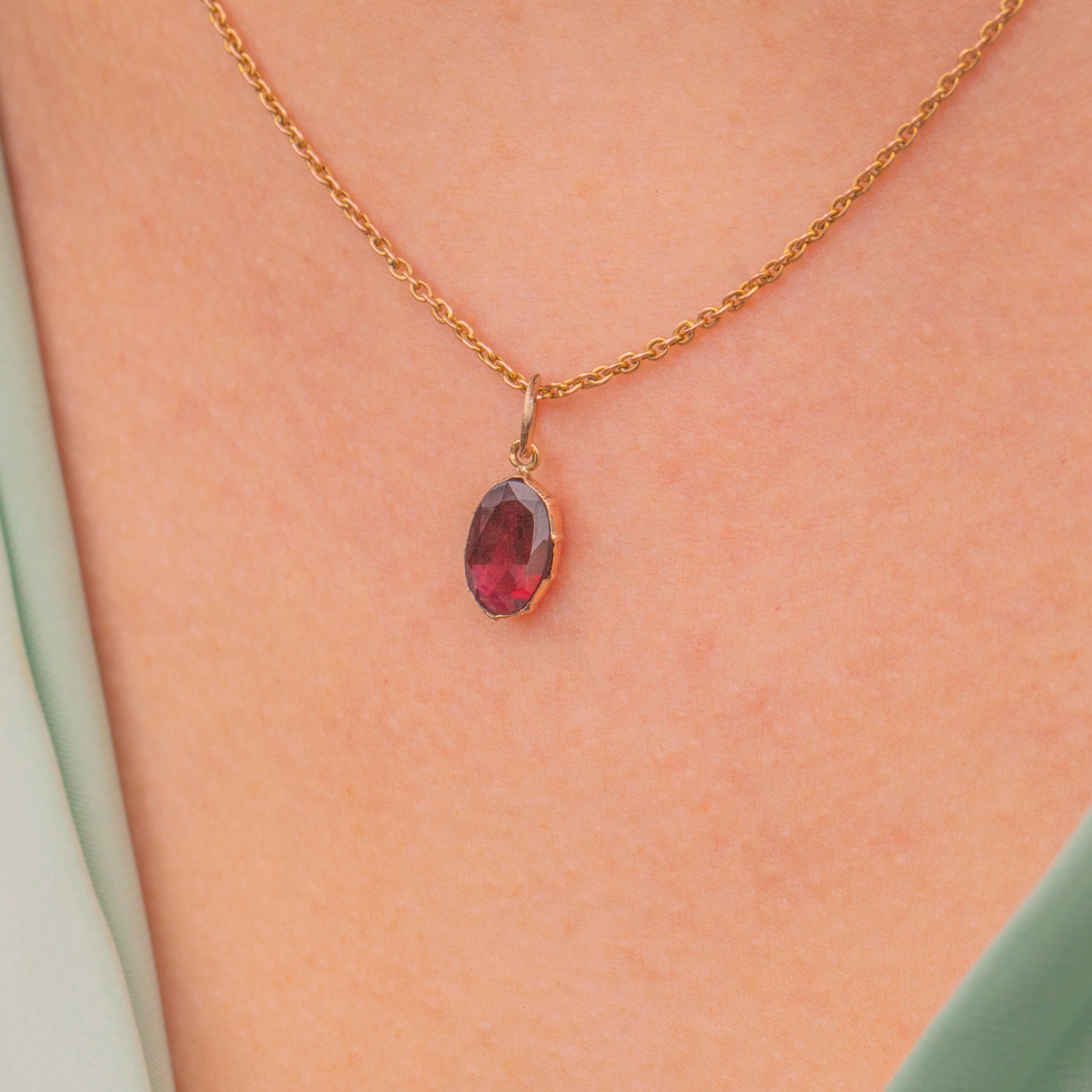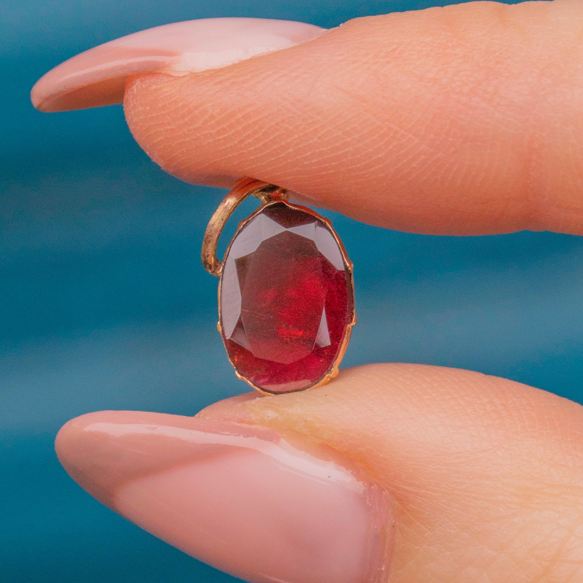 EXCELLENT. This Georgian 9ct Gold flat-cut Garnet charm is in excellent condition! Her foiled Garnet is vibrant and free from any chips or scuffs, and sits securely within her 9ct Gold collet. With little else to note, she is a delight!