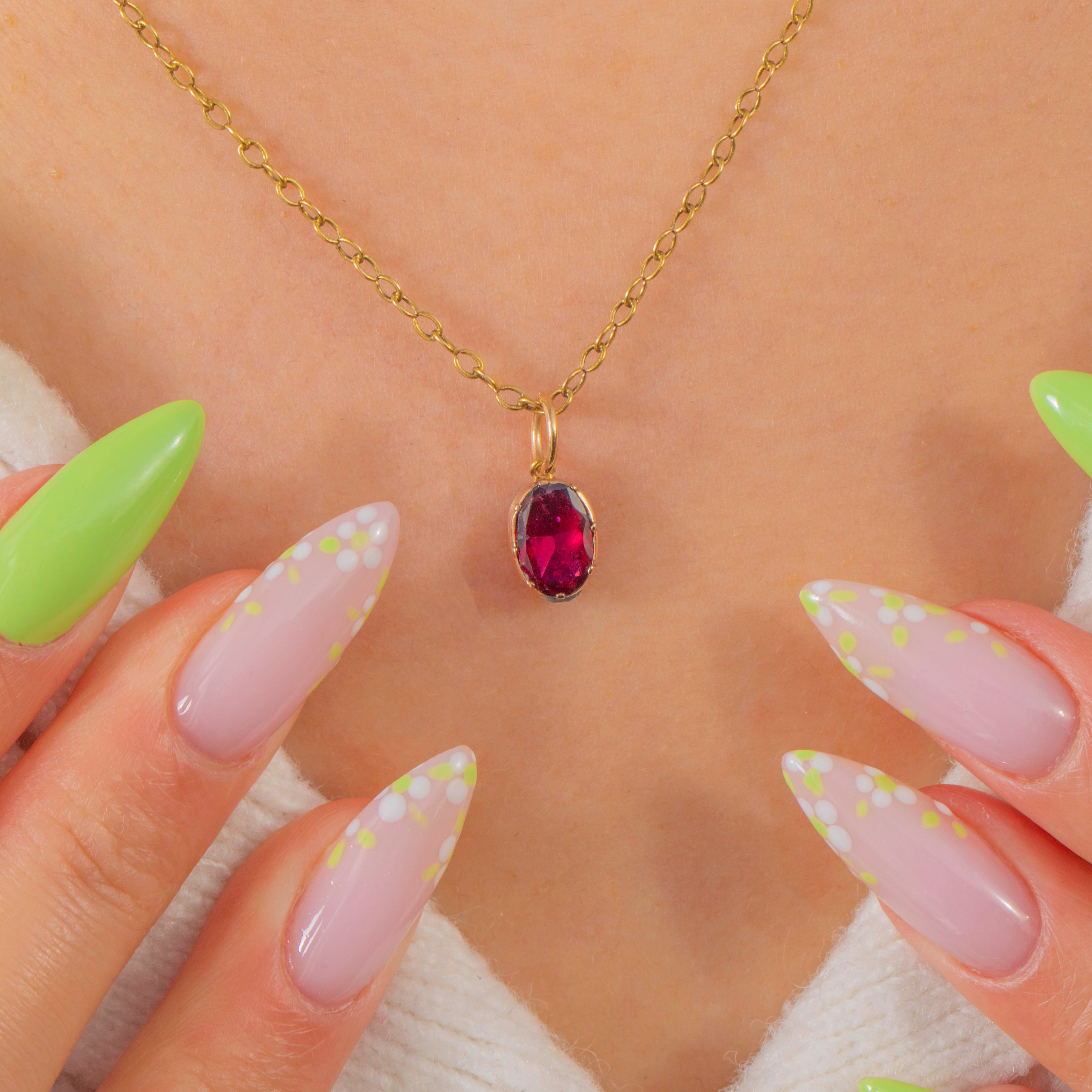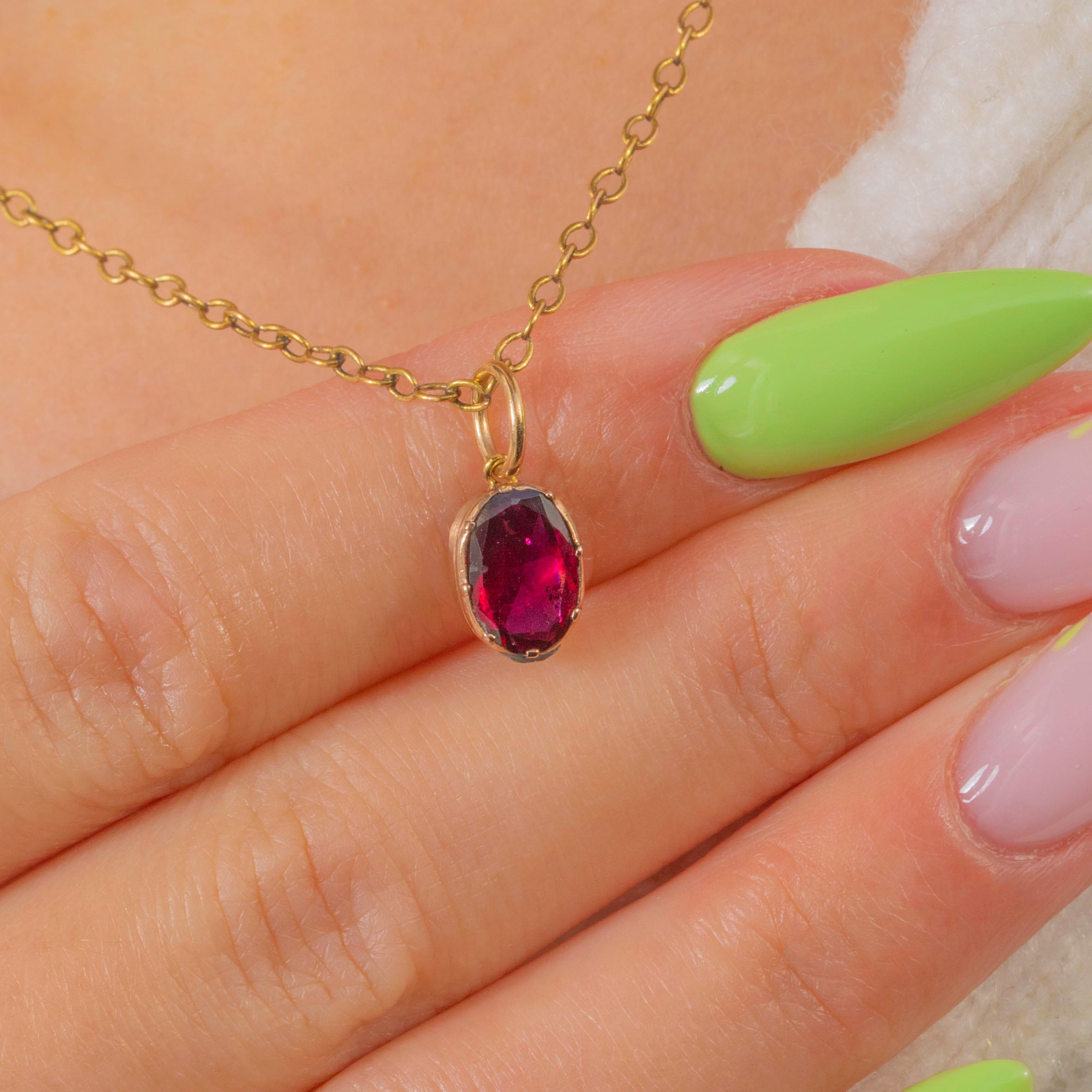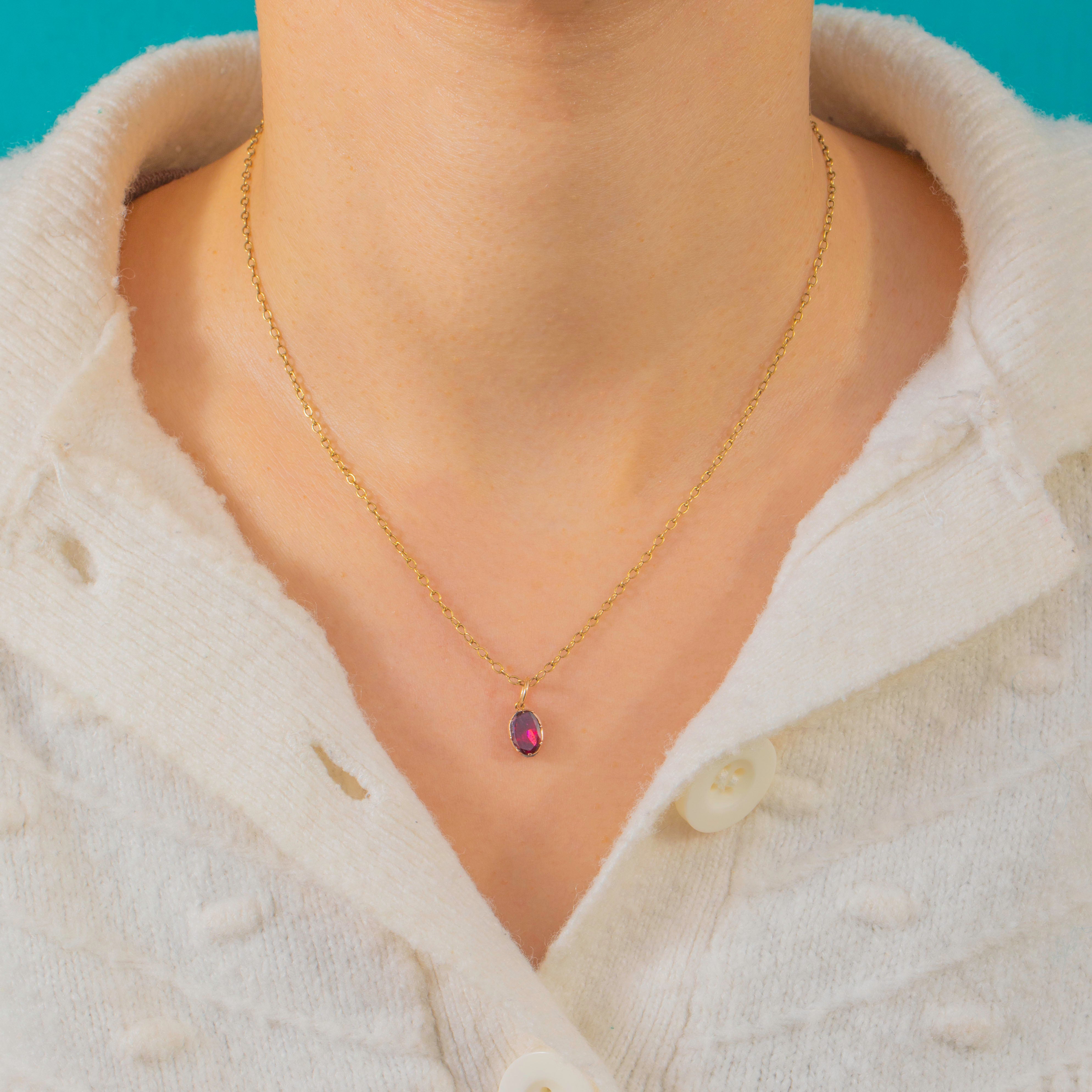 Petite and oh‑so elegant, this Georgian charm centres on a richly hued flat‑cut Garnet of approximately 0.75ct. The oval stone glows a deep claret red and is cradled in a refined 9ct Gold collet, its smooth silhouette offering timeless simplicity with a luxurious finish.