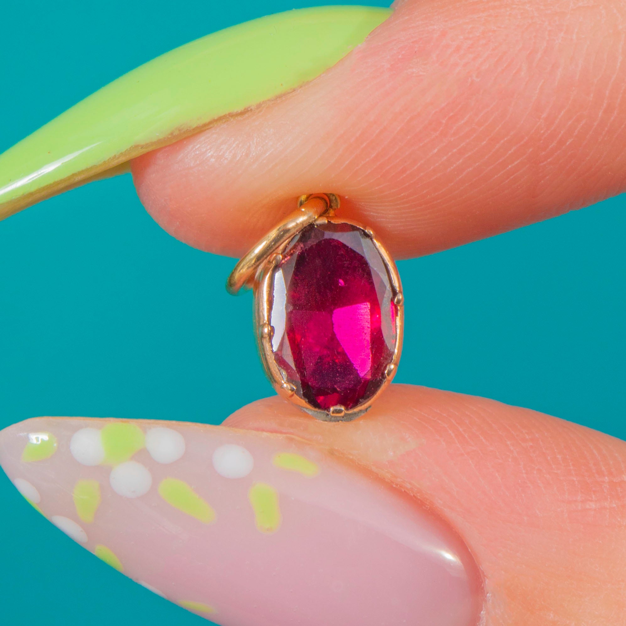 EXCELLENT: The Garnet is bright with minimal surface wear visible only under magnification. The 9ct Gold collet and jump ring are secure with crisp edges and a smooth finish. No signs of repair; overall beautifully preserved for its age.