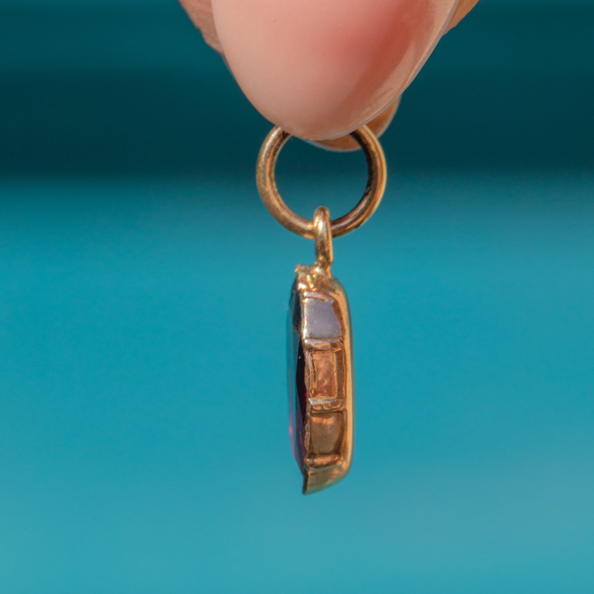 EXCELLENT This Georgian 9ct Gold flat-cut Garnet charm is wonderfully preserved, with next to nothing to report. The foiling is in perfect condition, and the Garnet, securely set, shines with a rich, berry-red hue that’s simply delightful.