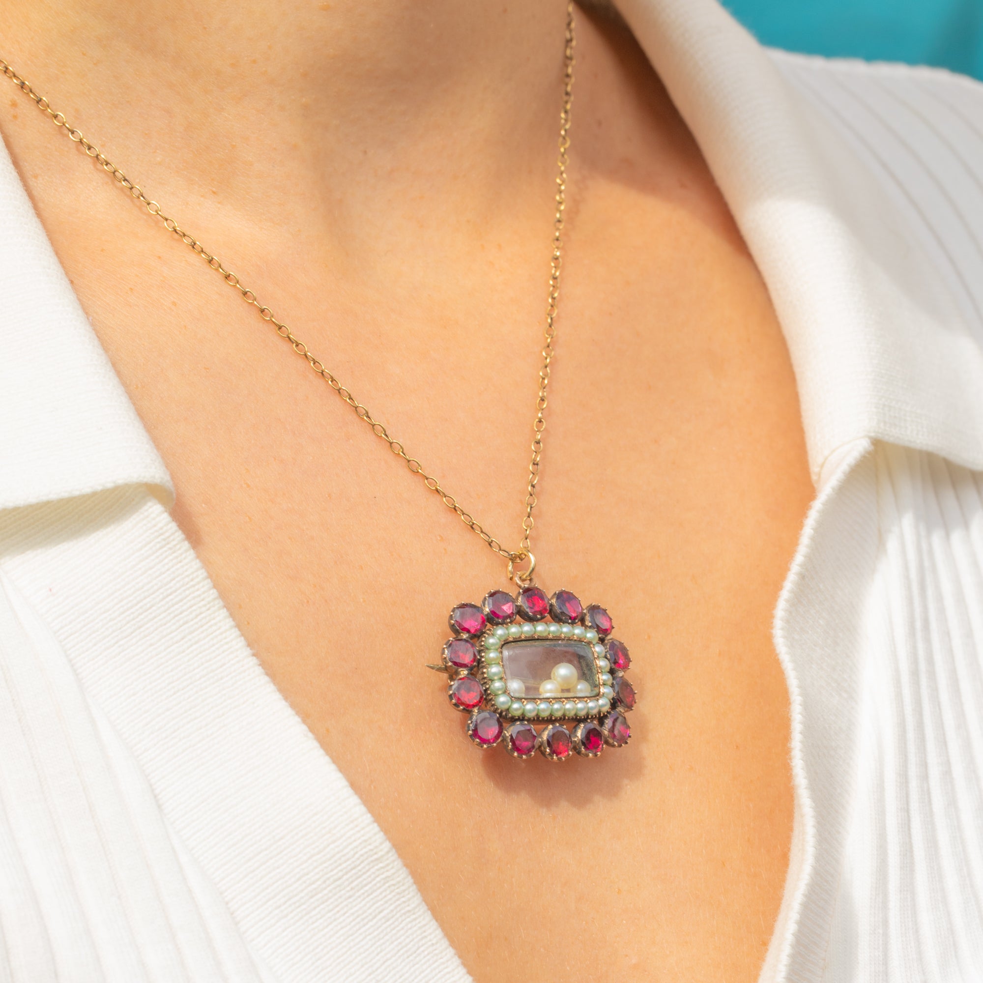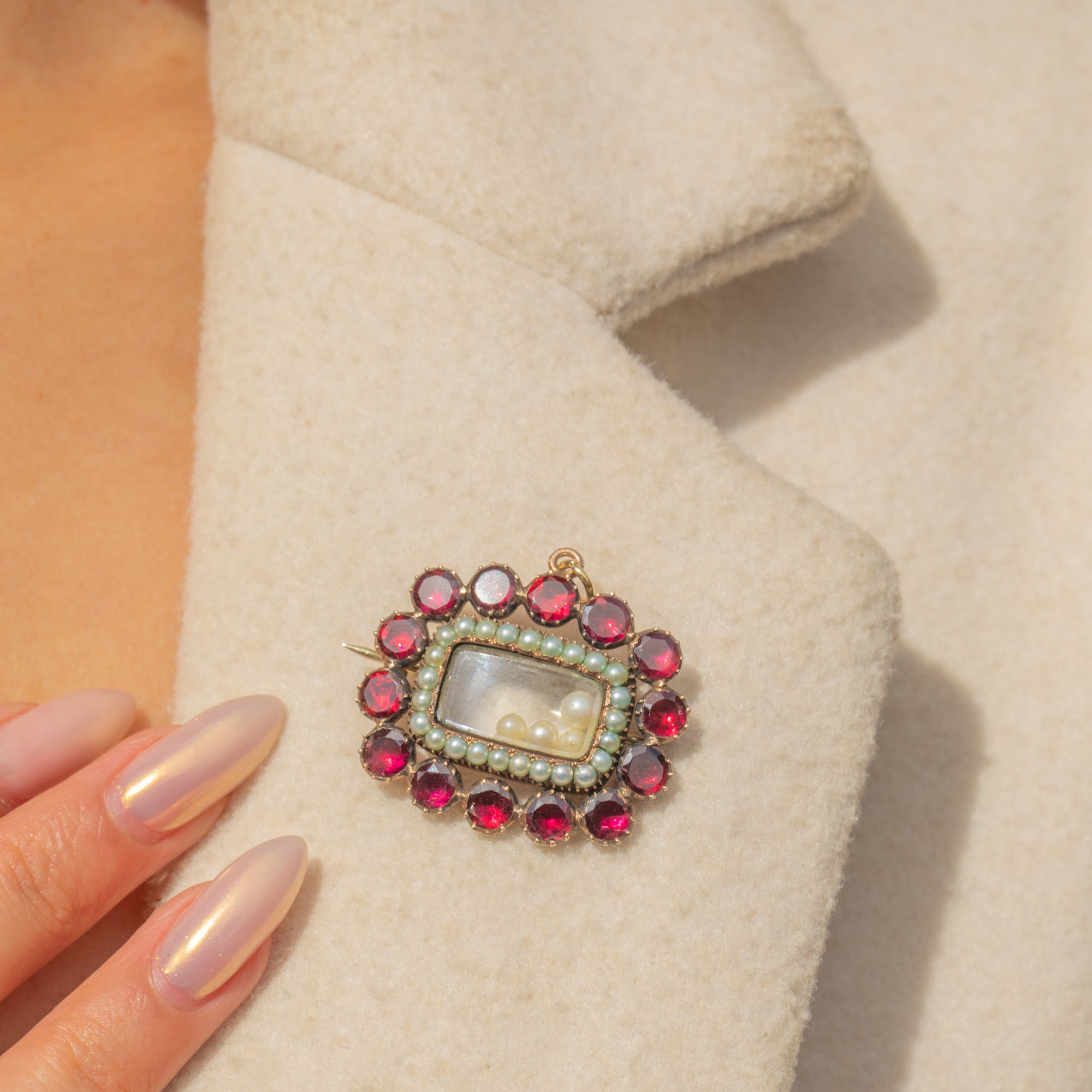 A magnificent Georgian locket-back pendant set with glowing flat-cut Garnets and a delicate border of Natural Pearls. The Garnets, foiled in the traditional Georgian manner, radiate rich cranberry and crimson hues, sparkling with life and depth. At the centre lies a glass-fronted locket compartment, containing tiny drilled Pearls, a touching memento of the past.