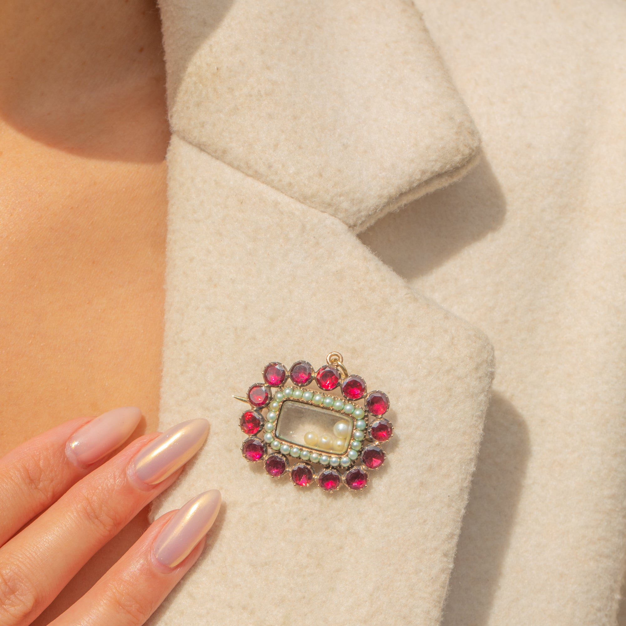 EXCELLENT: The Garnets are vibrant with intact foiling, full of colour and sparkle. The Pearls are lustrous and well-matched. The locket back closes securely, and all original fittings remain intact. Remarkably well-preserved for its age.