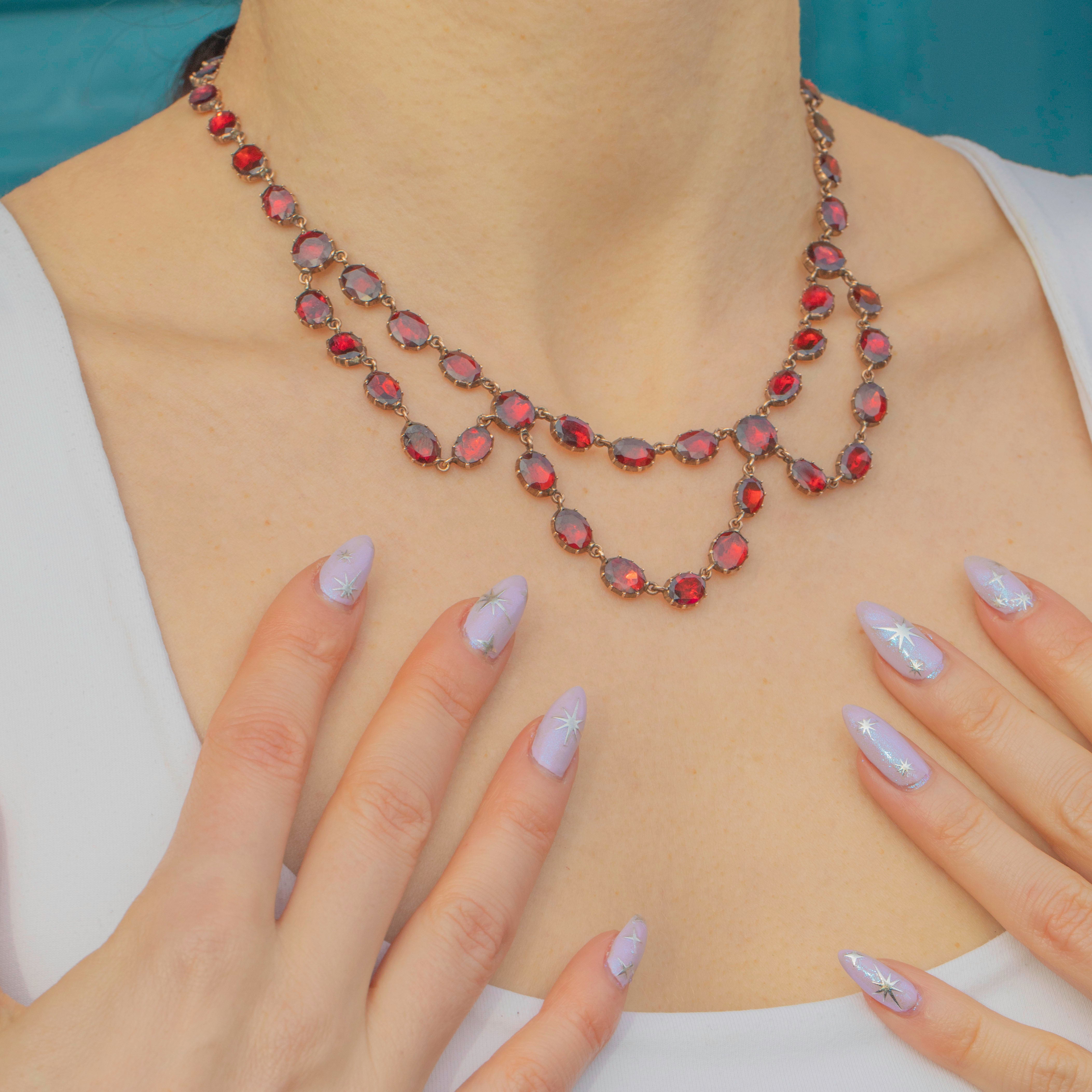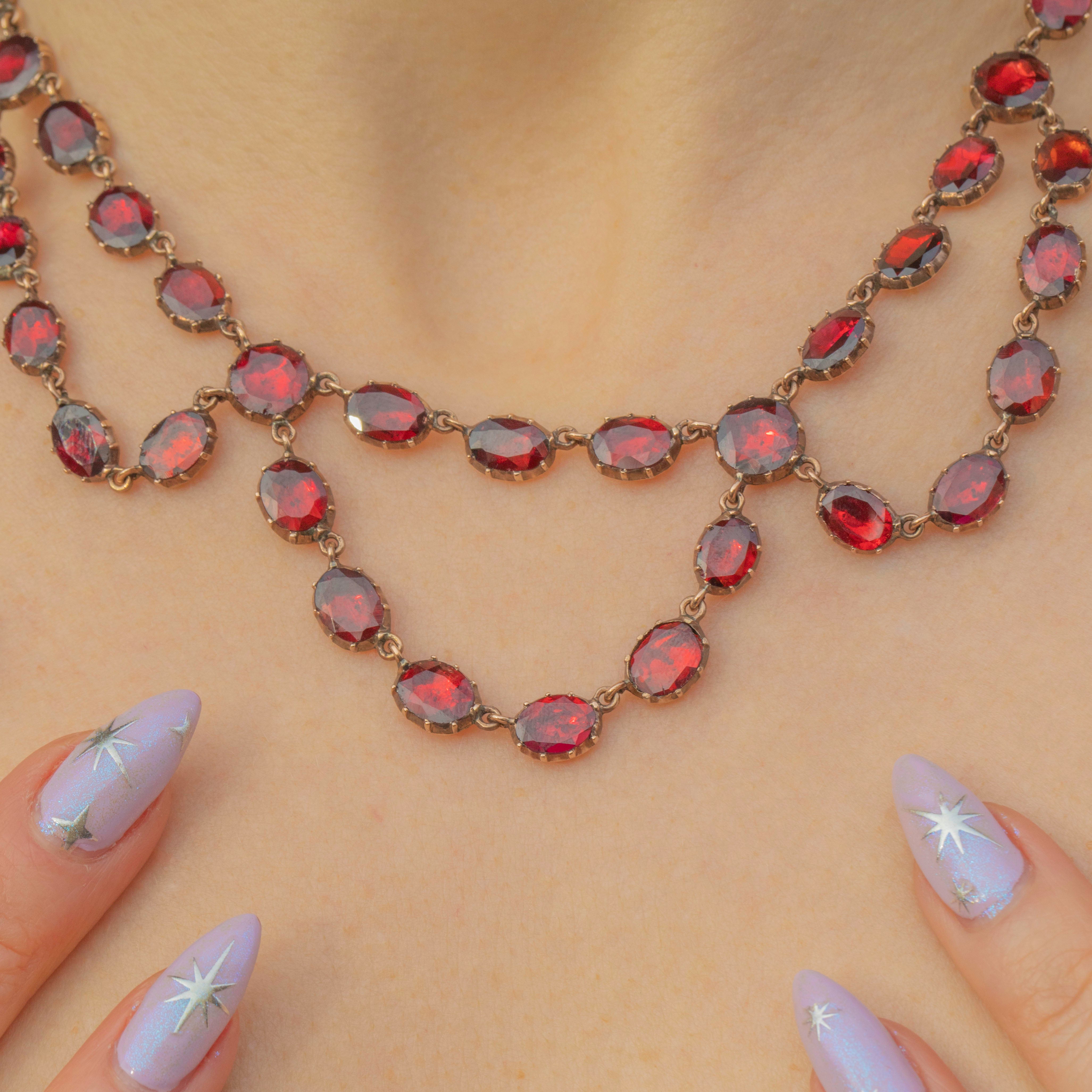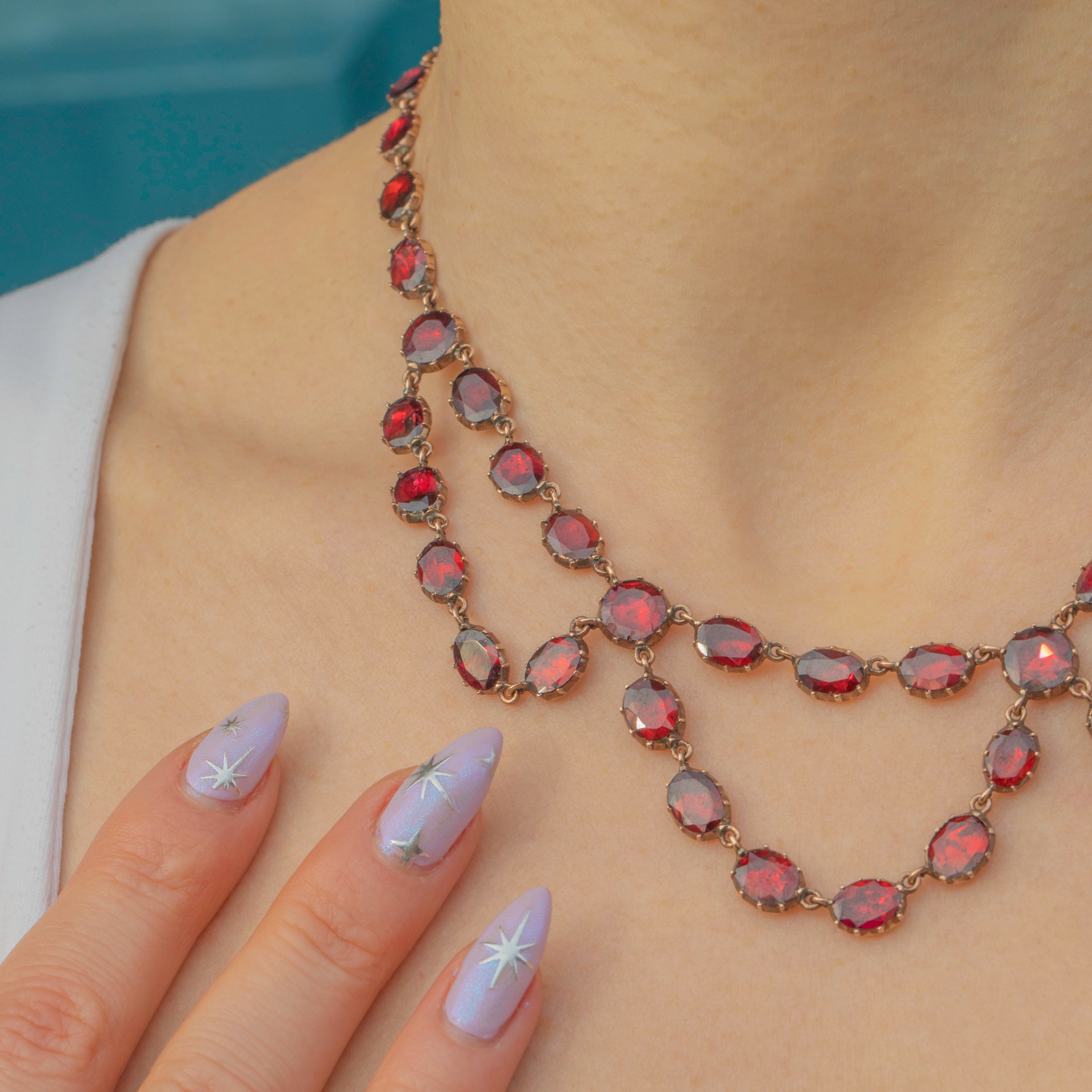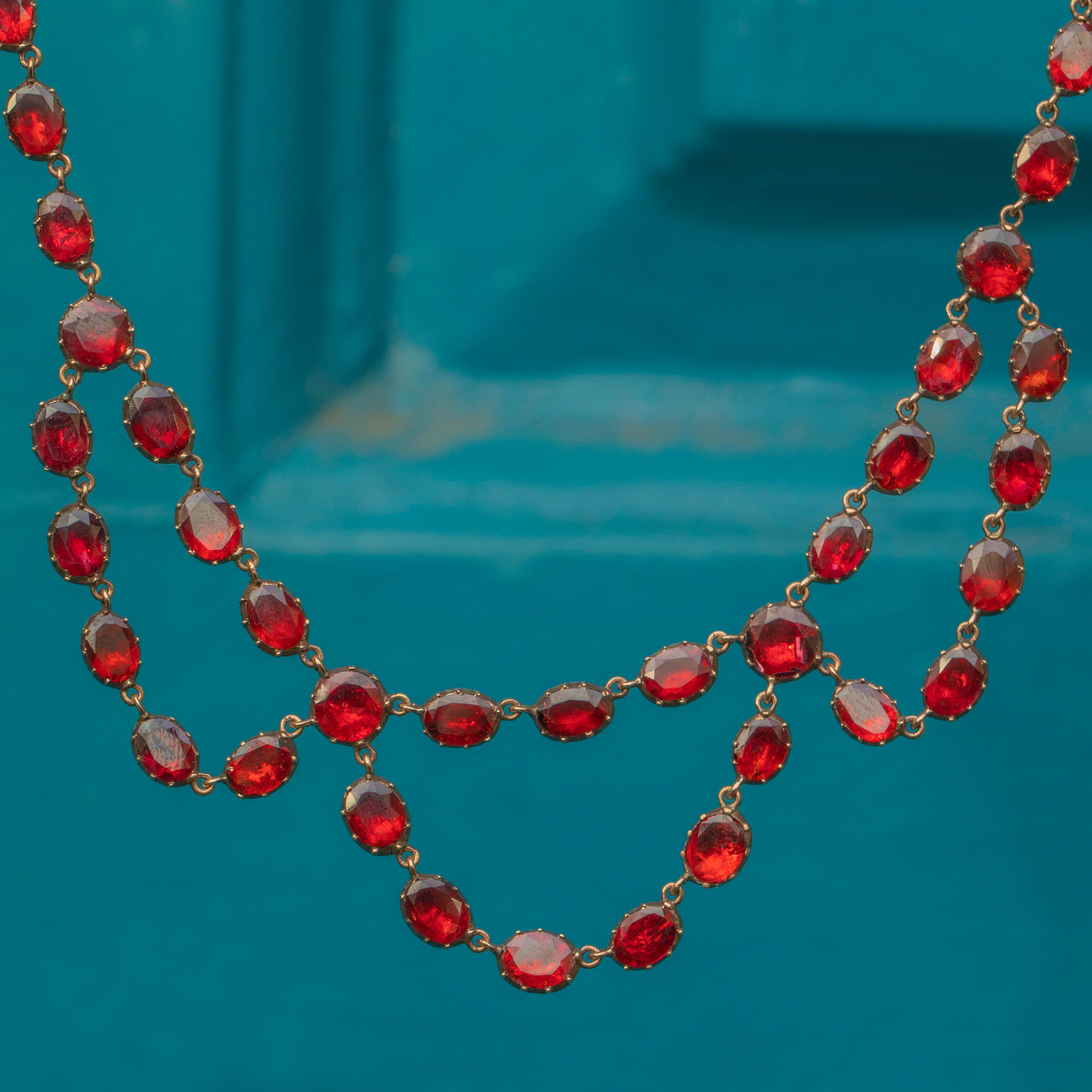 This ravishing swag necklace is over 200 years old, yet has retained every inch of her splendour! Each flat-cut Garnet has been foiled to perfection, with every single one exuding a mouthwatering cherry red hue. Every Garnet is securely set in a classically Georgian piecrust setting, a testament to the Georgian's fine ability for craftsmanship!