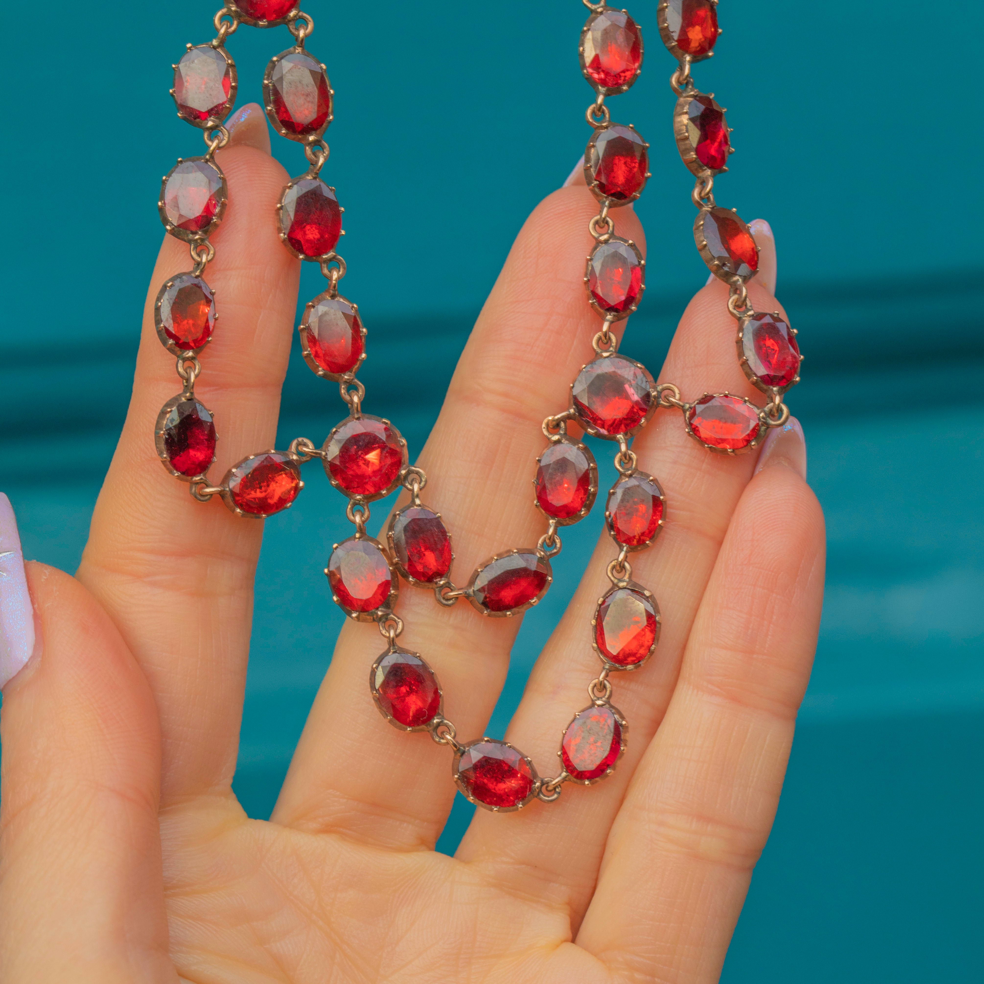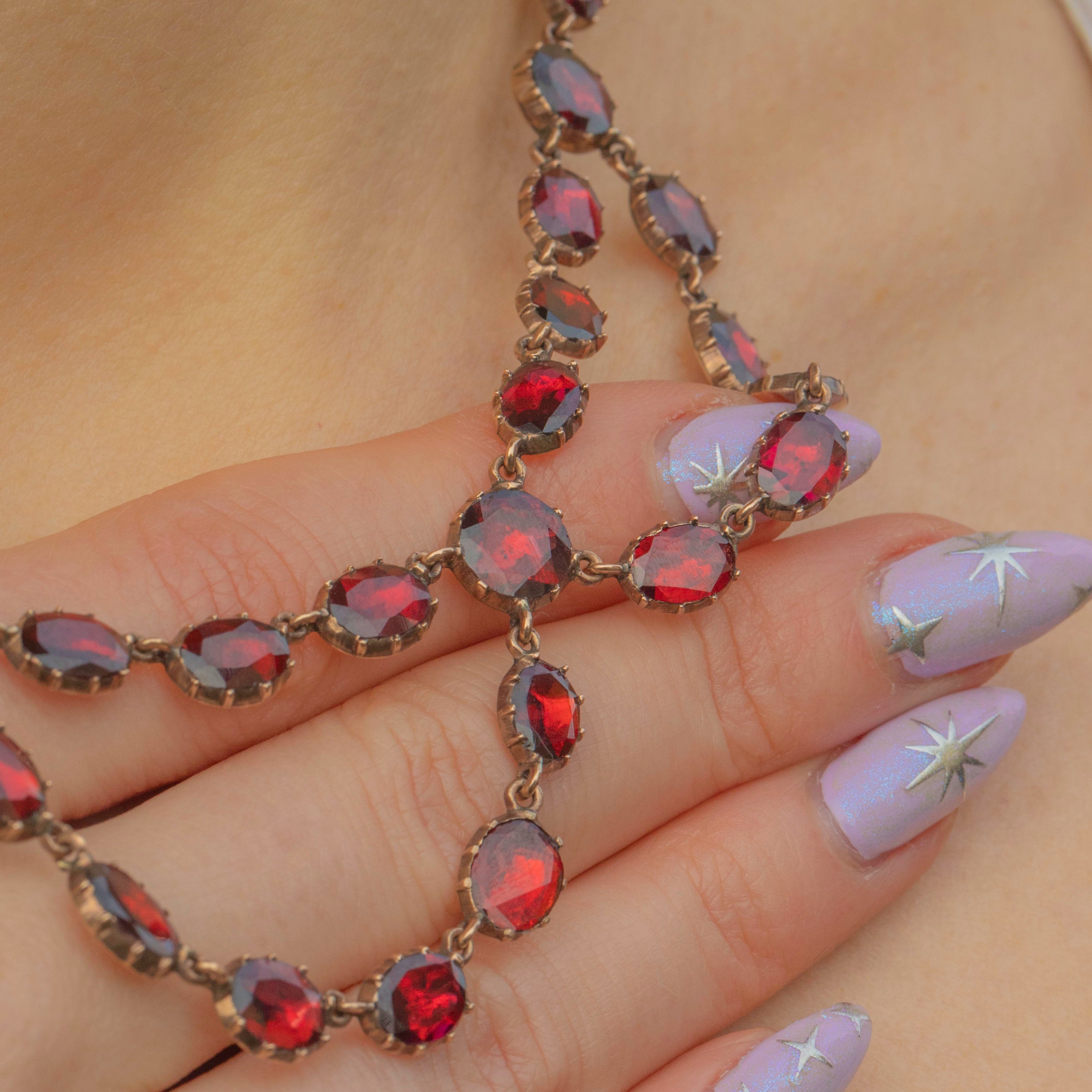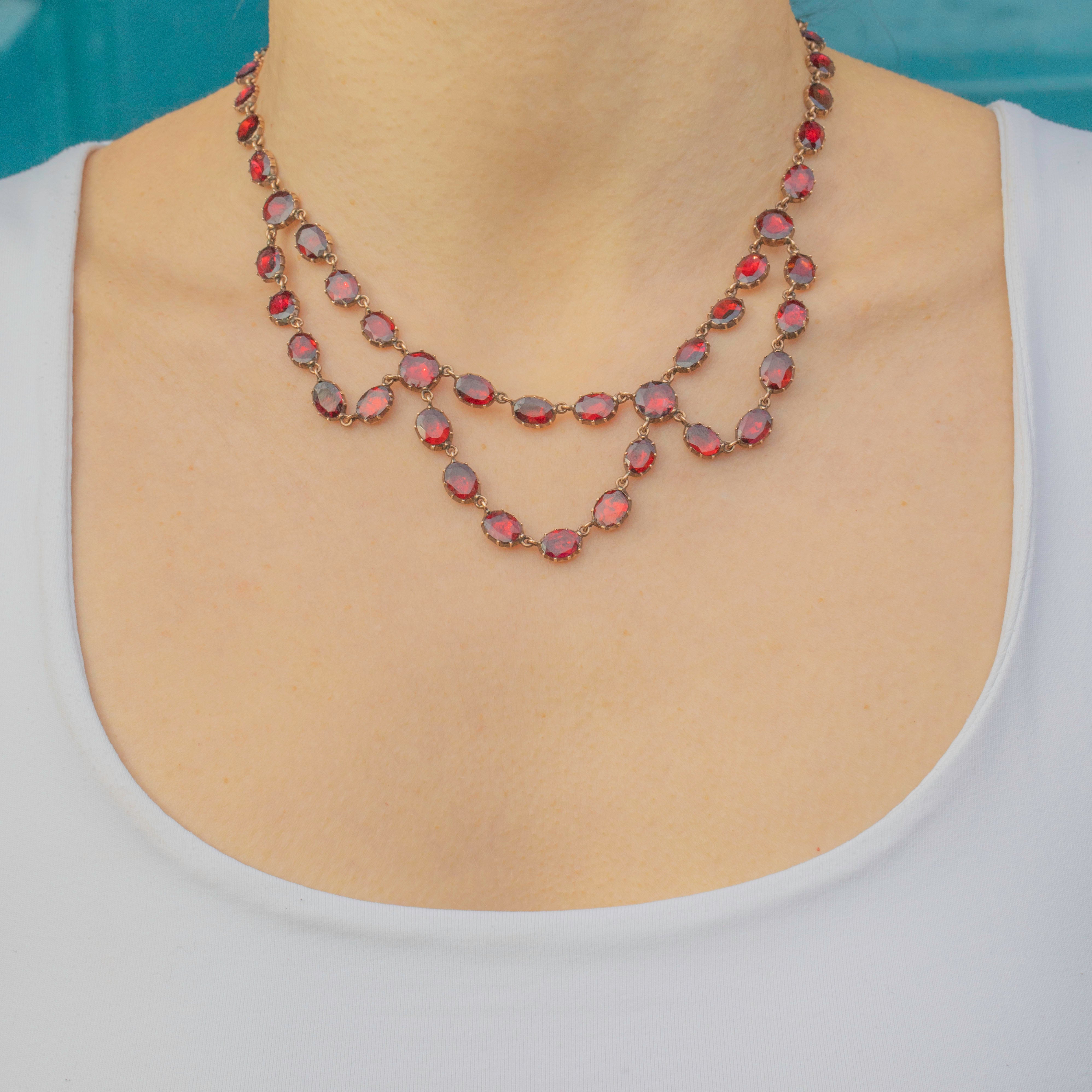 This ravishing swag necklace is over 200 years old, yet has retained every inch of her splendour! Each flat-cut Garnet has been foiled to perfection, with every single one exuding a mouthwatering cherry red hue. Every Garnet is securely set in a classically Georgian piecrust setting, a testament to the Georgian's fine ability for craftsmanship!