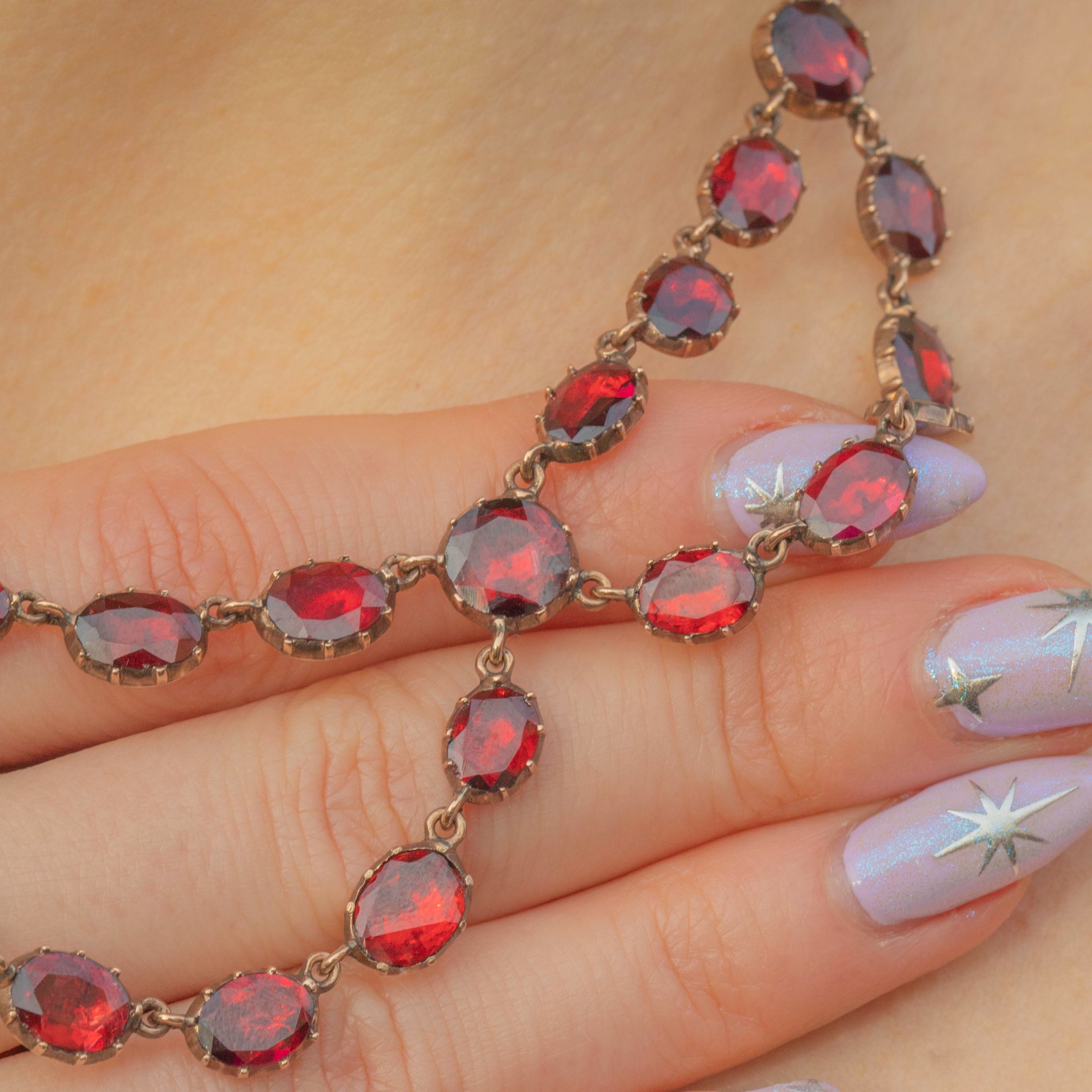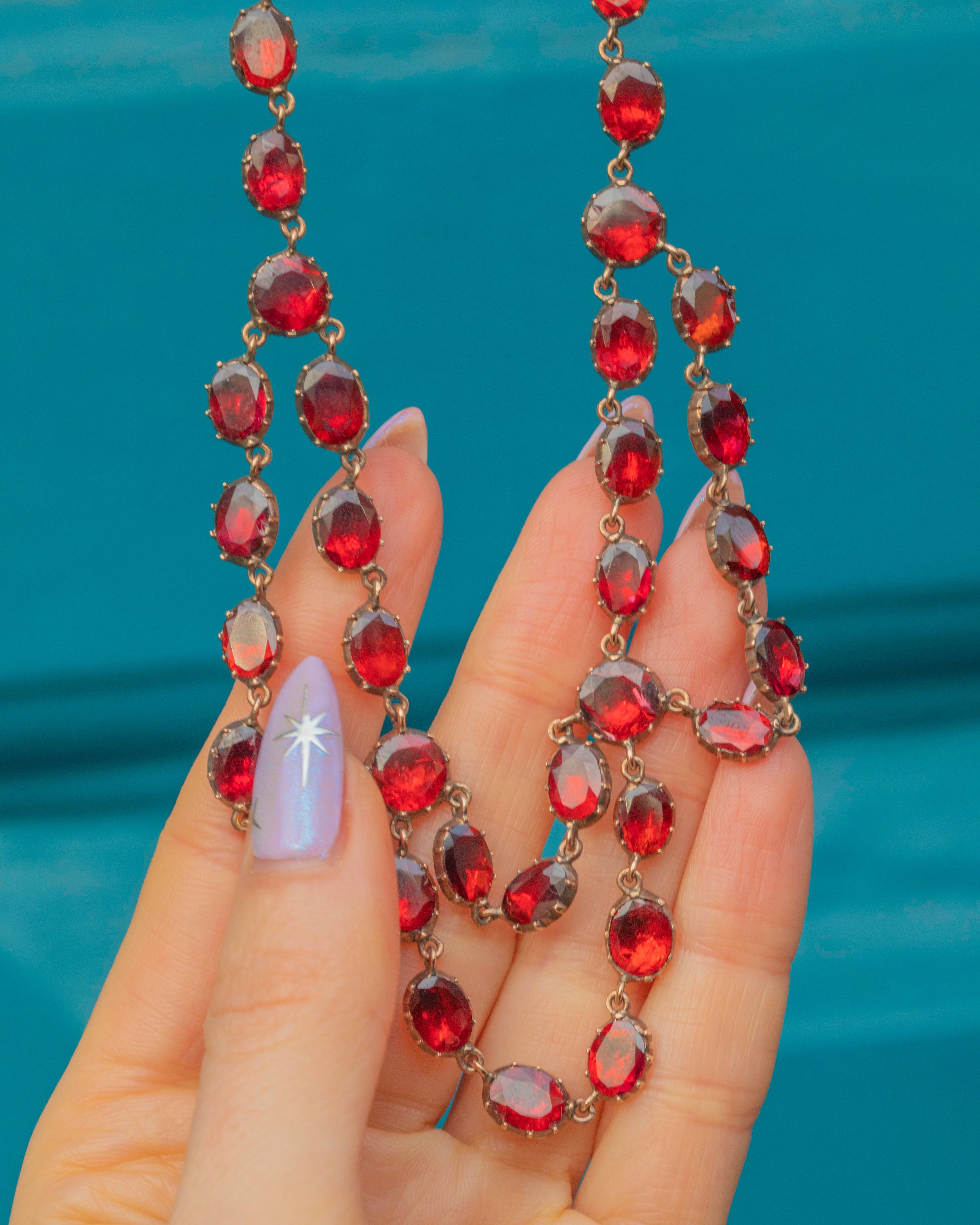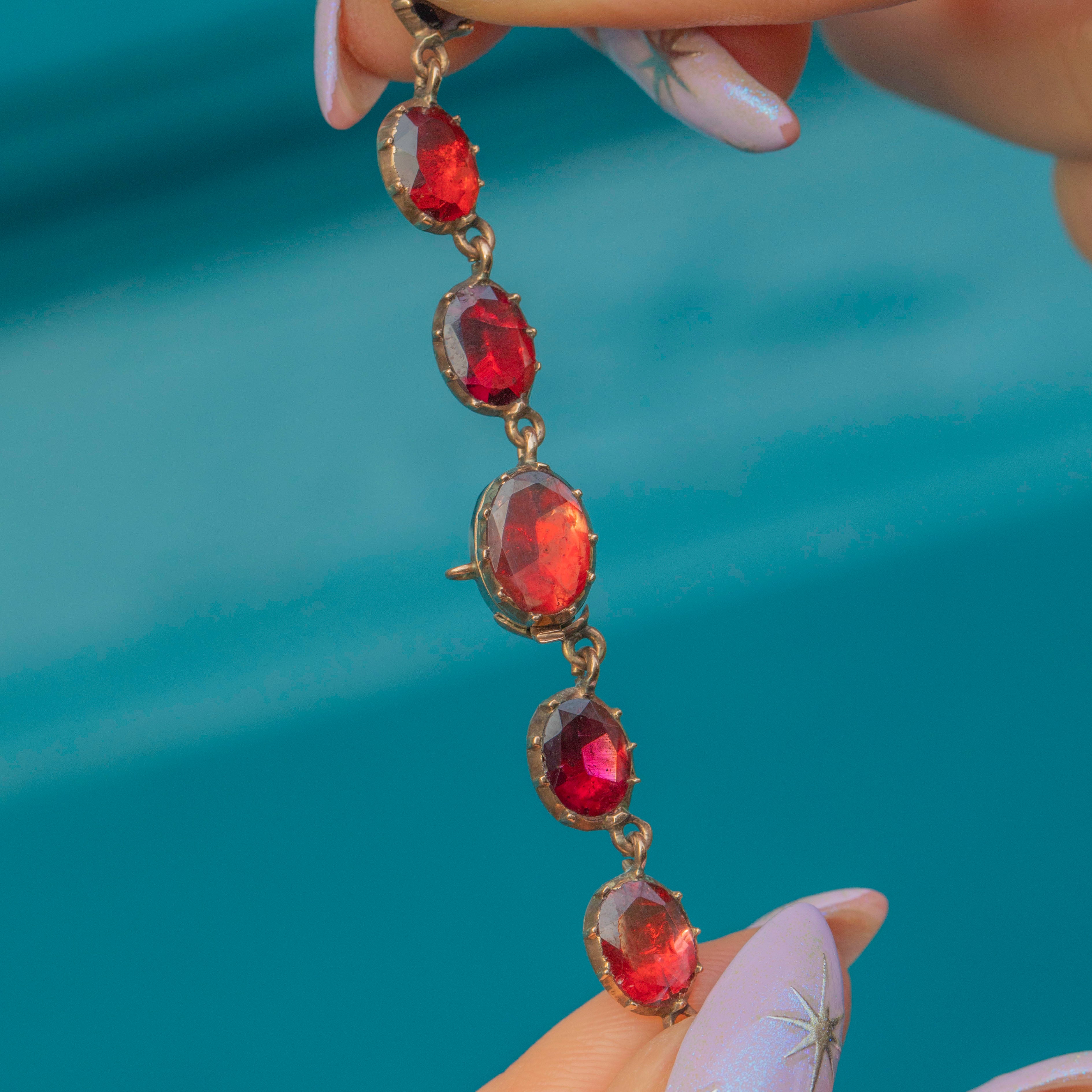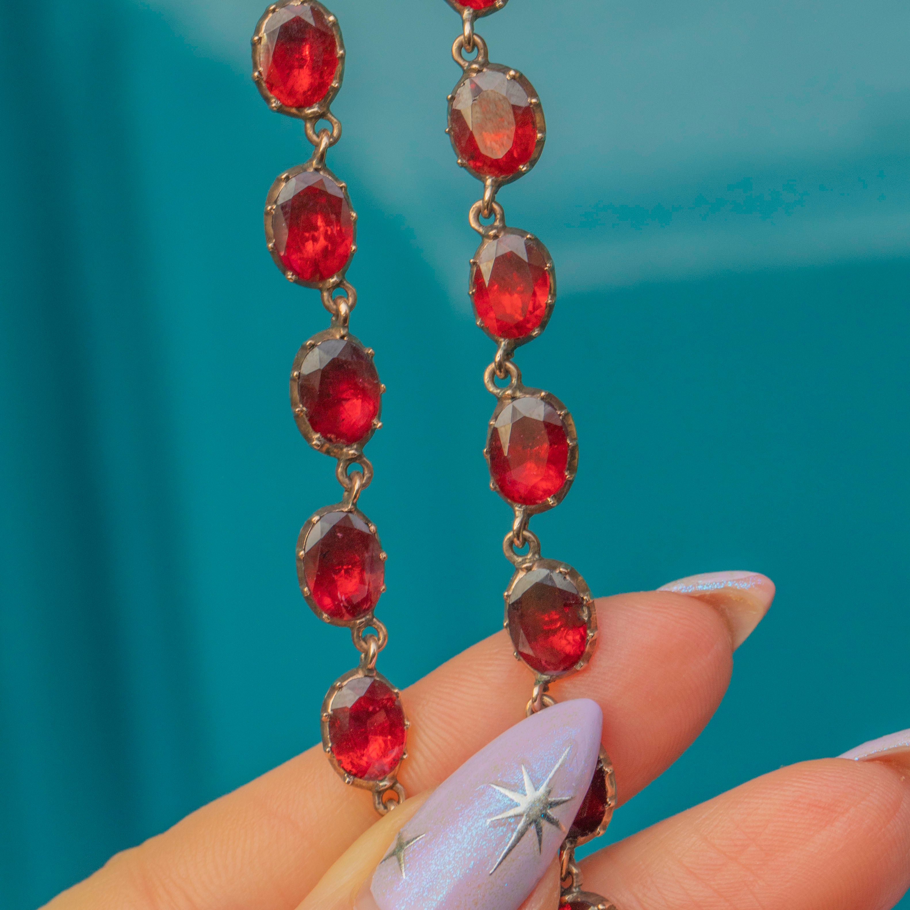 This ravishing swag necklace is over 200 years old, yet has retained every inch of her splendour! Each flat-cut Garnet has been foiled to perfection, with every single one exuding a mouthwatering cherry red hue. Every Garnet is securely set in a classically Georgian piecrust setting, a testament to the Georgian's fine ability for craftsmanship!