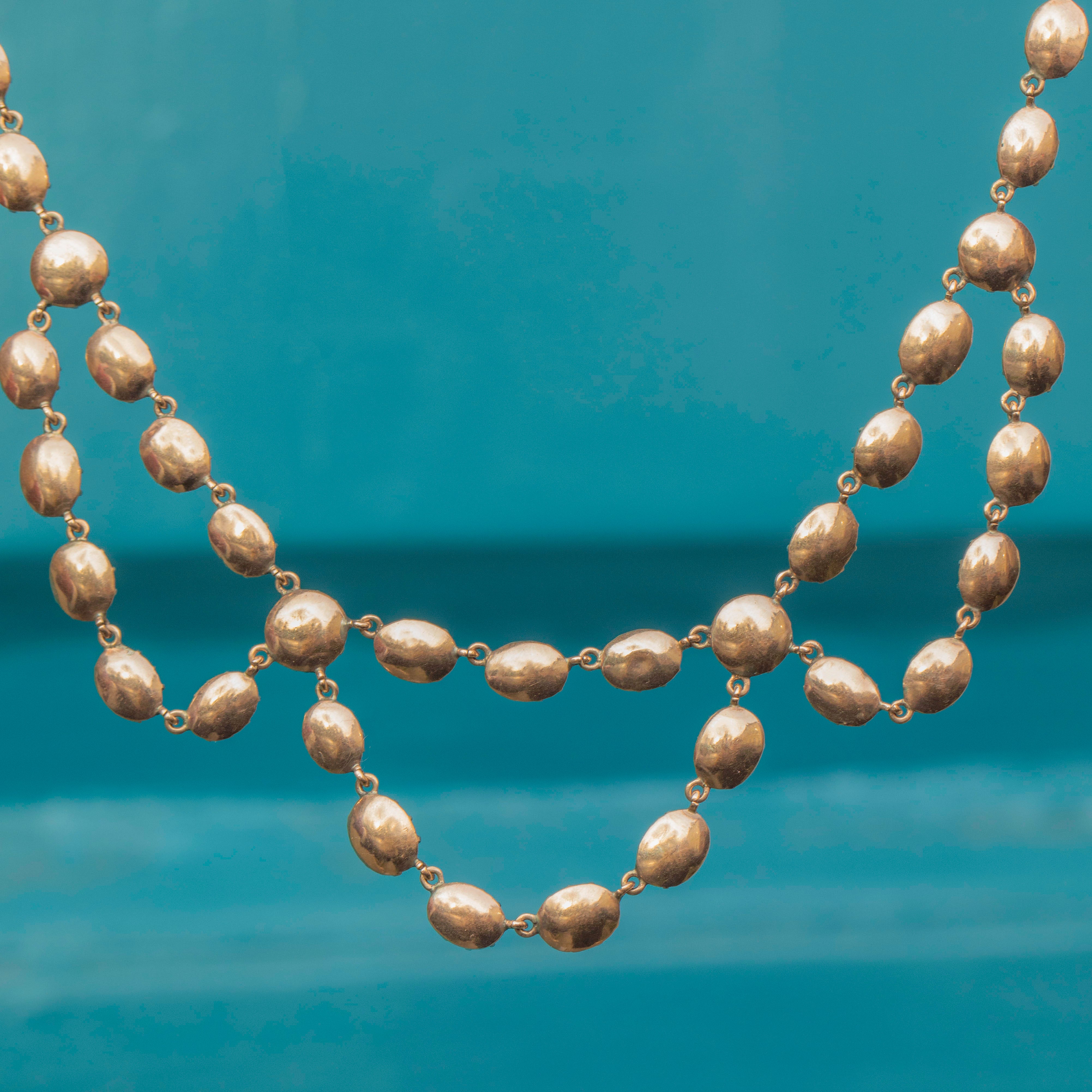 EXCELLENT: This Georgian 9ct Gold flat-cut Garnet swag necklace is in excellent condition! Each Garnet has been meticulously preserved and retains a gorgeous saturation. With a secure clasp, you can wear this antique necklace with the utmost confidence.