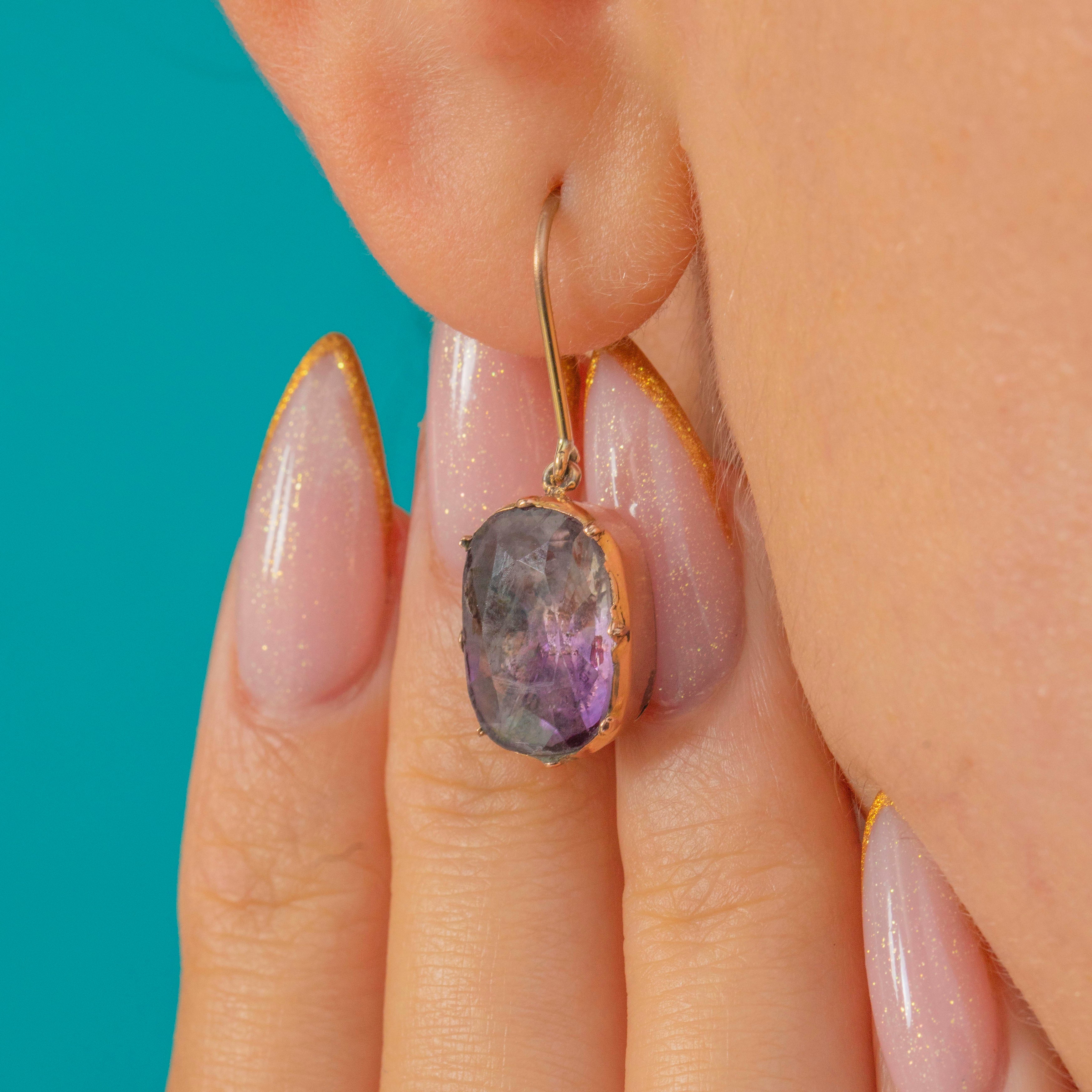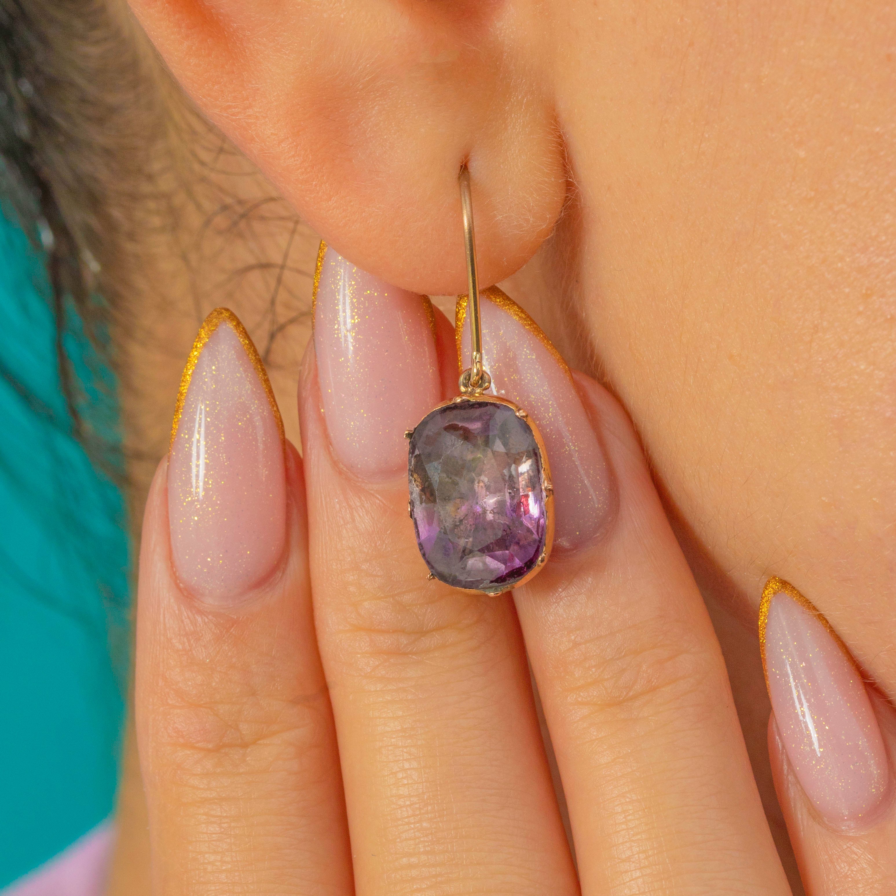 Steeped in history, these earrings are an honest and sympathetic antique conversion. The Amethyst drops originally began life as Georgian clasps, and have been professionally adapted into wearable earrings while preserving all their original charm, foiling, and period character.