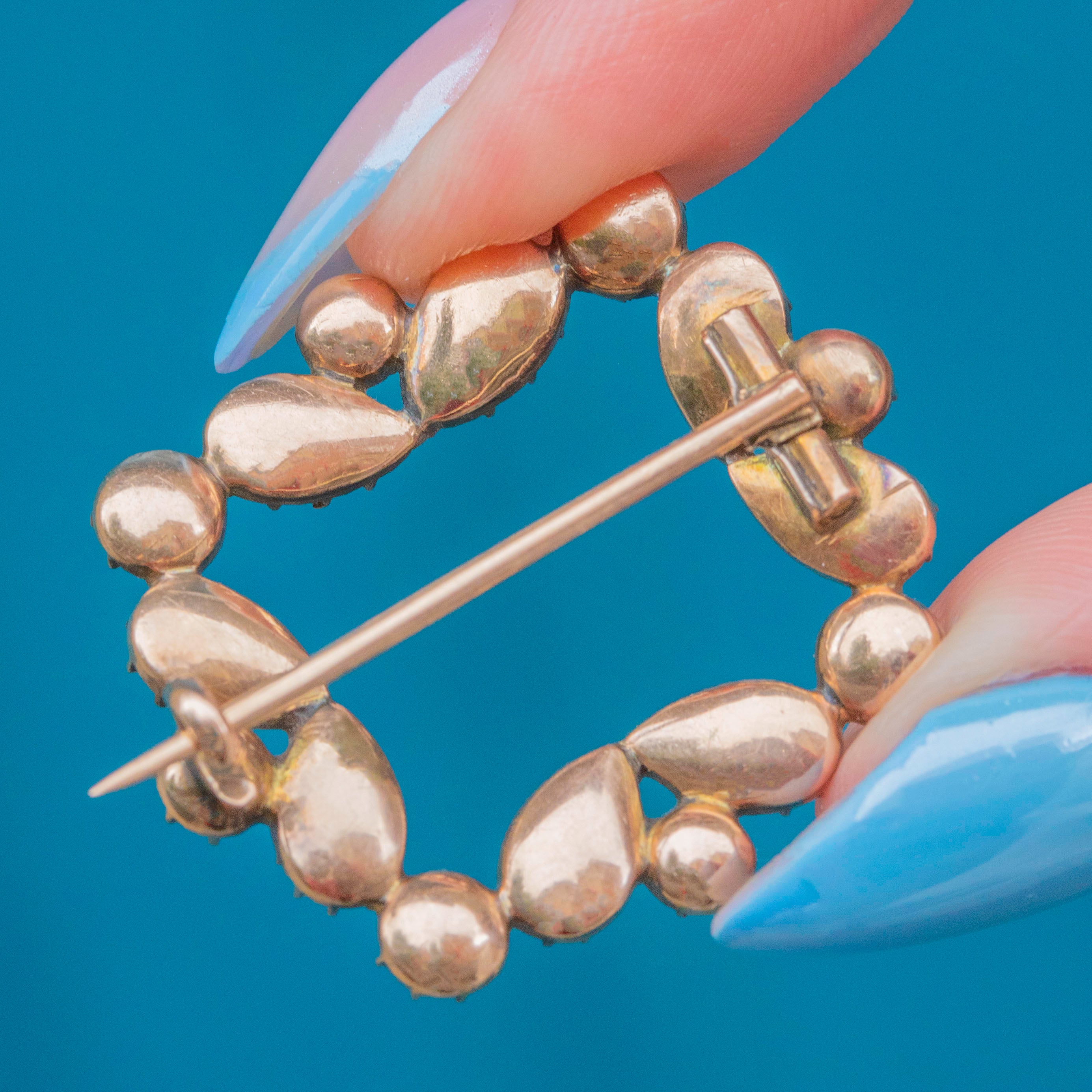 EXCELLENT: The Garnets are radiant with crisp facets, free from chips or abrasions, each one securely held within its setting. The Gold has accrued a patina around the settings, expected with age, adding to the brooch's antique charm. The closed-back settings are smooth and free from notable dings. Complete with a robust brooch pin, you can wear this antique Garnet brooch with absolute confidence!