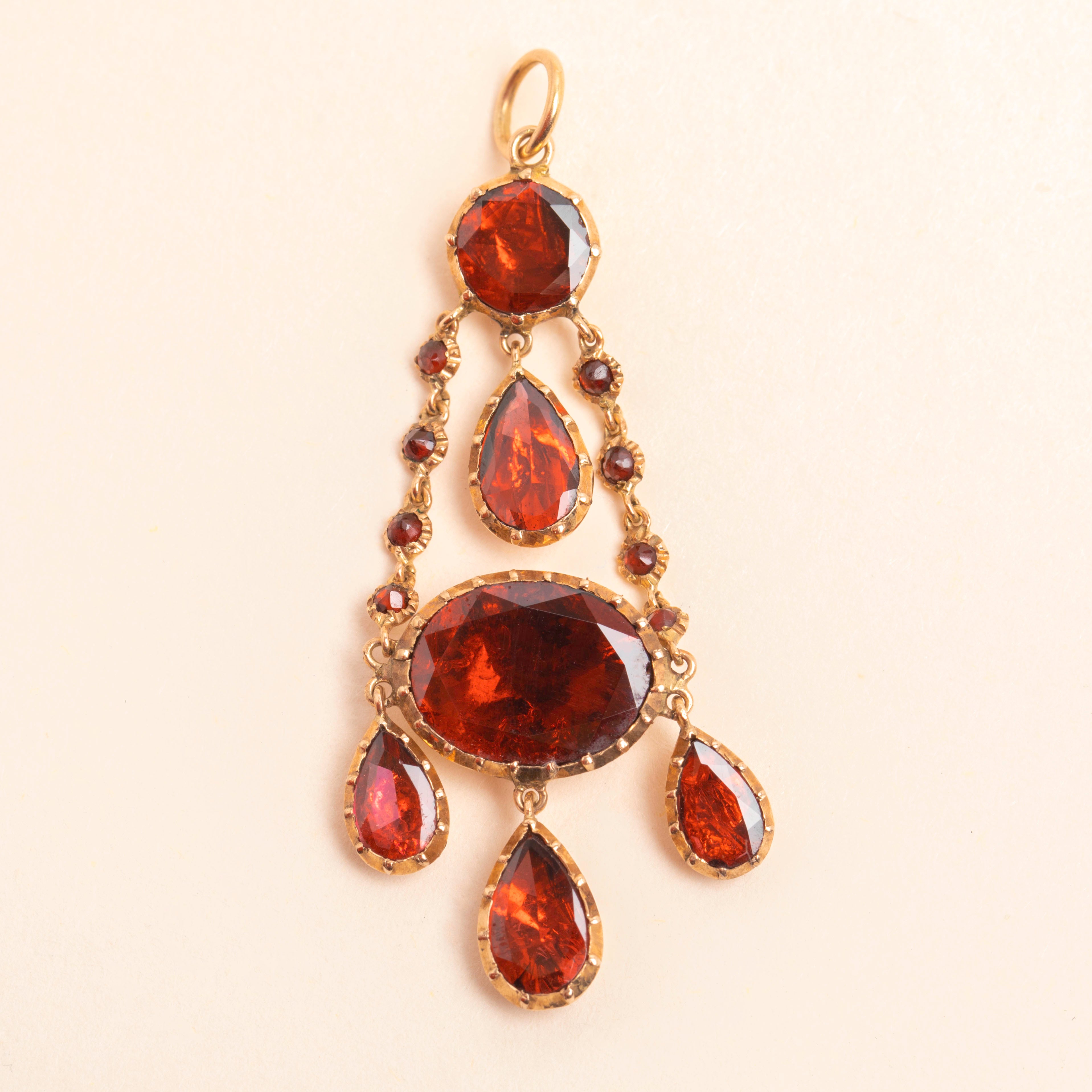 EXCELLENT. We are pleased to present this Georgian 9ct Gold foiled Garnet drop pendant in excellent condition. Her Garnets are radiant, glimmering in the light, and free from scratches or chips. The Gold is luminous and the classically crimped Geogrian settings are defined and hold the Garnets securely. She is truly a must-have!