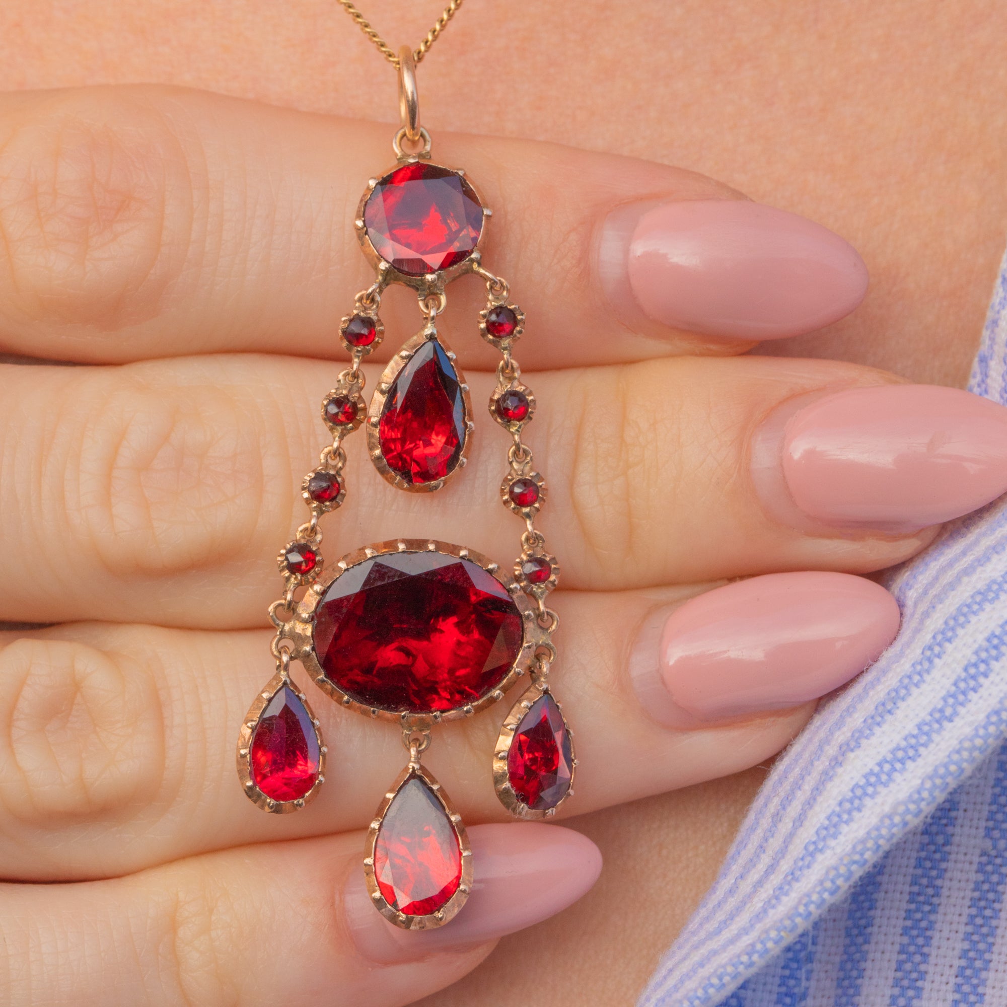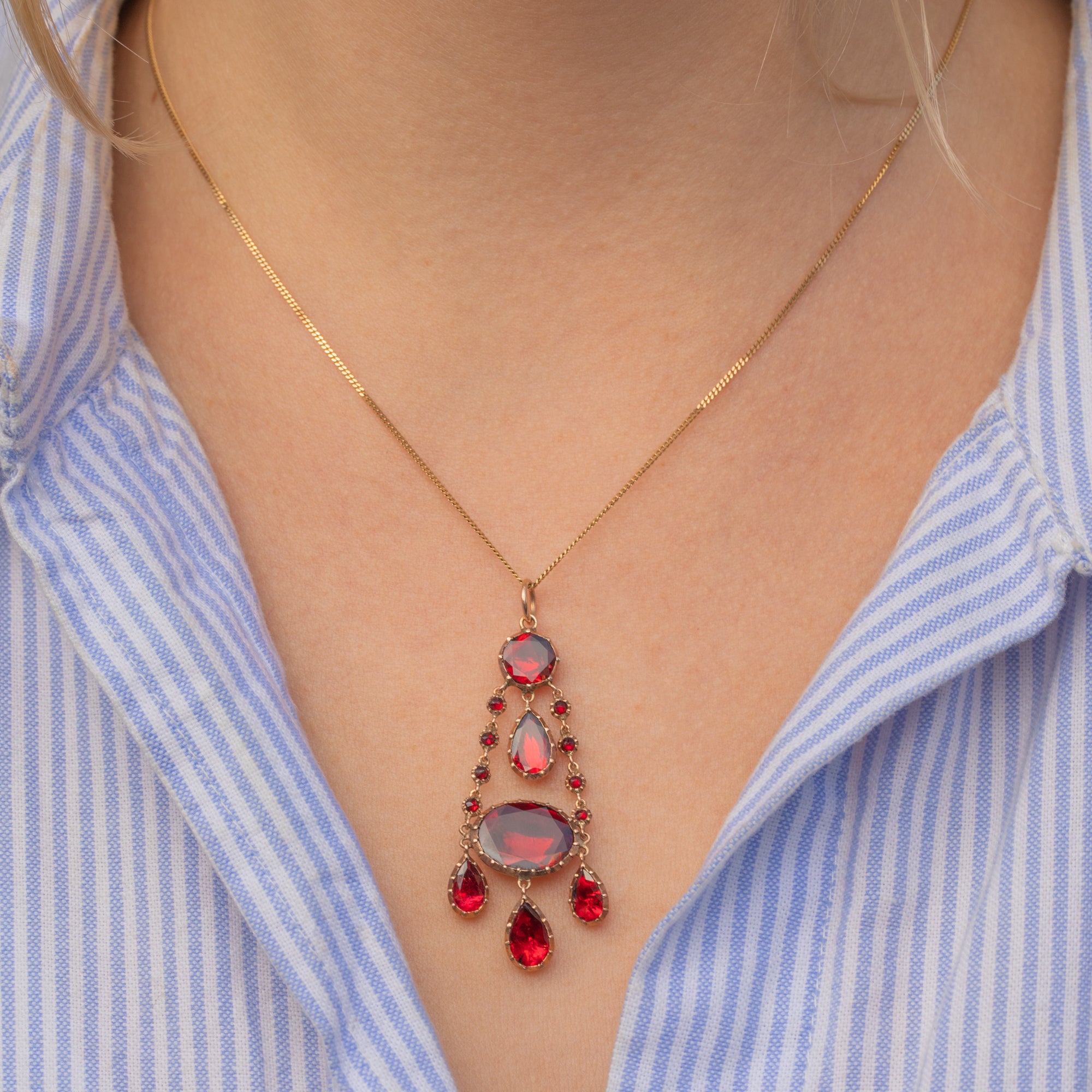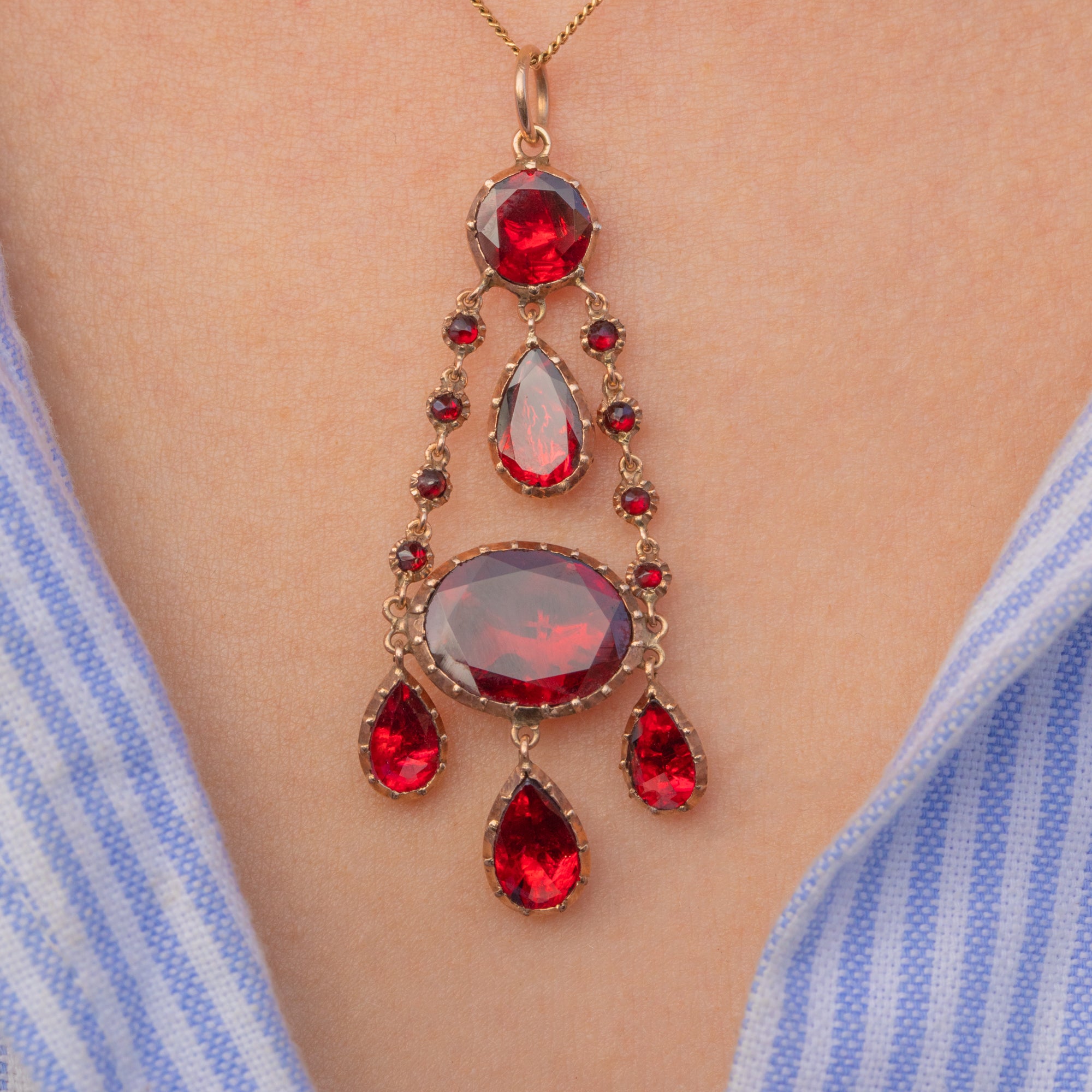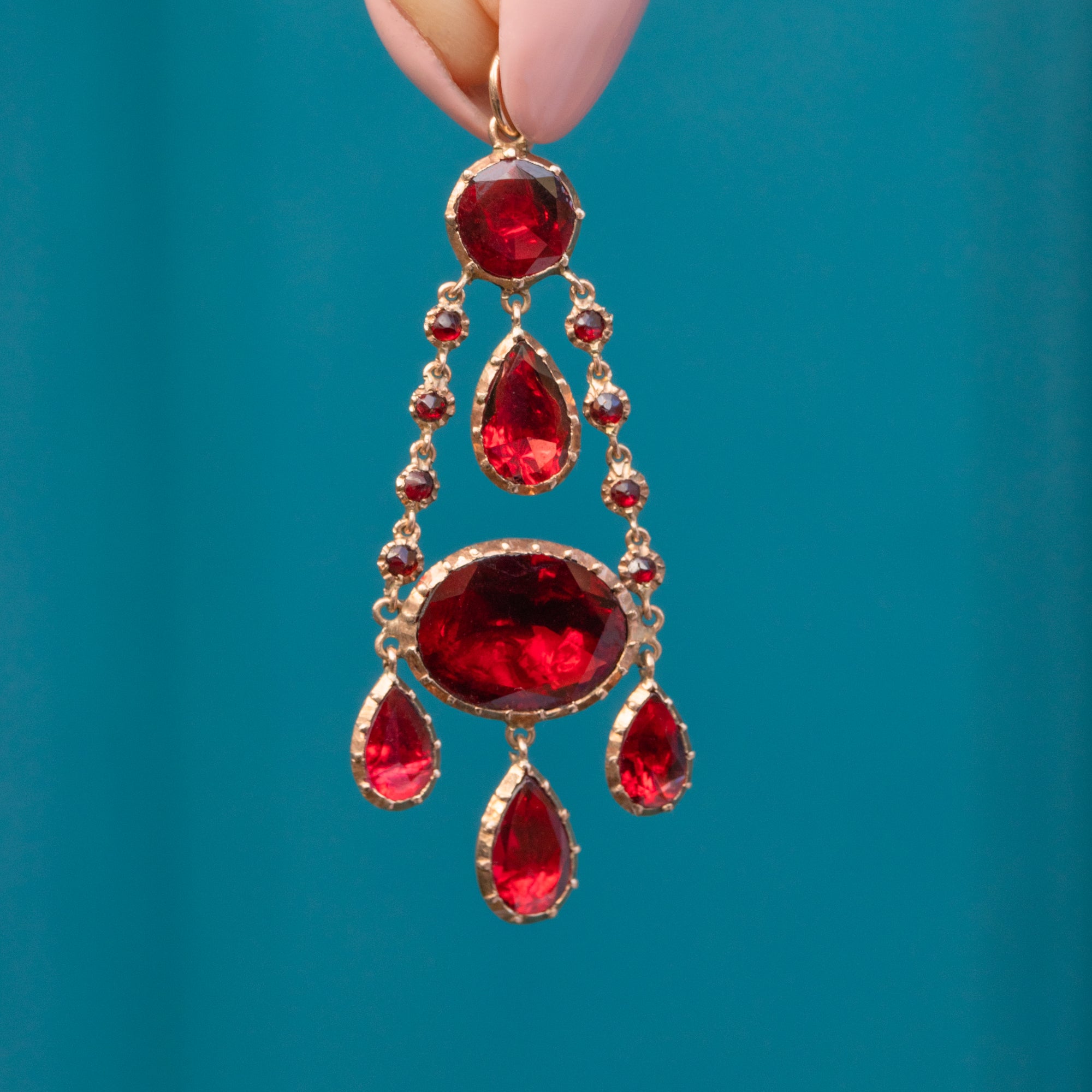 We adore this Georgian 9ct Gold foiled Garnet drop pendant! Boasting 6.27cts of stunning Garnets, this antique Gold drop pendant exudes regality. Her foiled Garnets capture the light beautifully, radiating fiery red hues, effortlessly complimented by her rich, buttery 9ct Gold settings.