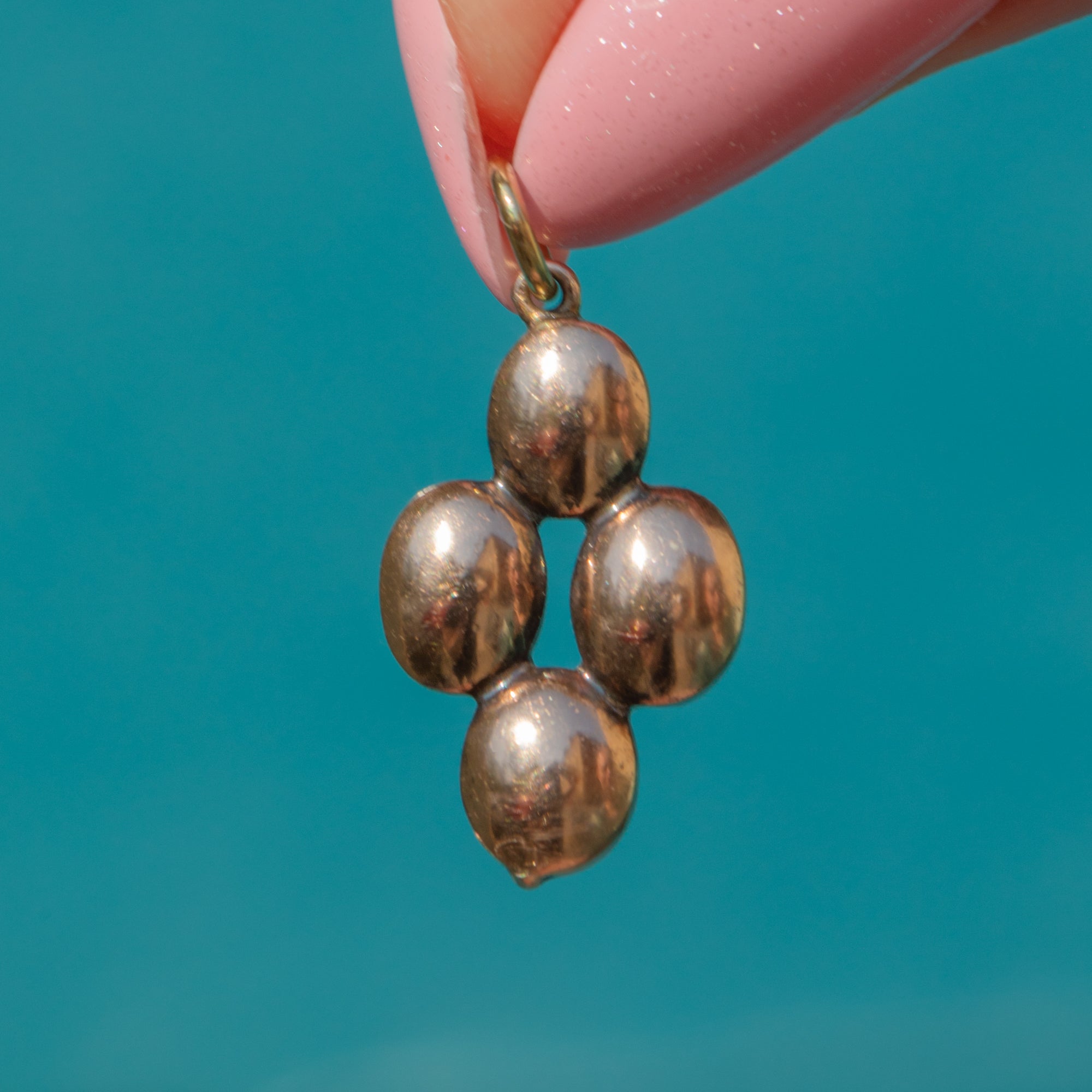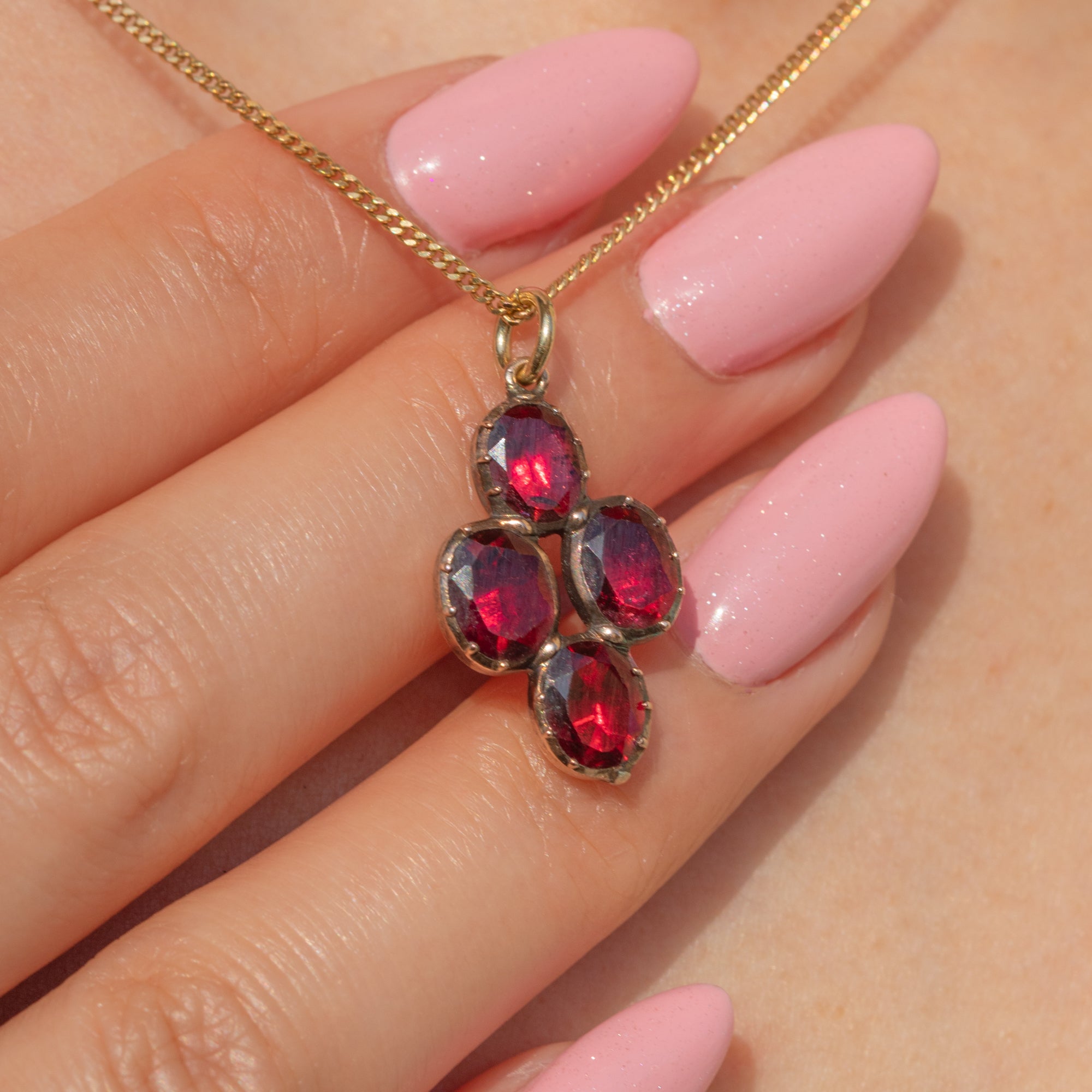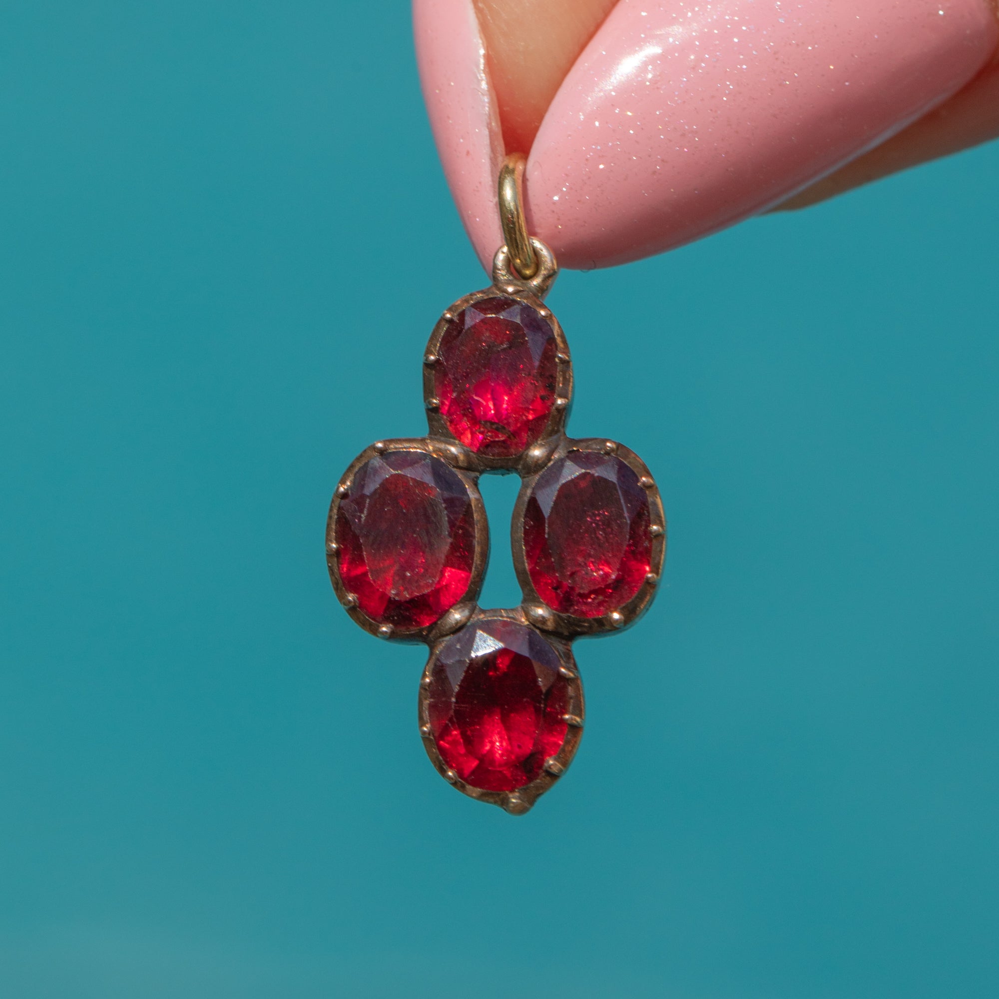 This exquisite Georgian 9ct Gold Garnet charm is a true delight! Showcasing four beautifully flat-cut Garnets arranged in a quartet formation, she shimmers with deep, crimson hues—reminiscent of a cluster of ripe, irresistible berries.