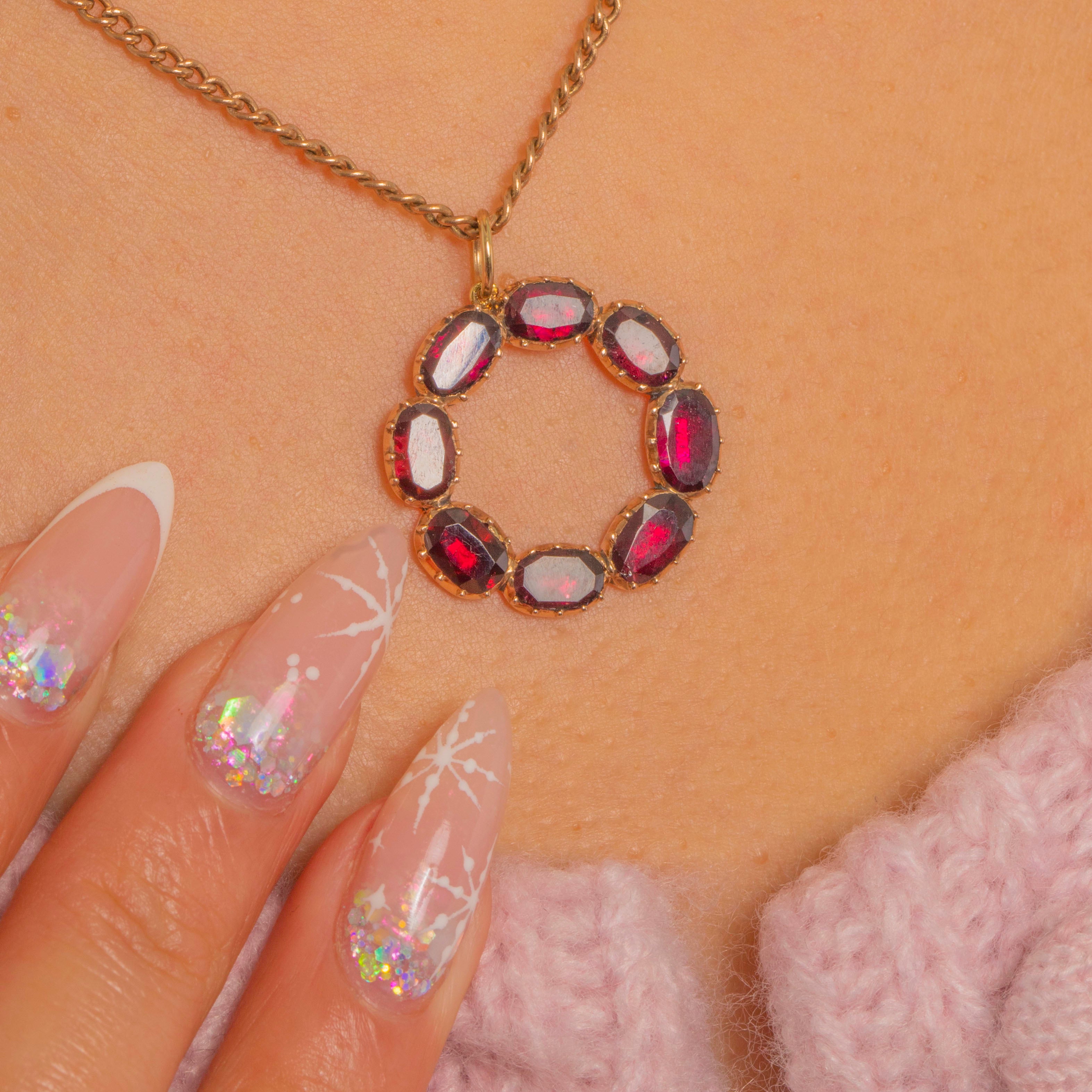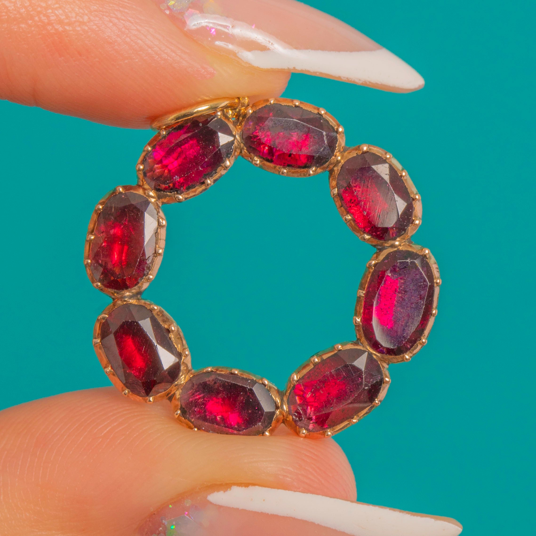 A gorgeous Georgian Garnet pendant dating to c.1820, designed as a perfect circle of glowing flat-cut Garnets, each beautifully foiled to enhance their rich, pinkish-red hue. The gemstones shimmer with that classic Georgian radiance, displayed in warm 9ct Gold with charming early-19th-century closed back piecrust settings.