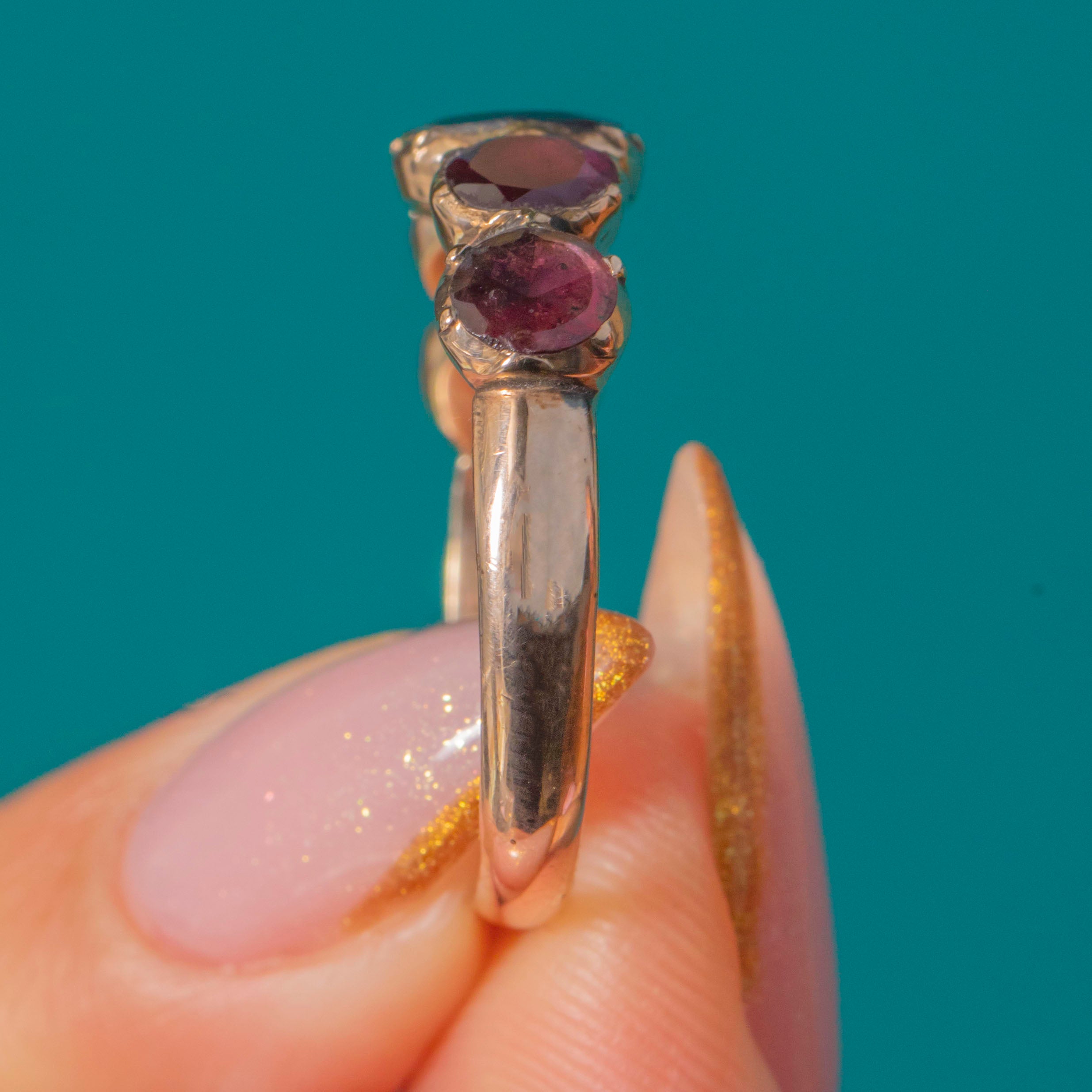 Deep wine-red Garnets glow across this elegant Georgian five-stone half hoop. Graduating gently to the centre, each Garnet is framed in decorative crimped collet settings, the backs closed in classic early 19th-century style. The warm 9ct Gold band and gallery add a soft antique radiance that makes this ring so wearable and beautifully romantic.