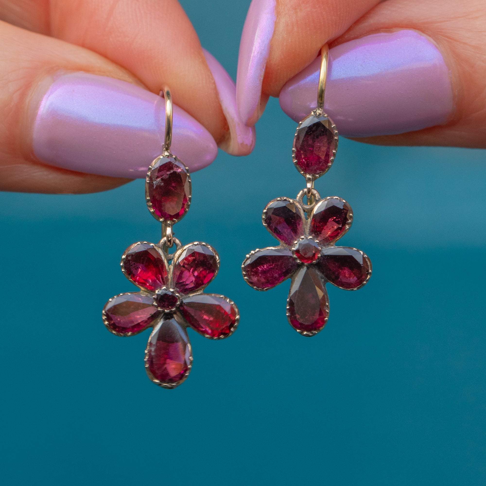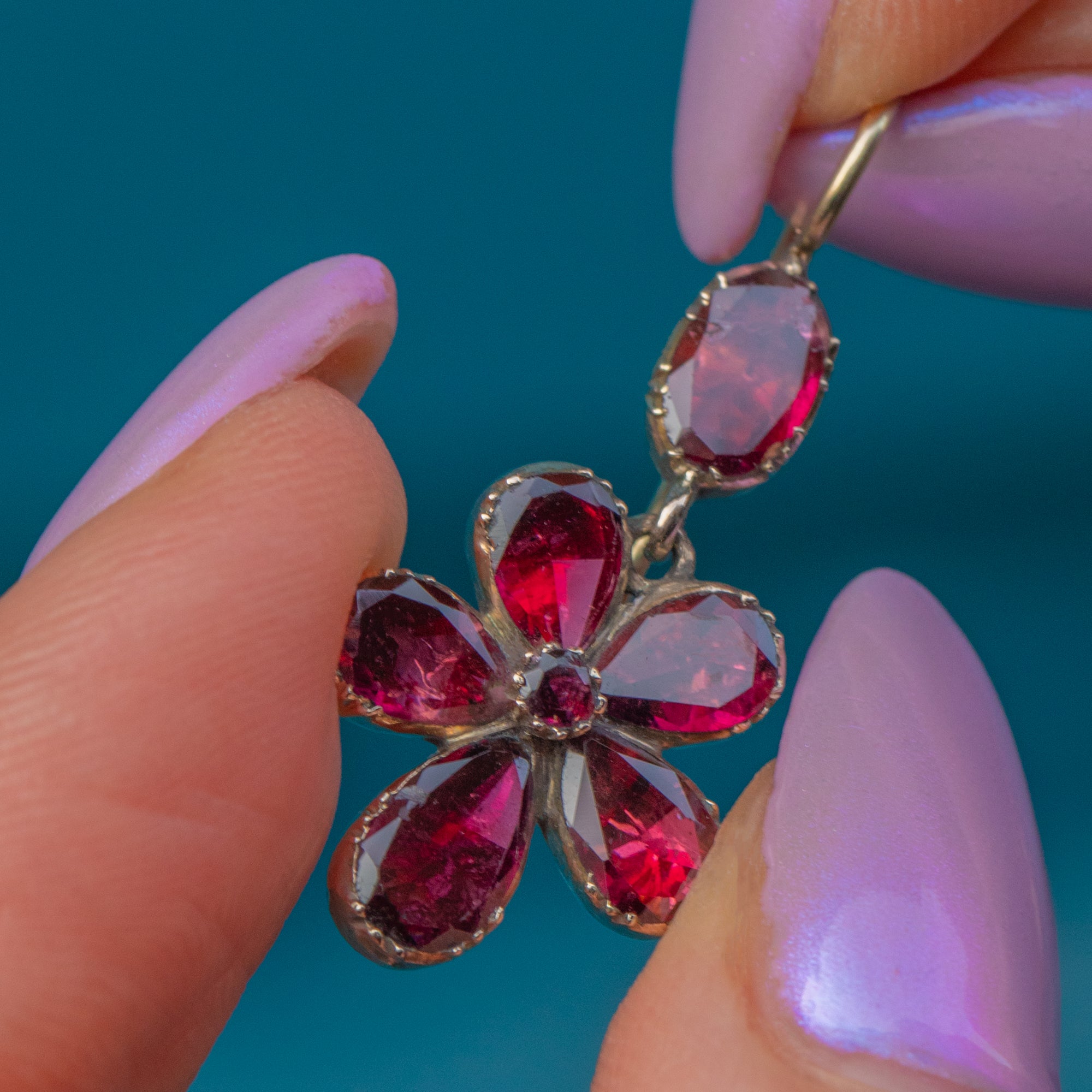 These Georgian 9ct Gold Garnet pansy drop earrings are adorable!