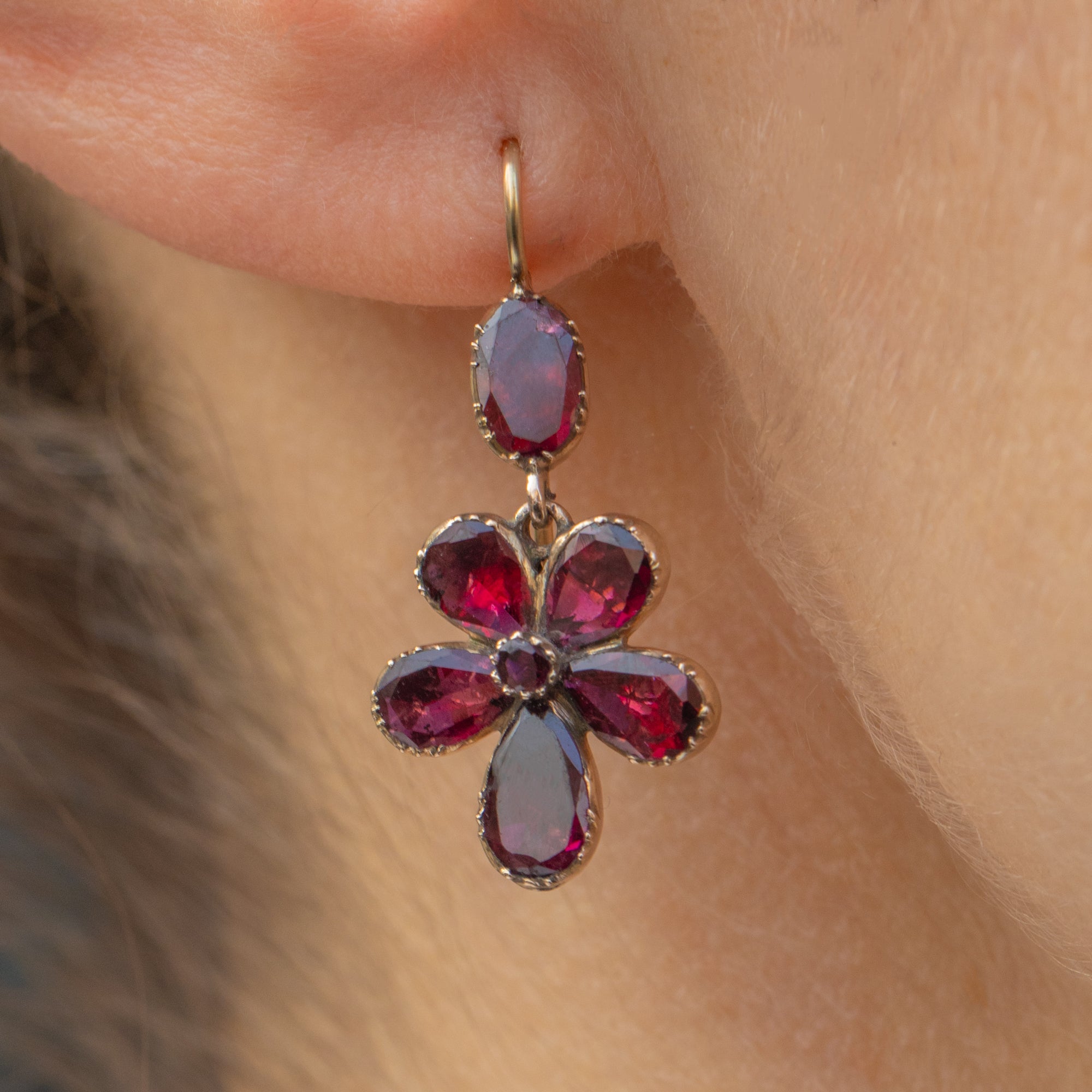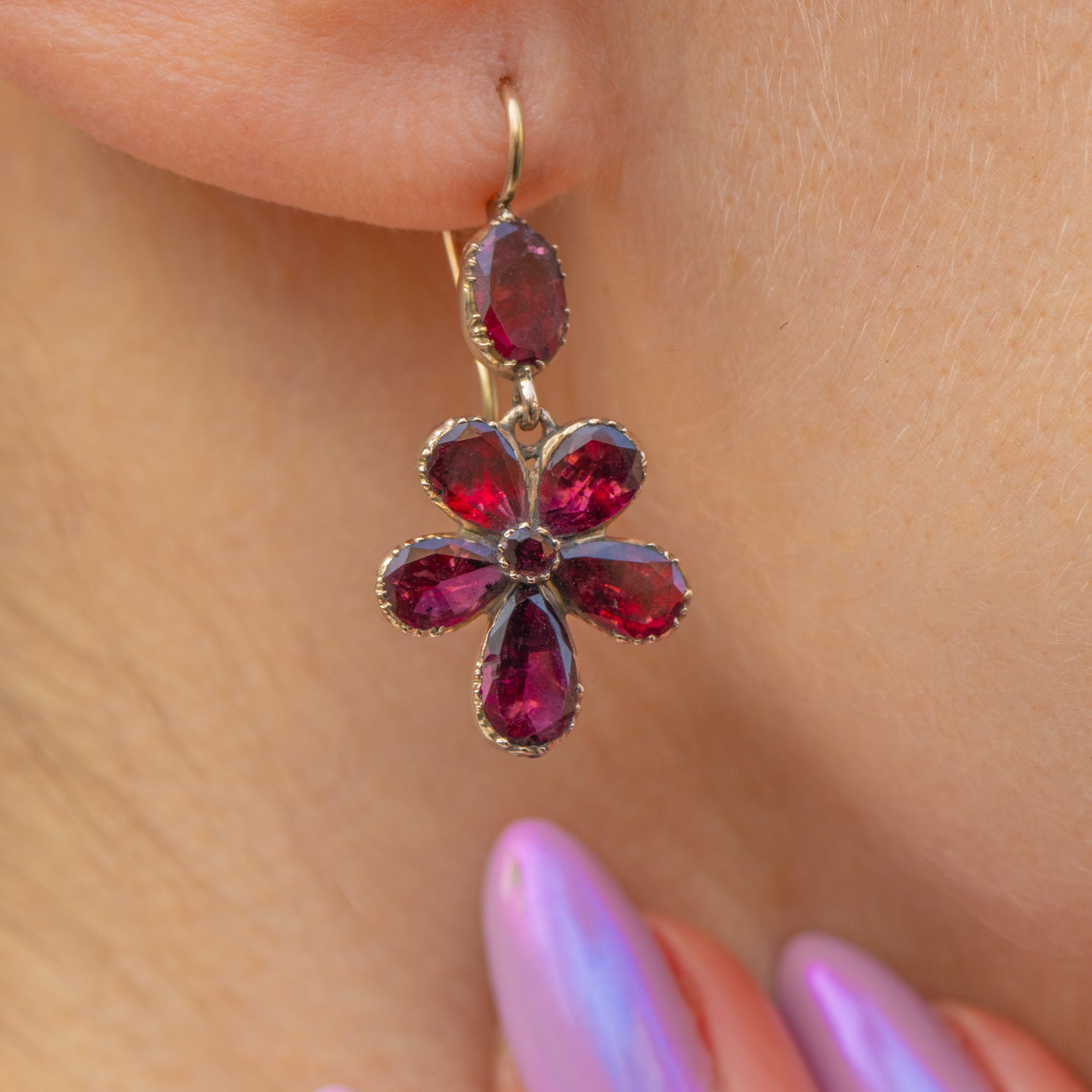 These pansy drop earrings have a lovely feminine antique charm, enhanced by the gentle movement they provide as they suspend from your lobes. Versatile and dainty, these Georgian Garnet earrings are a must-have!