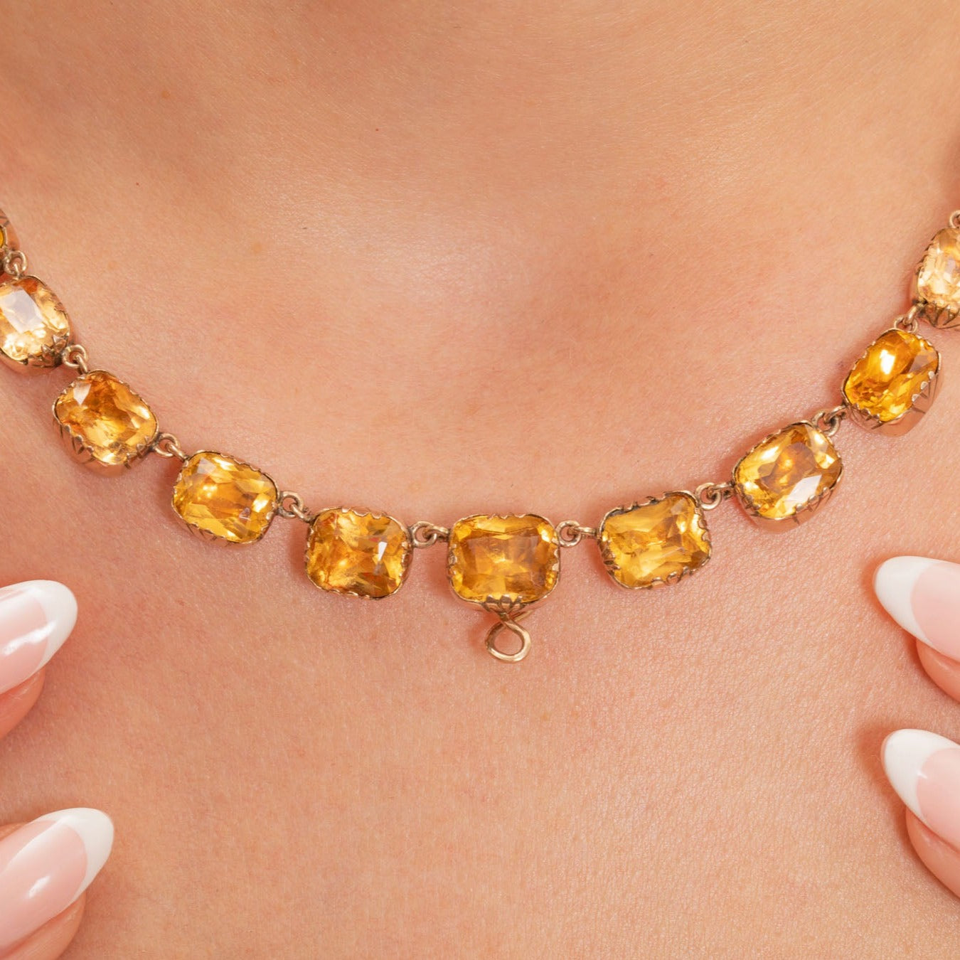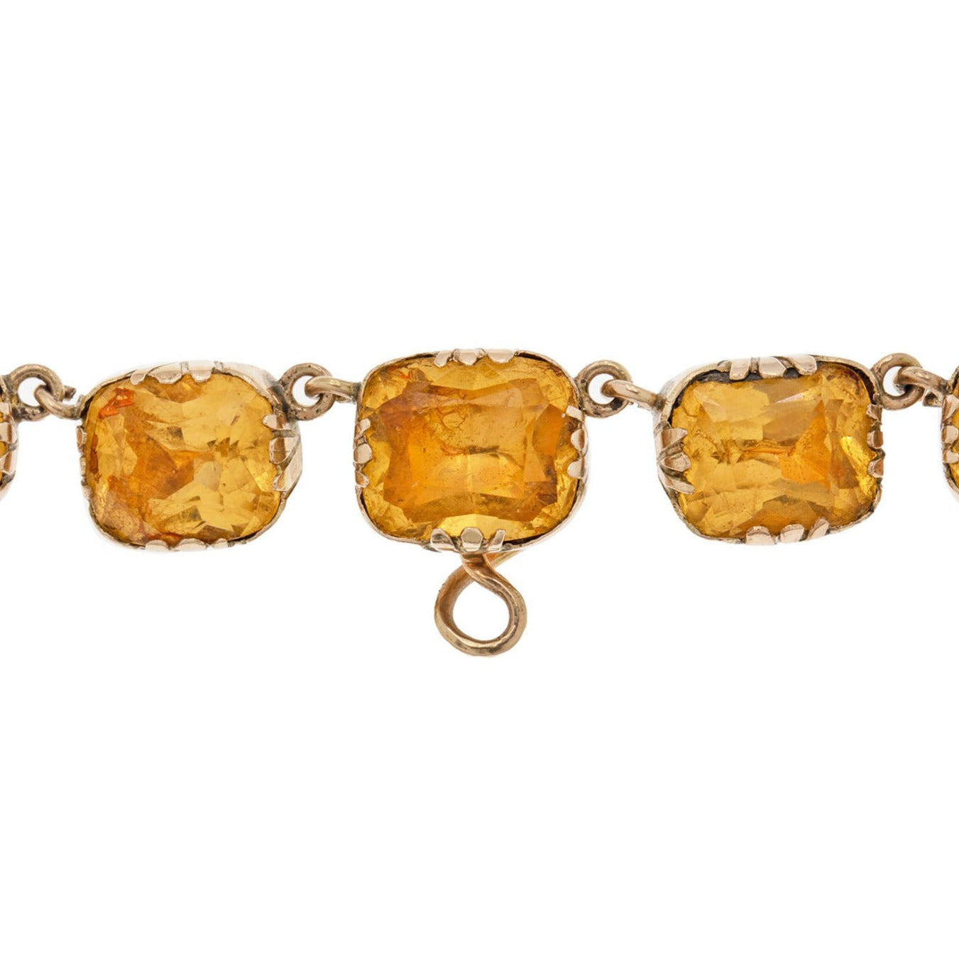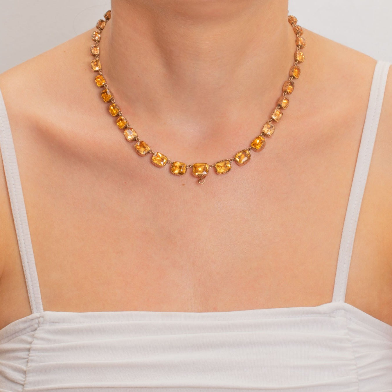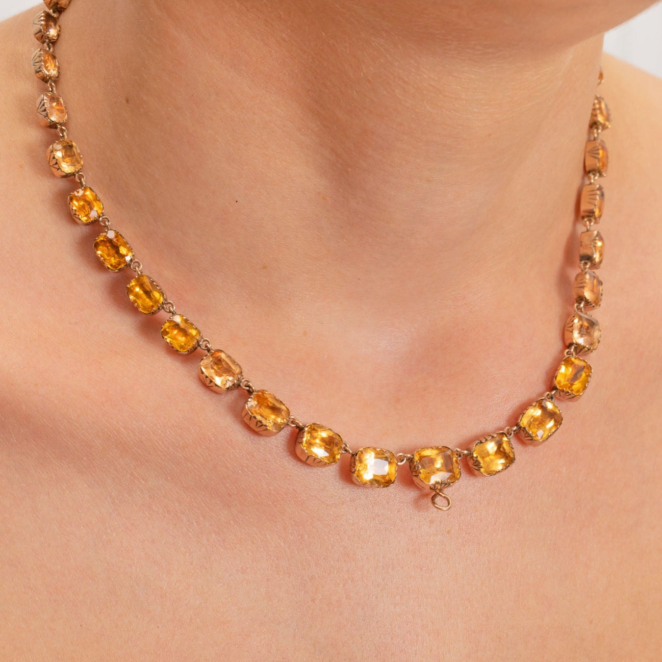 The Paste gemstones subtly graduate in size, with each exuding a warm honey tone, securely set in a classic and timeless 9ct Gold collet setting which are typical of the time. There is also a discreet hook towards the base of the piece, from which you can suspend your own charm or pendant to give this piece. Just imagine having this exquisite Georgian necklace adorning your neck, it's a magnificent piece which no one else will have anything like!