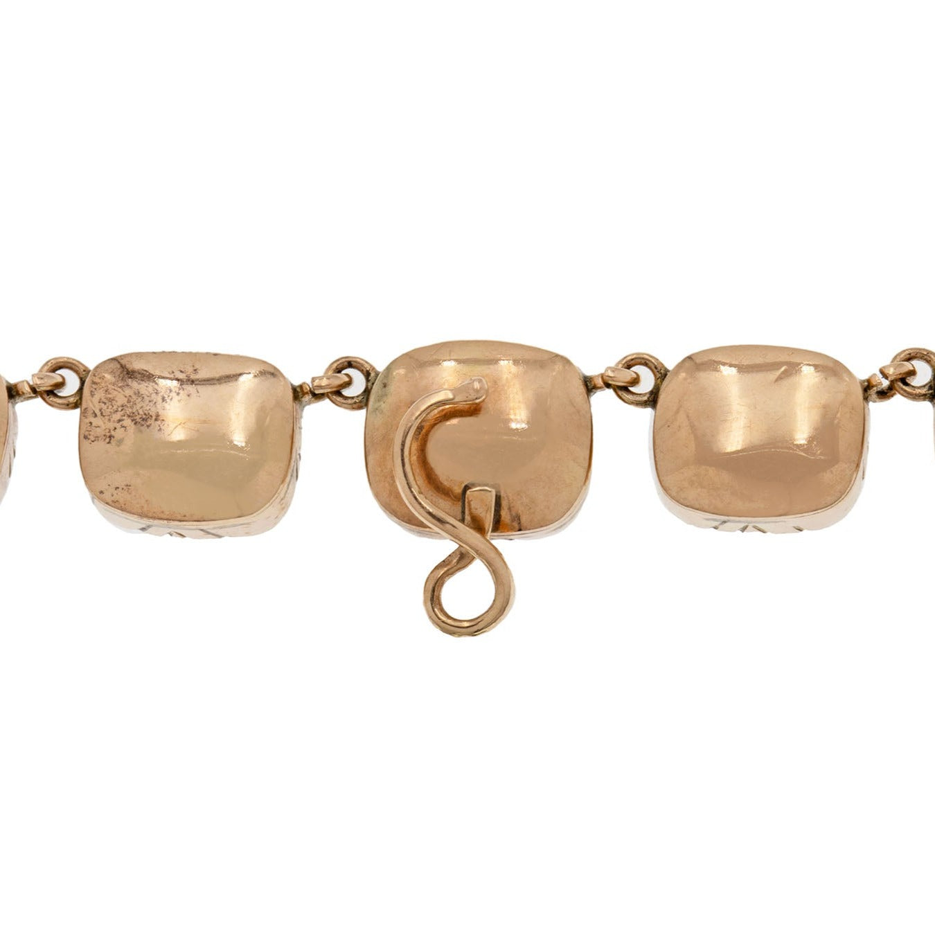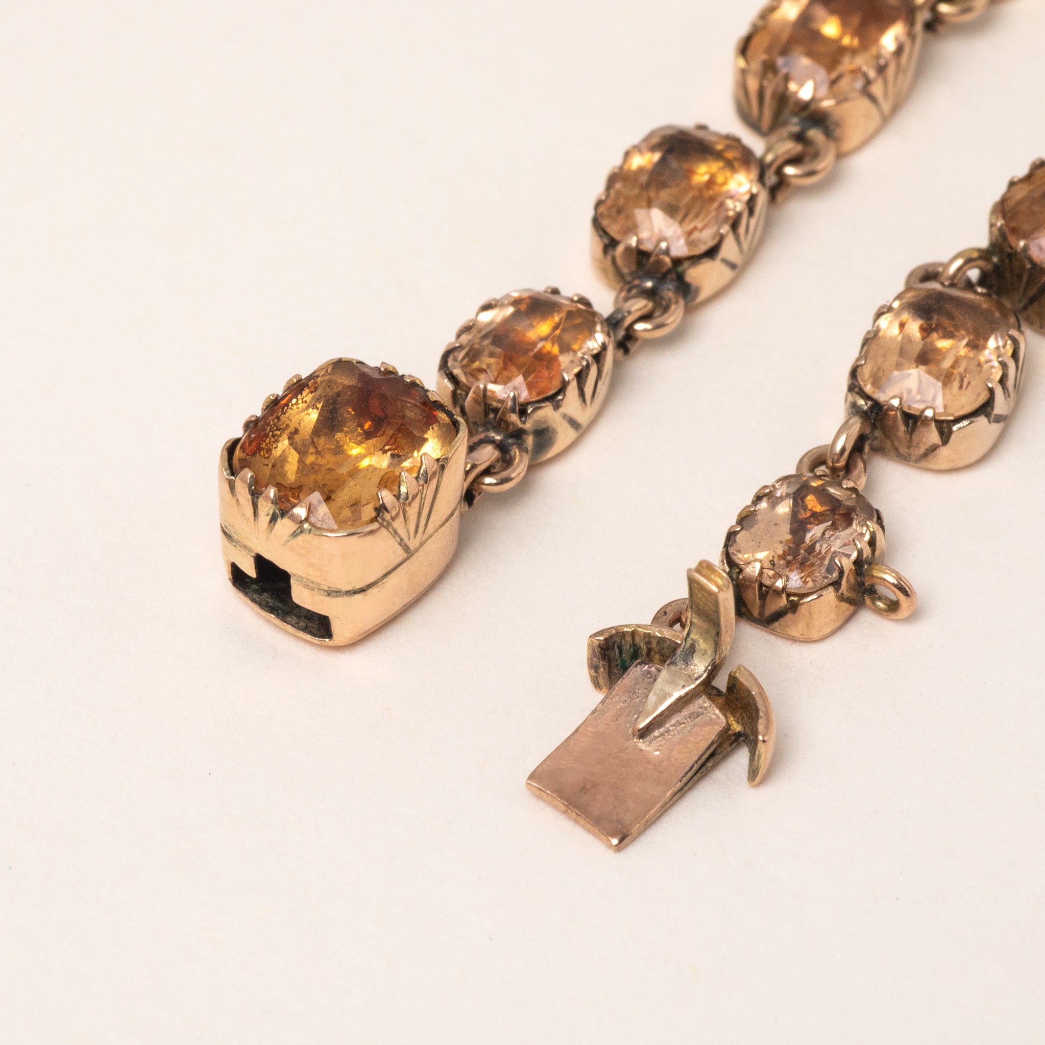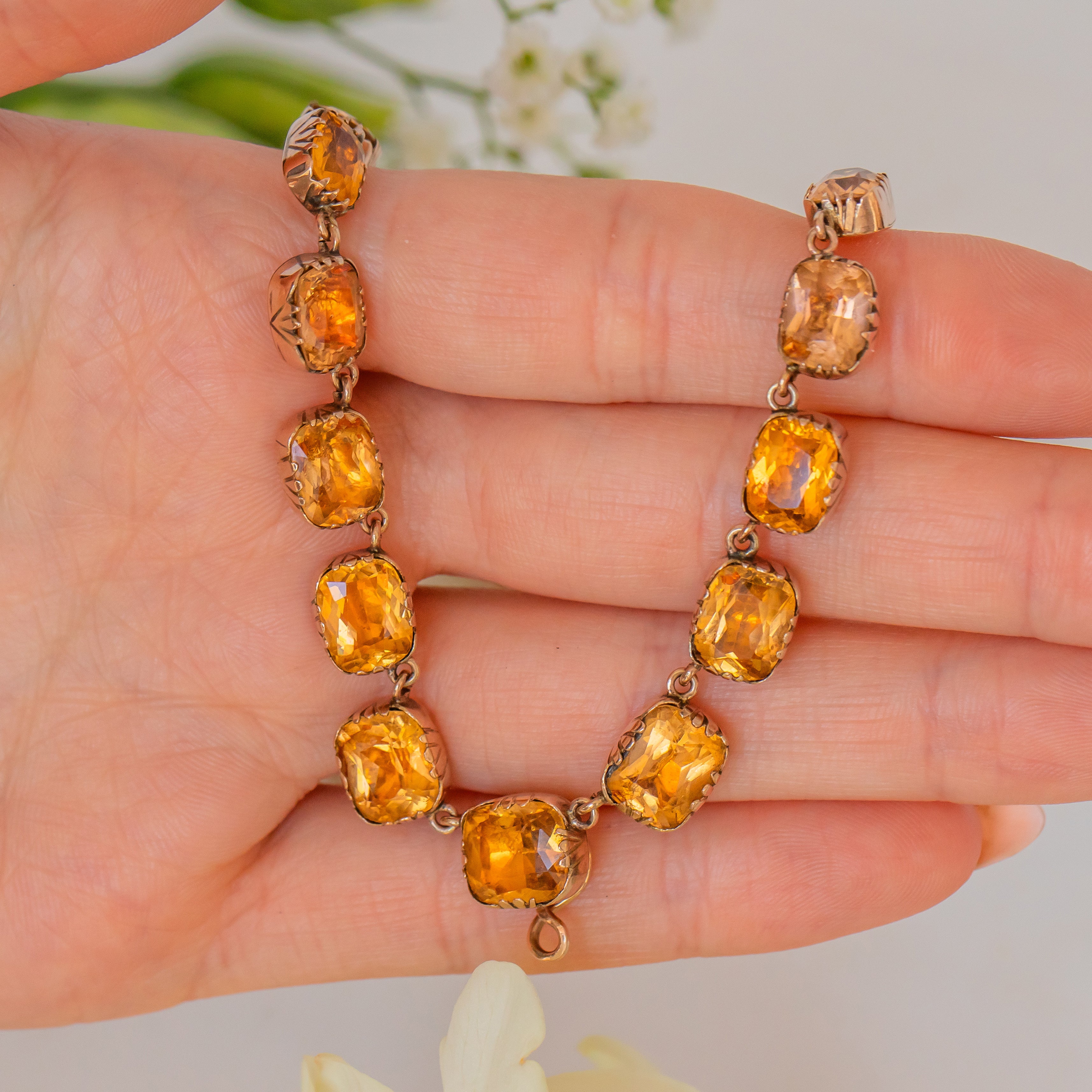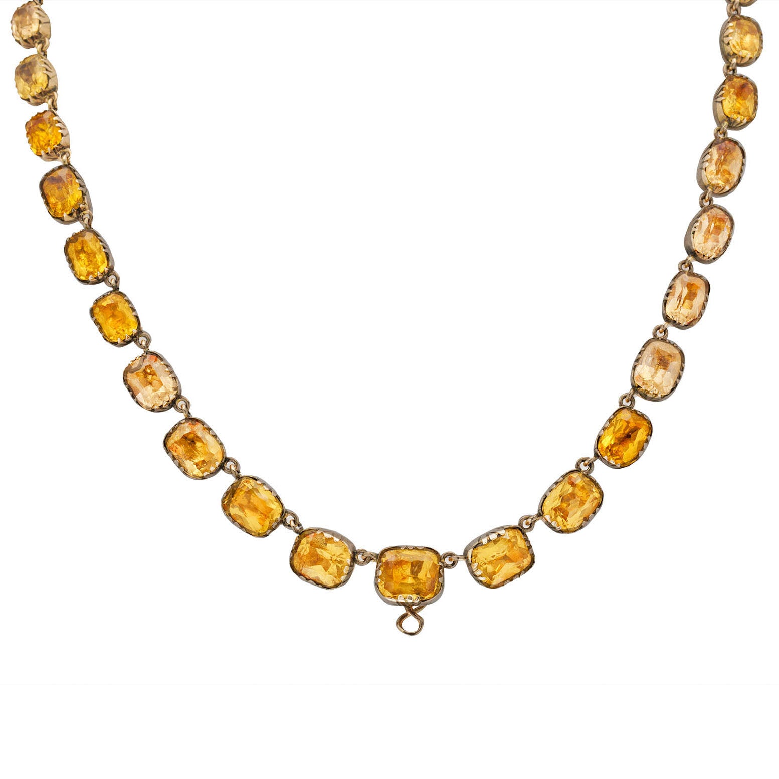 The Paste gemstones subtly graduate in size, with each exuding a warm honey tone, securely set in a classic and timeless 9ct Gold collet setting which are typical of the time. There is also a discreet hook towards the base of the piece, from which you can suspend your own charm or pendant to give this piece. Just imagine having this exquisite Georgian necklace adorning your neck, it's a magnificent piece which no one else will have anything like!