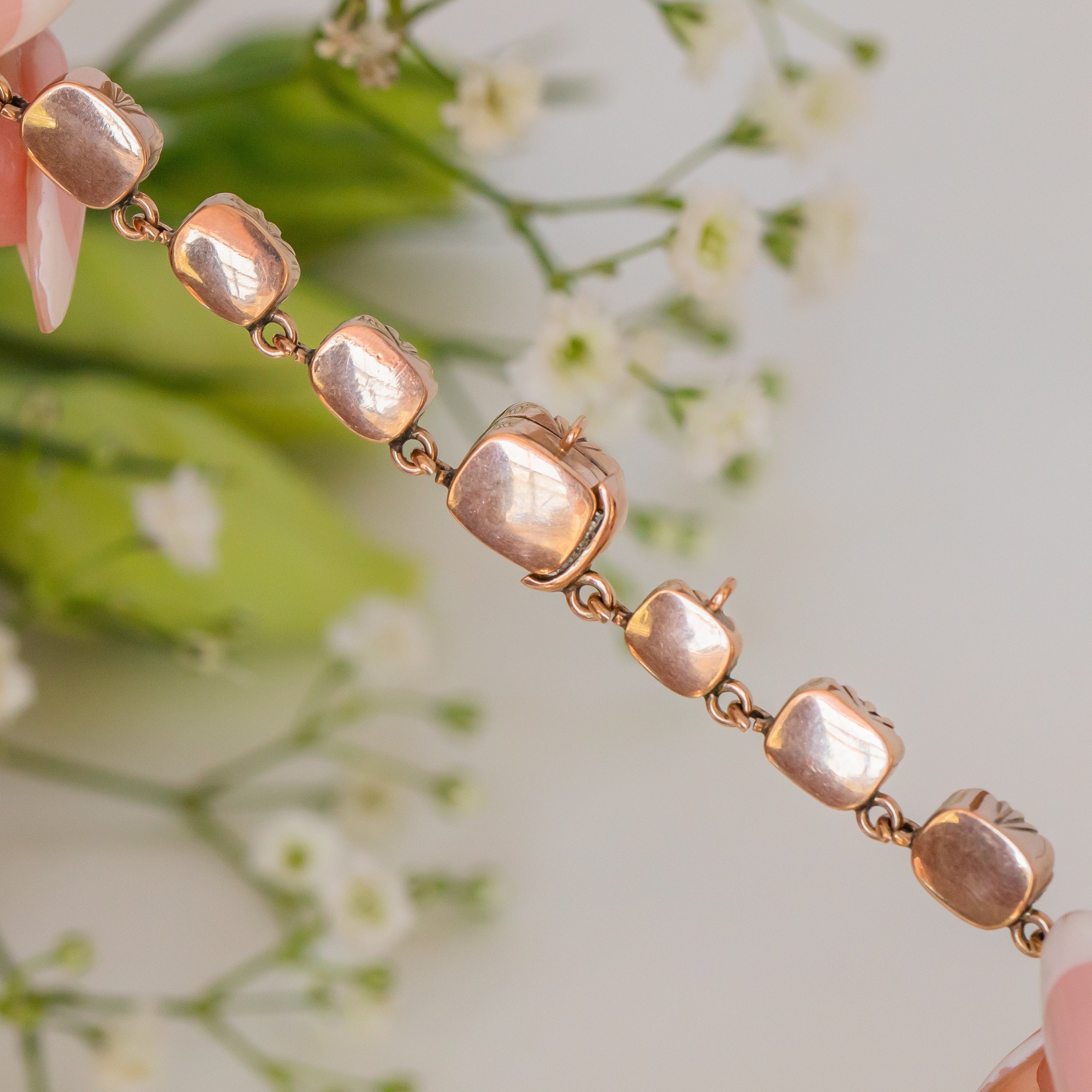 VERY GOOD. This Georgian 9ct Gold Paste rivière necklace is in very good condition overall! The Paste gems are all secure, and whilst some of the foiled backings have faded over the years, there is still very much a honey-like feel to the piece. Remarkably, there is little to no wear to the piece overall, the 9ct Gold settings are smooth, and have retained a bright Golden hue. The clasp is discreet, and allows you to wear her securely. This is a piece which is suitable for evening events, or being worn for shorter periods of time than your average Gold chain, and it should be kept away from water! Read more about how to care for your antique jewellery here: https://www.lillicoco.com/blogs/love-lillicoco-blog/how-to-clean-antique-jewellery-the-guide-you-all-need-to-read.