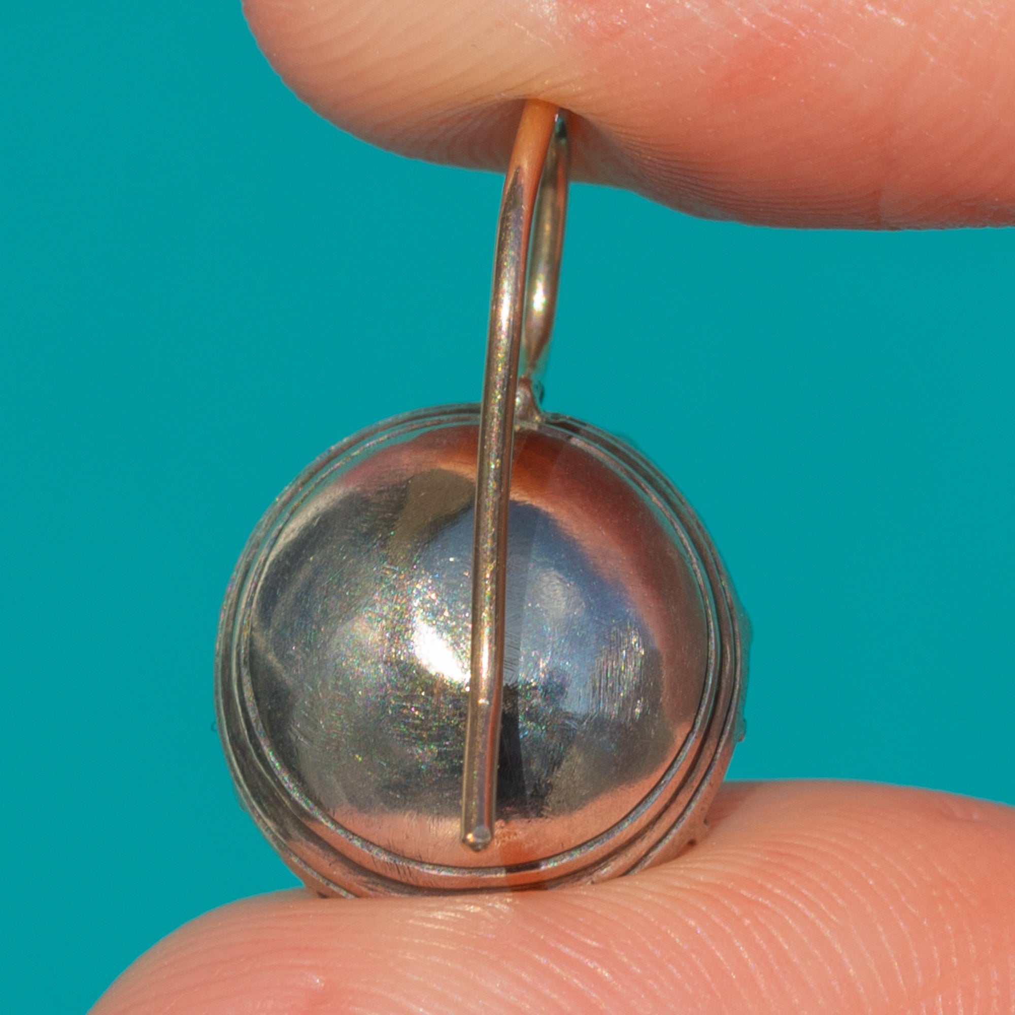 These Georgian drop earrings capture candlelit elegance with luminous Diamond Paste gemstones showcased in Silver collet settings. The colourless, domed, antique-cut stones shimmer with a romantic, old-world glow, their serrated rims adding a pretty, hand-worked detail. Suspended from simple hook fittings, they offer timeless, understated glamour with beautiful movement.