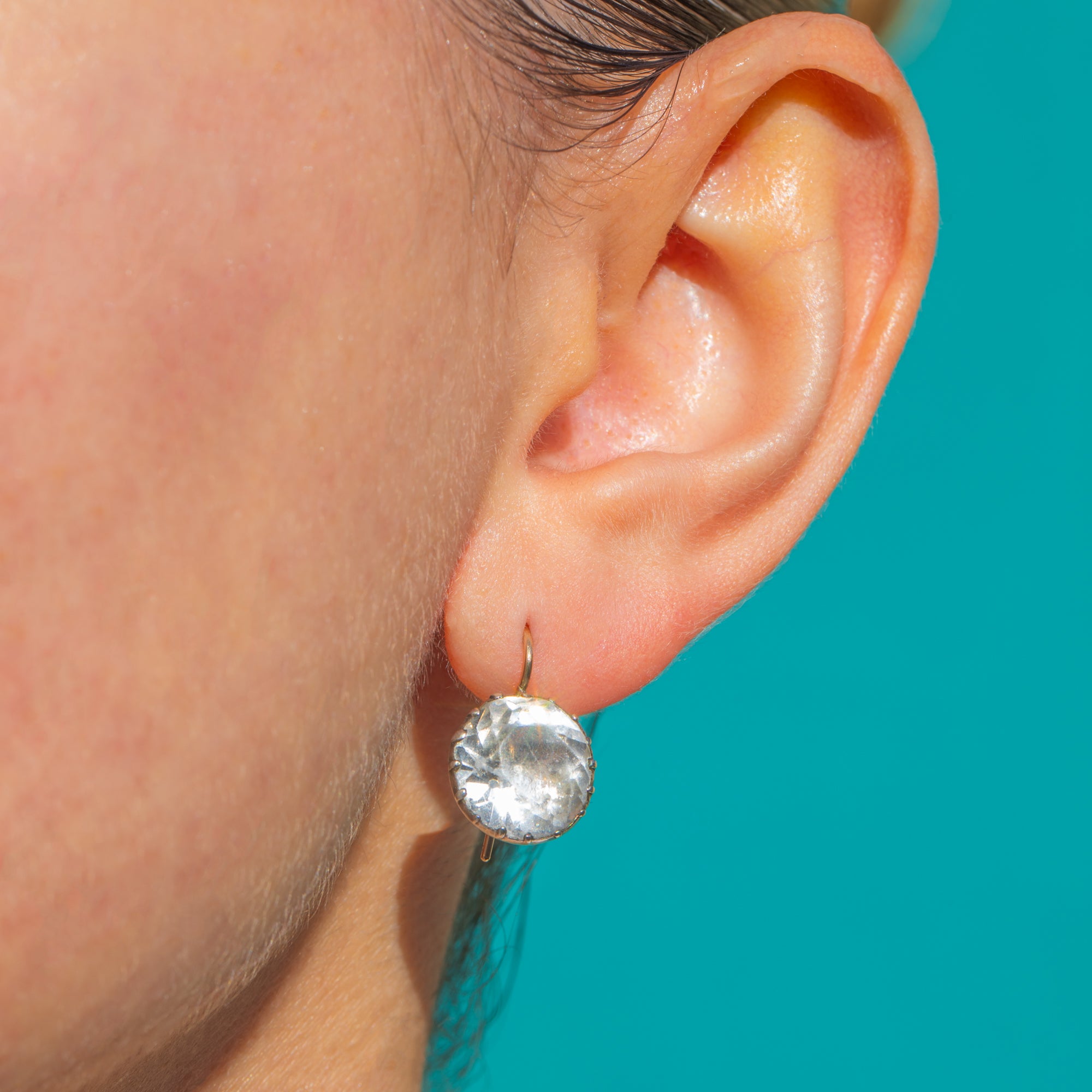 EXCELLENT: Paste stones display light facet wear and minor abrasions commensurate with age, with the soft, cloudy glow typical of antique Paste; any tiny nicks are discreet in wear. The closed-back collet settings and hooks are secure with gentle patina and no issues to the integrity of the mounts. No obvious signs of repair; the earrings have been well cared for.