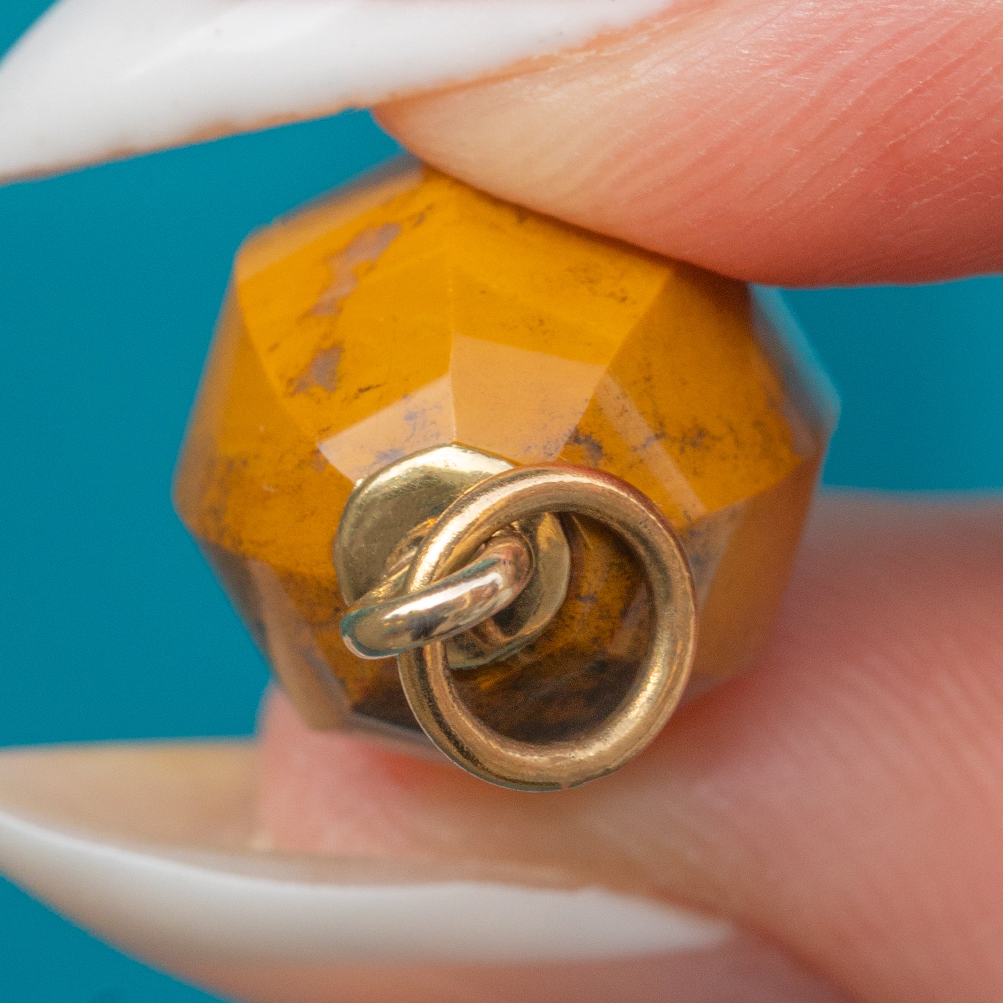 EXCELLENT: The Jasper bead is crisp with no noticeable chips or abrasions, and its facets remain well defined. The 9ct Gold fittings and jump ring are secure with minimal surface wear, suggesting the piece has been well cared for.