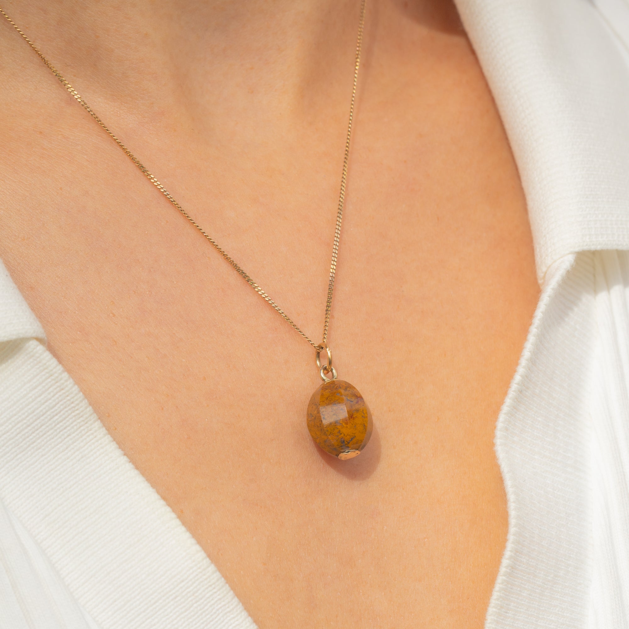 This Georgian pendant centres on a handsome Jasper bead in warm ochre tones, peppered with natural flecks and clouds that give it wonderful depth. The bead has a softly faceted, barrel-oval profile that catches the light beautifully and brings a tactile, antique charm.