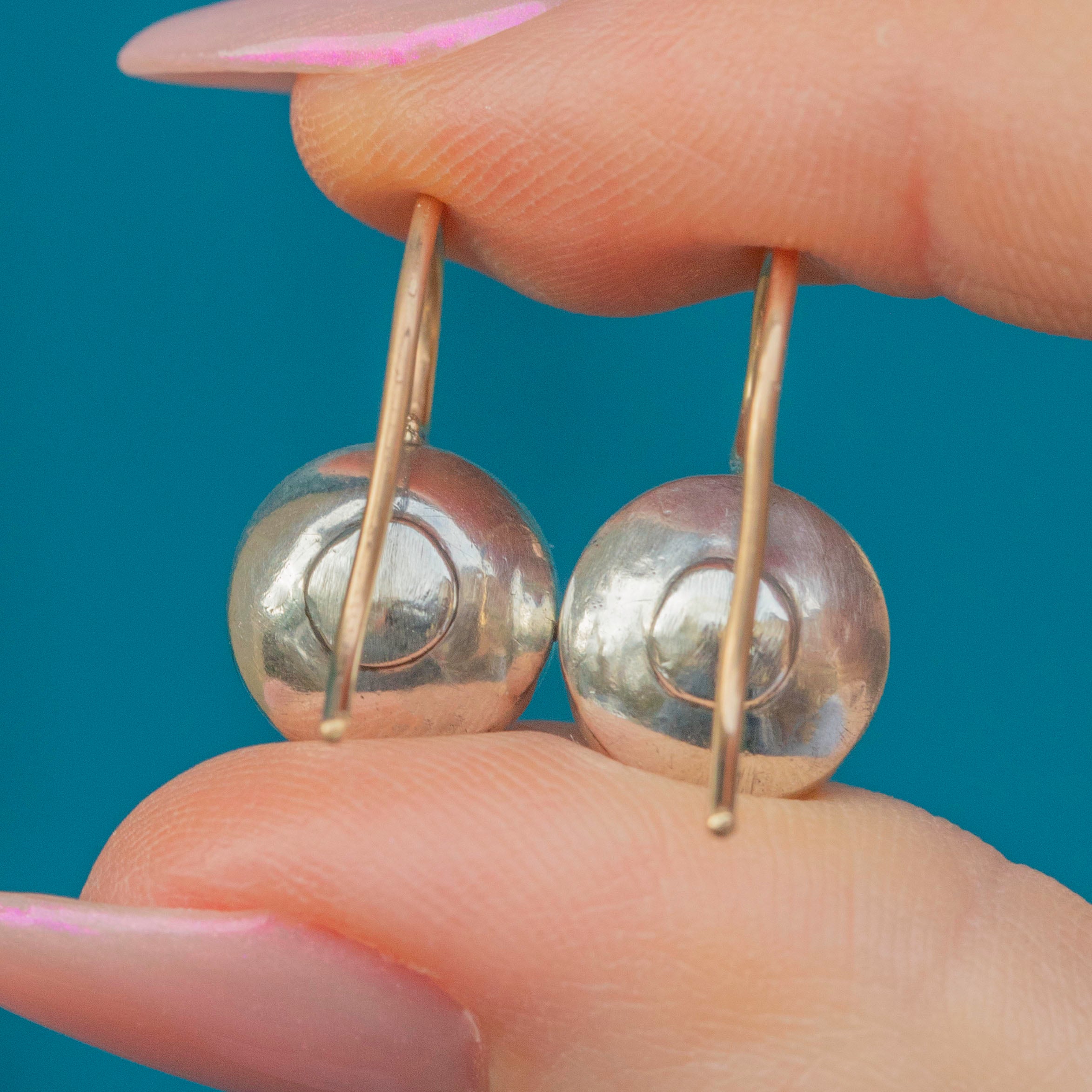 VERY GOOD-EXCELLENT. These  Georgian Black Dot Paste button earrings are in lovely condition, especially when considering their grand age! The Paste gems are bright and securely set within their piecrust settings, with their hand-painted black dots still visible. The Silver is bright with a light patina having accrued around the crimped settings creating a lovely contrast against the scintillating Paste. There are some light dings on the domed back settings, commensurate with age, which aren't noticeable during wear. The slender 9ct Gold hooks are securely soldered and are generous in size allowing for comfortable and secure wear!