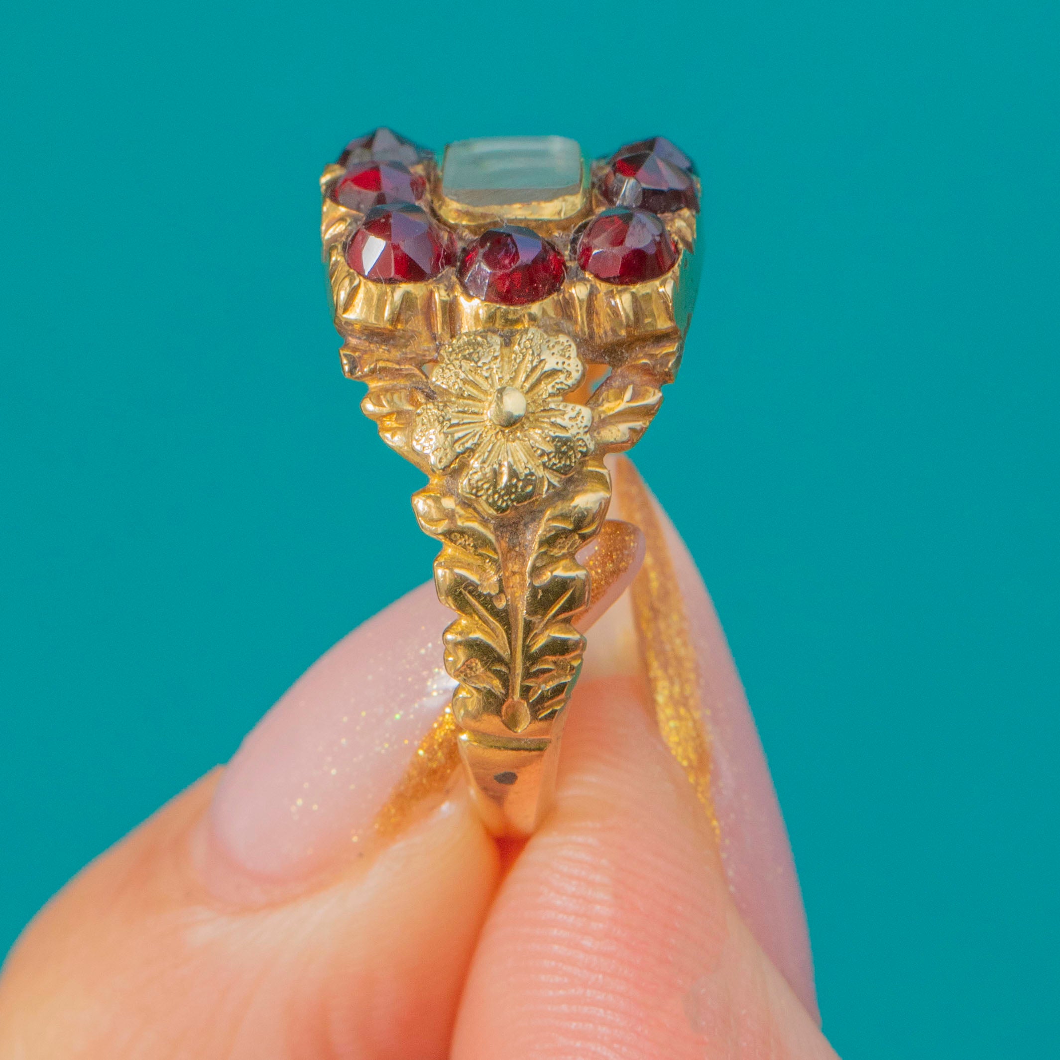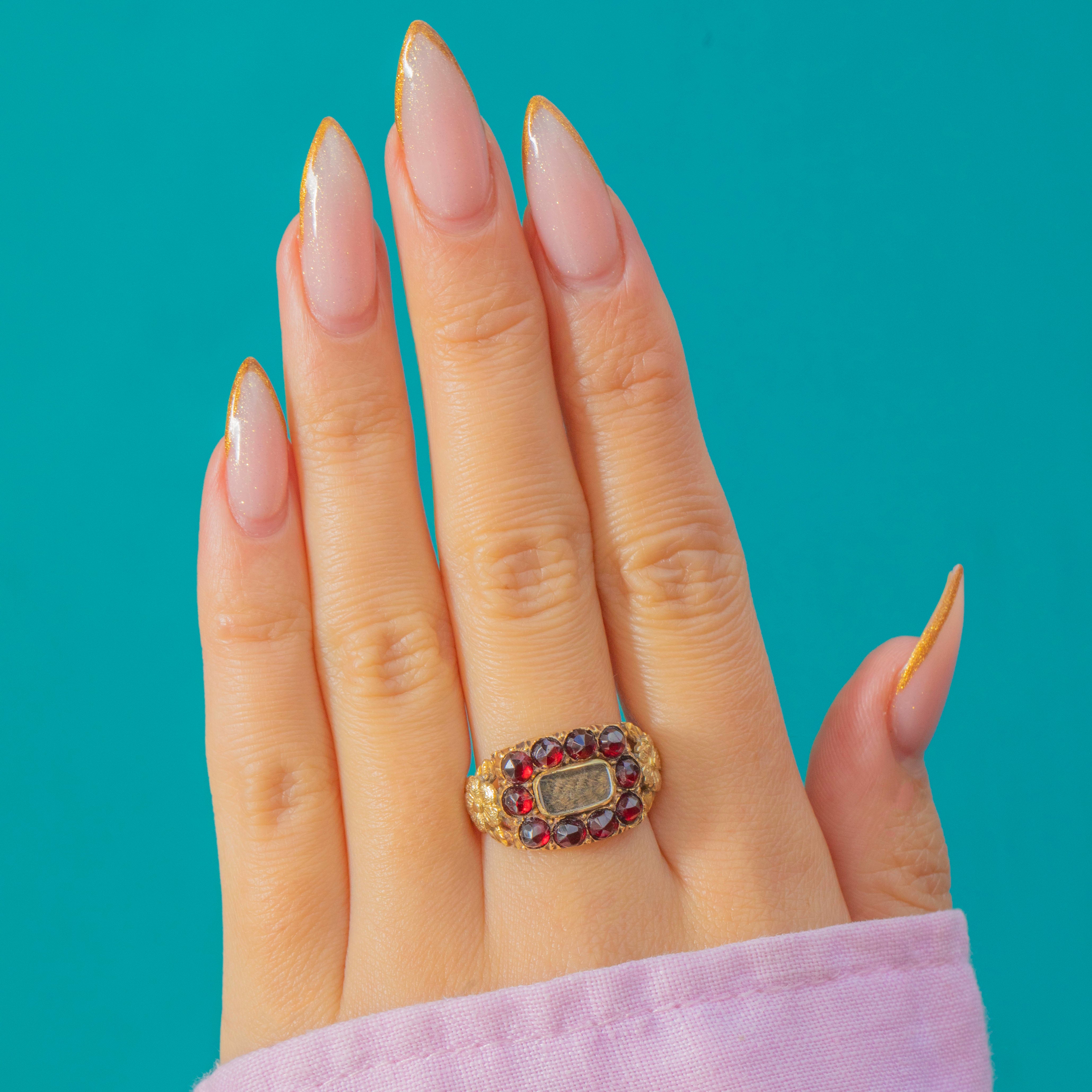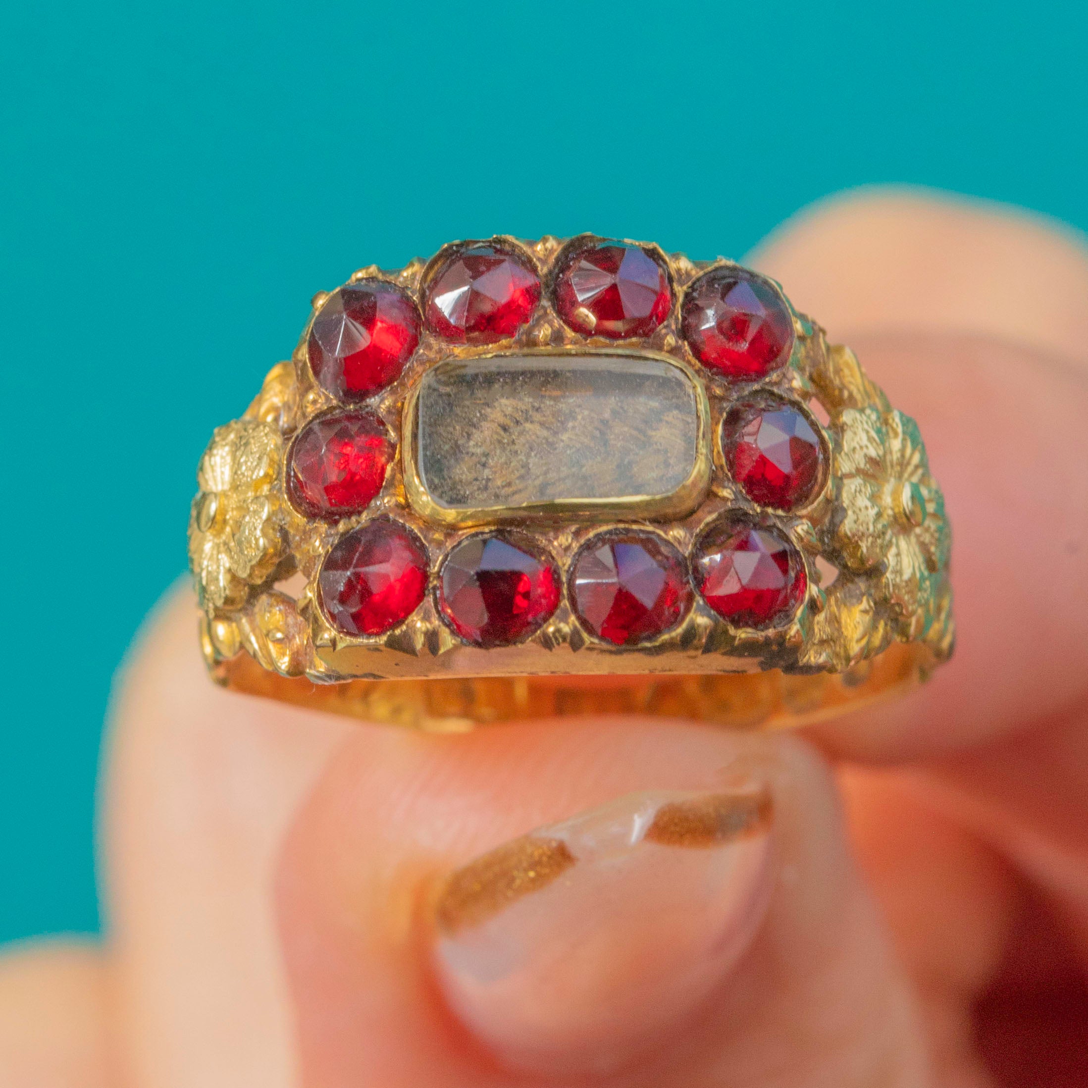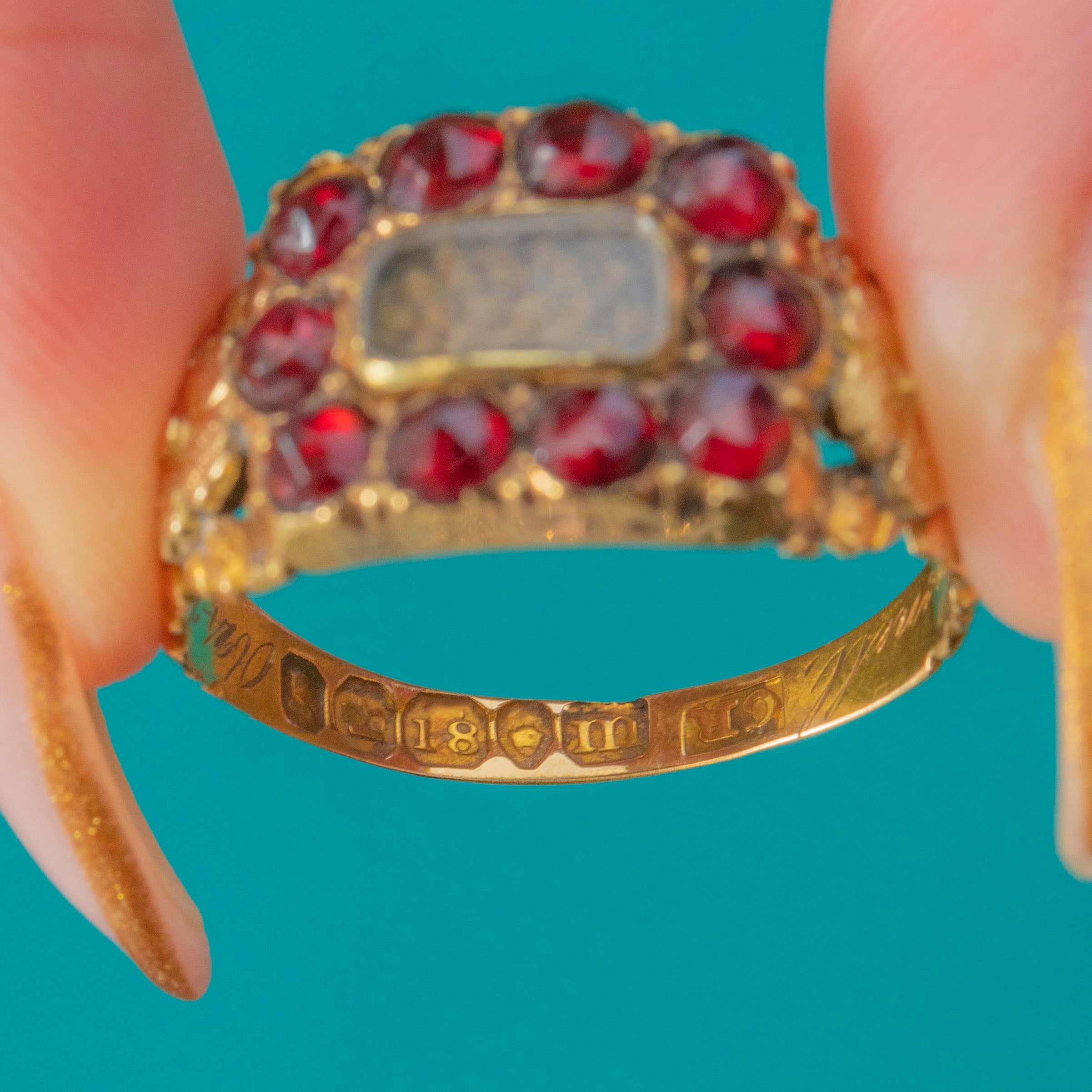 This remarkable Georgian mourning ring commemorates a married couple, Mrs Susannah Gosnell and Mr Sam Gosnell, who passed away just ten days apart in July 1827. Crafted in rich 18ct Gold, the ring is set with a deep red Garnet beneath a protective layer of Glass – a classic construction for high-status mourning jewellery of the period.